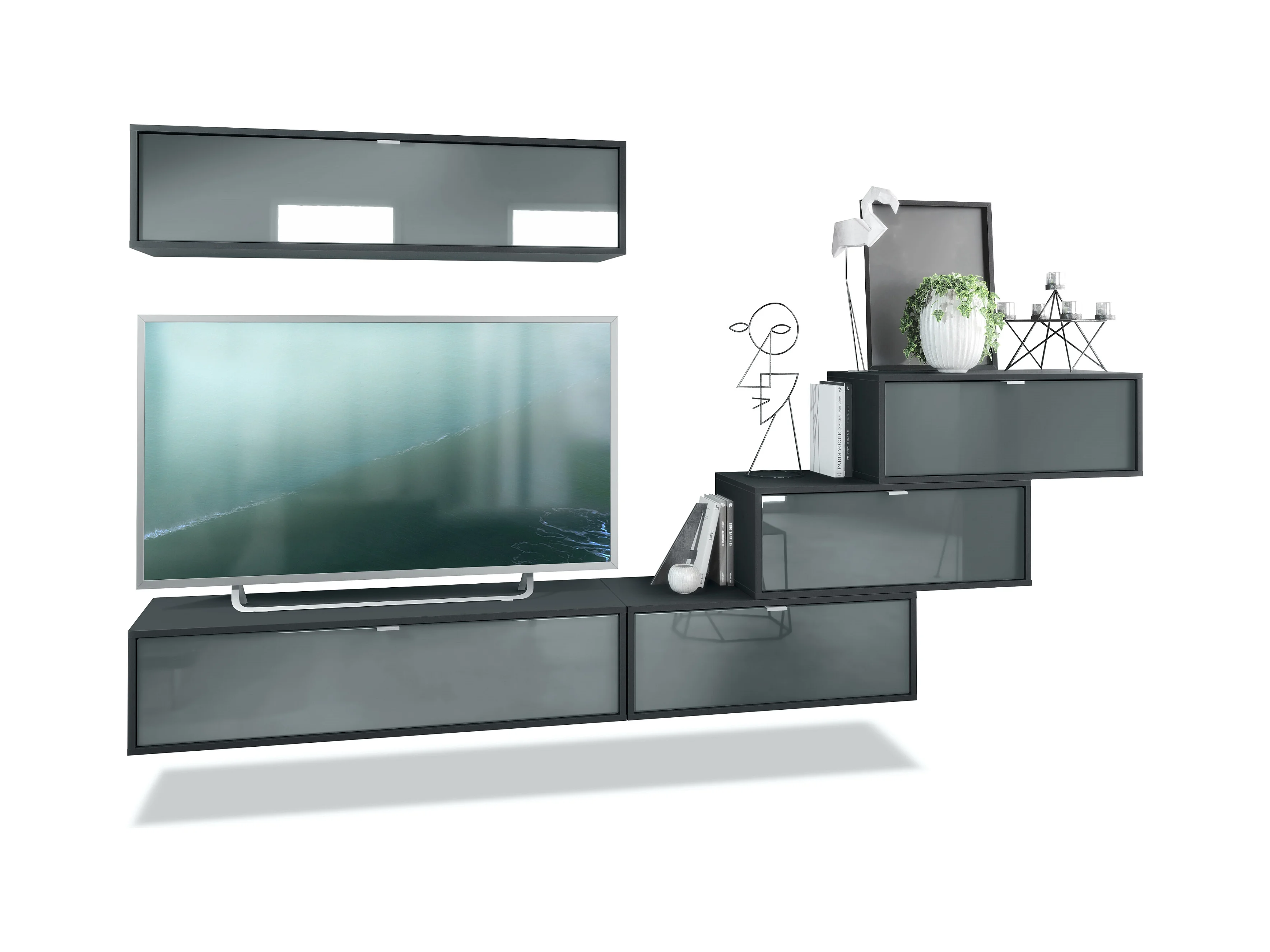 Unité murale Lana V1 composée de 5 unités murales à 12 compartiments, caisson en Noir mat, façades en Gris haute brillance | Grand choix de couleurs