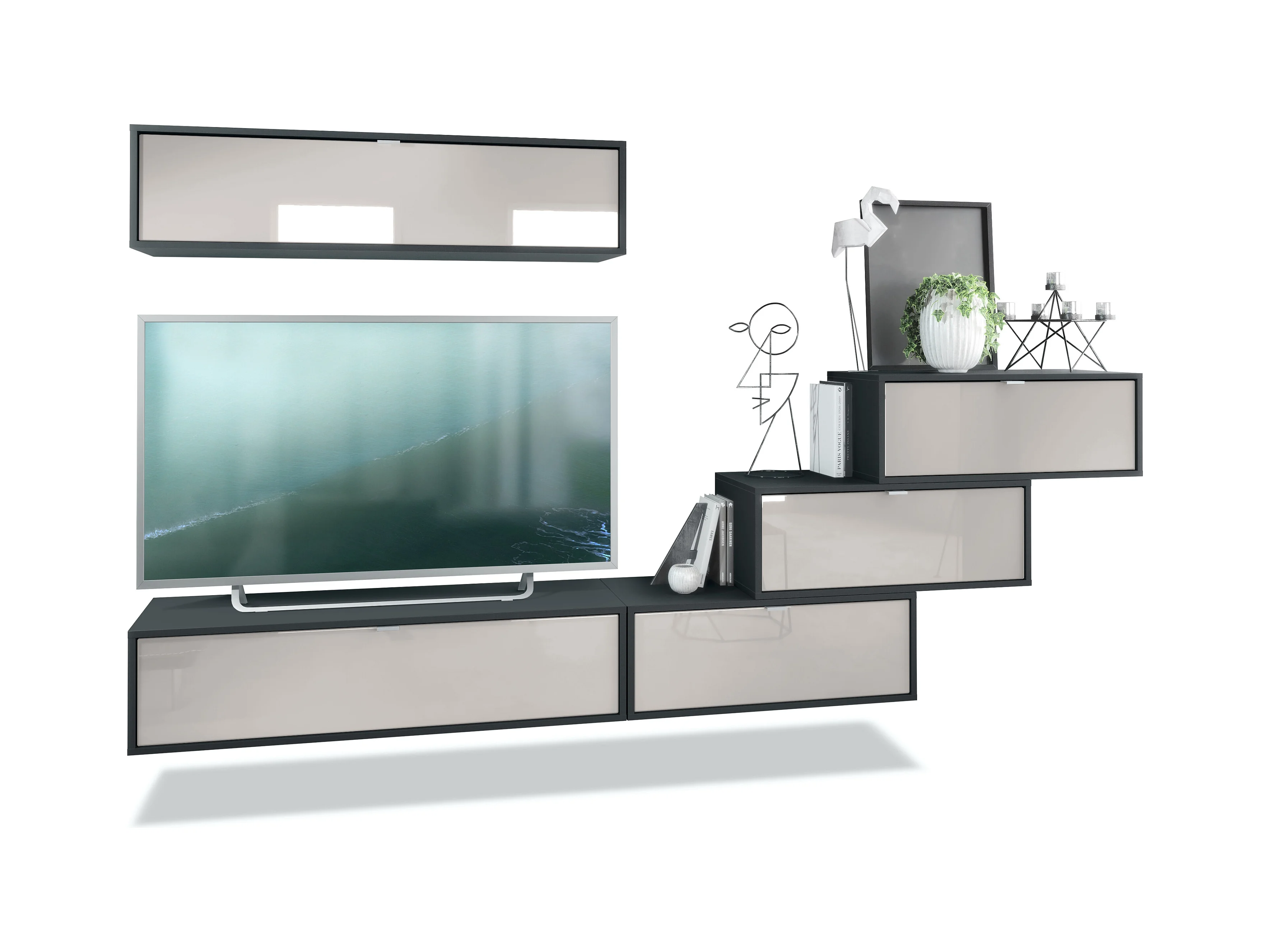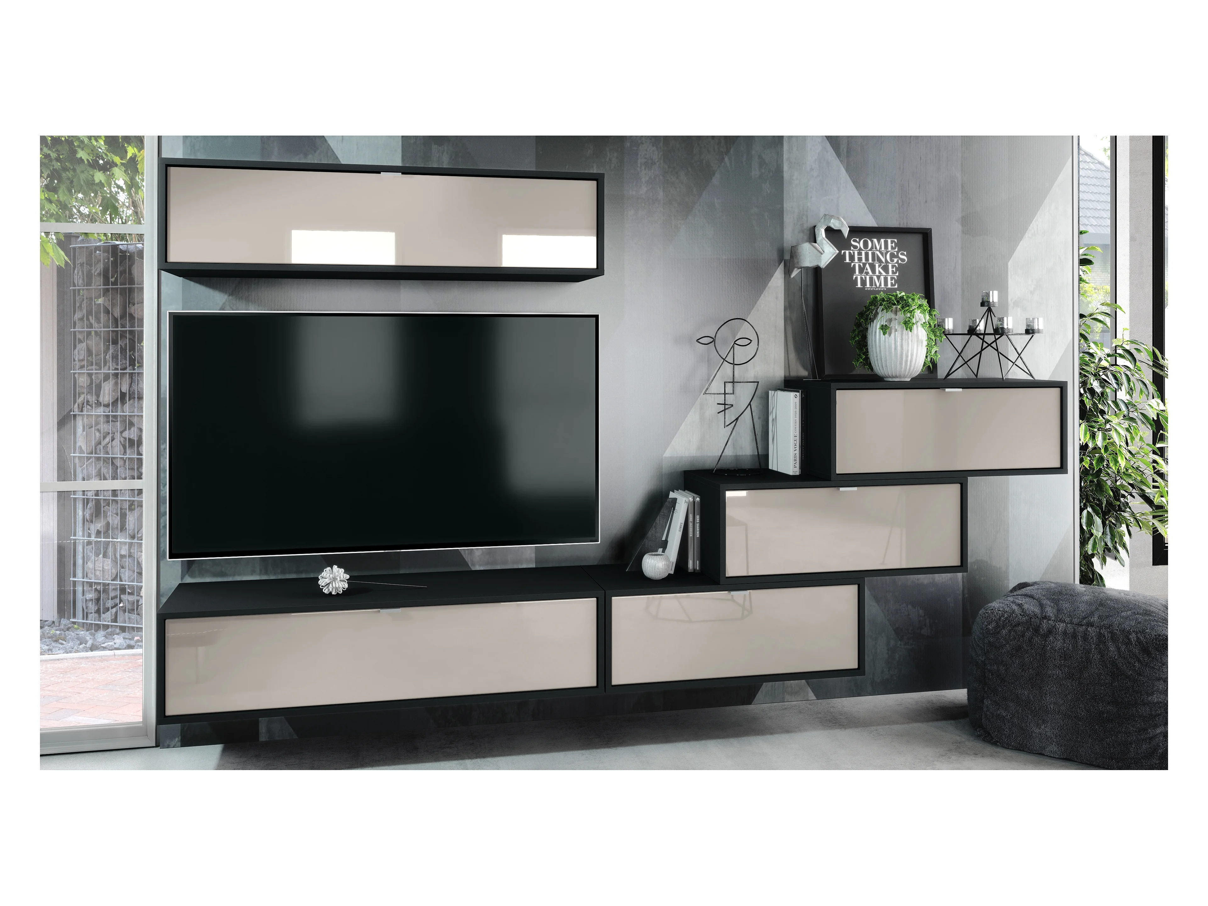 Unité murale Lana V1 composée de 5 unités murales à 12 compartiments, caisson en Noir mat, façades en Gris sable haute brillance | Grand choix de couleurs