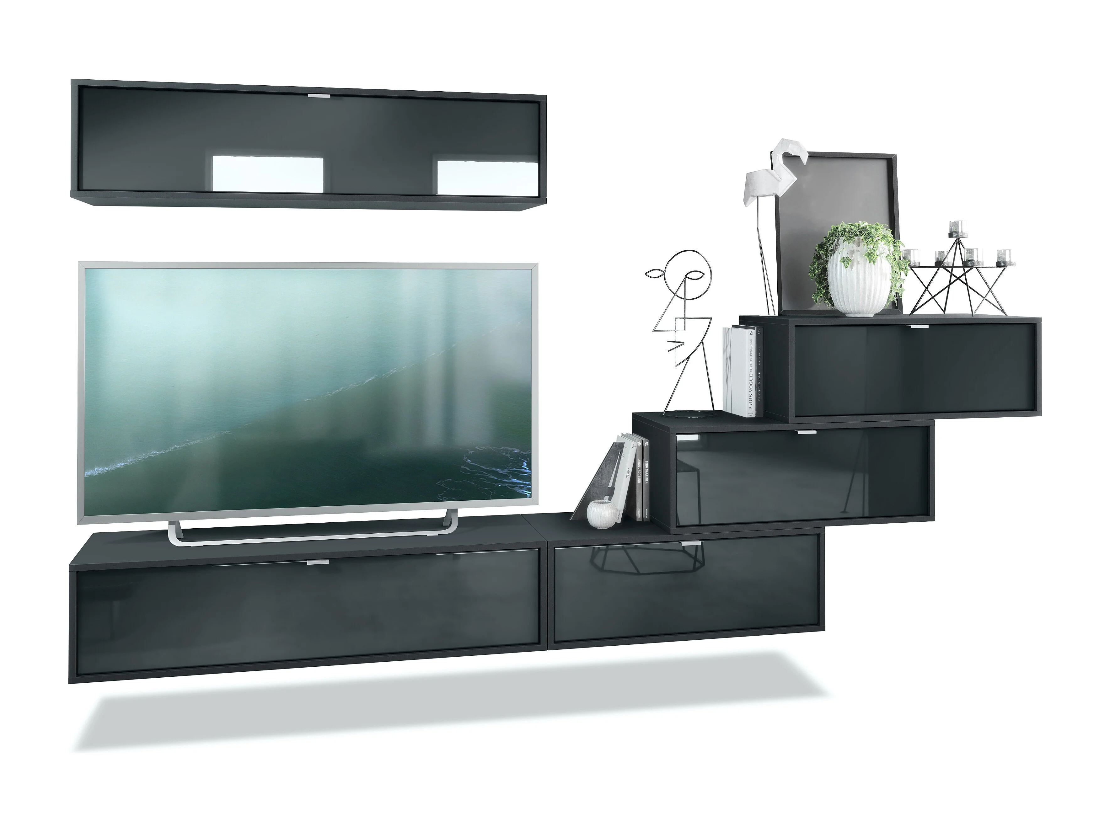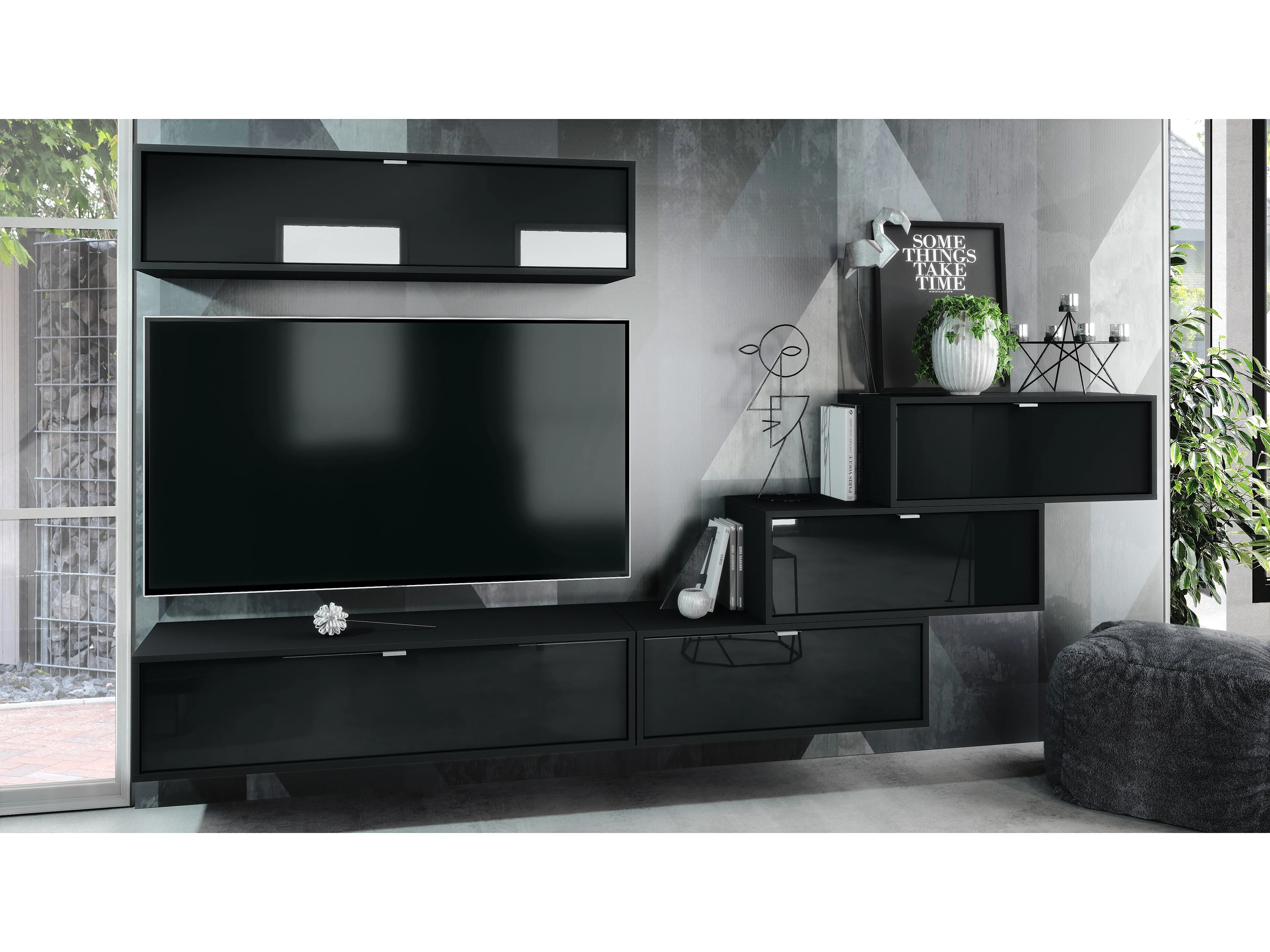 Unité murale Lana V1 composée de 5 unités murales à 12 compartiments, caisson en Noir mat, façades en Noir haute brillance | Grand choix de couleurs