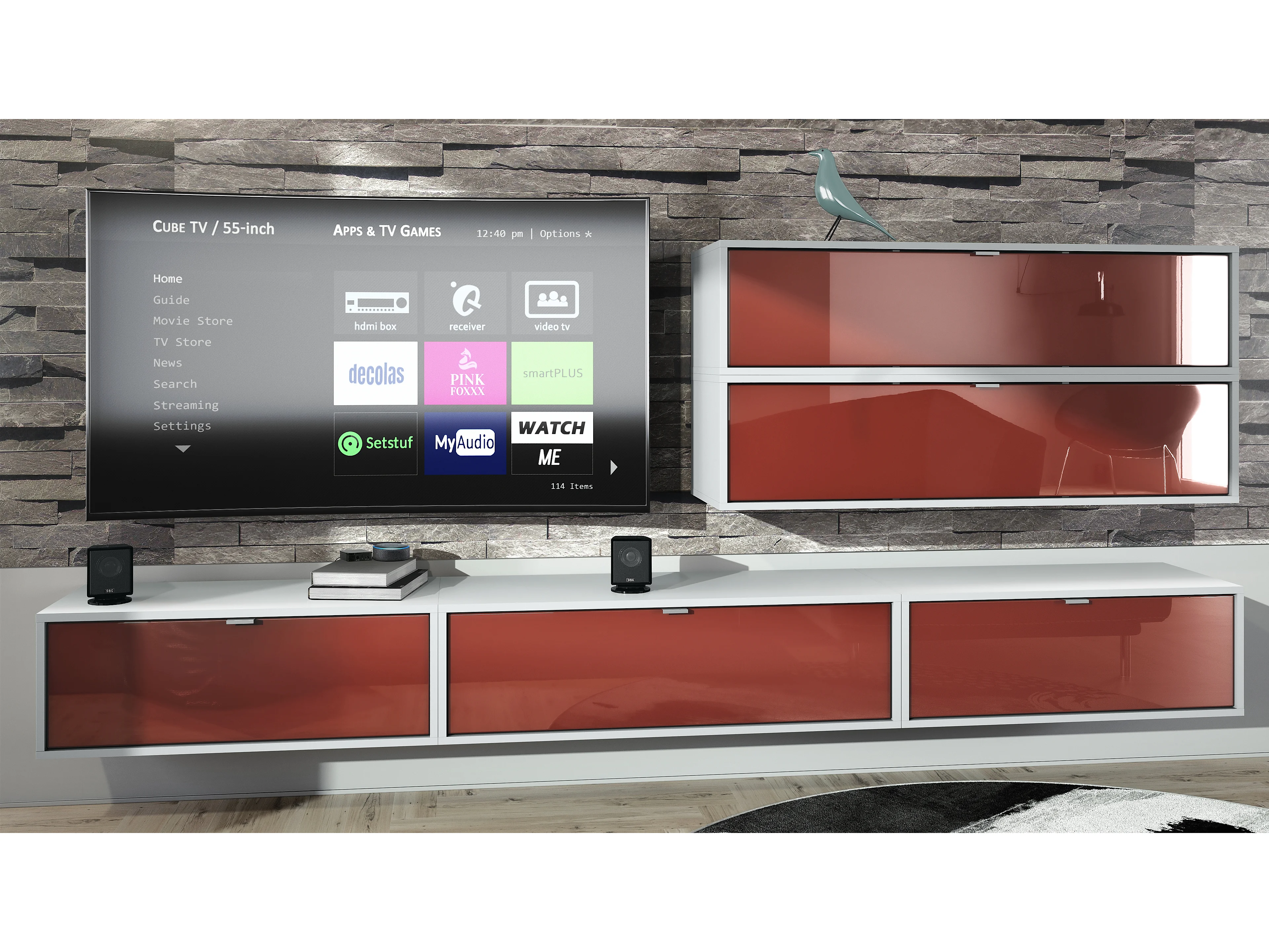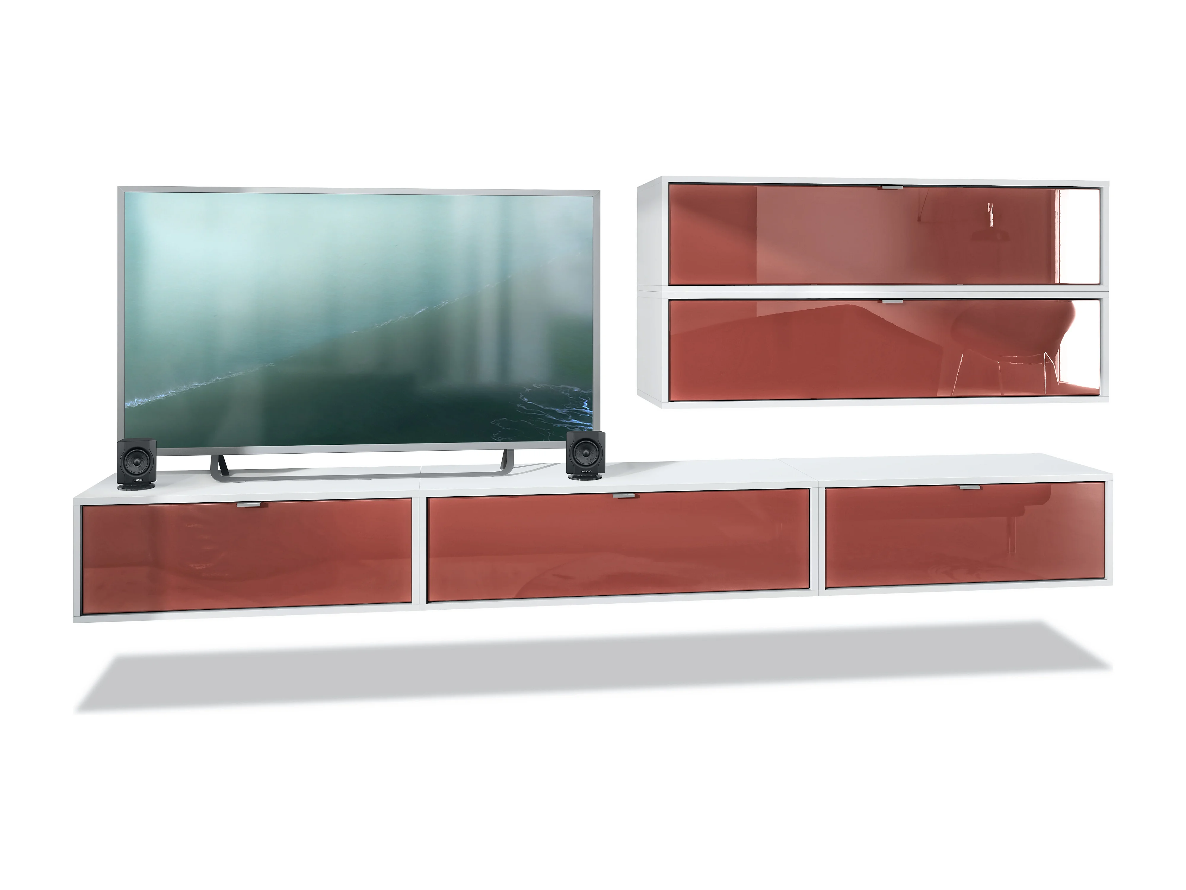 Unité murale Lana V2 composée de 5 unités murales à 12 compartiments, caisson en Blanc mat, façades en Bordeaux haute brillance