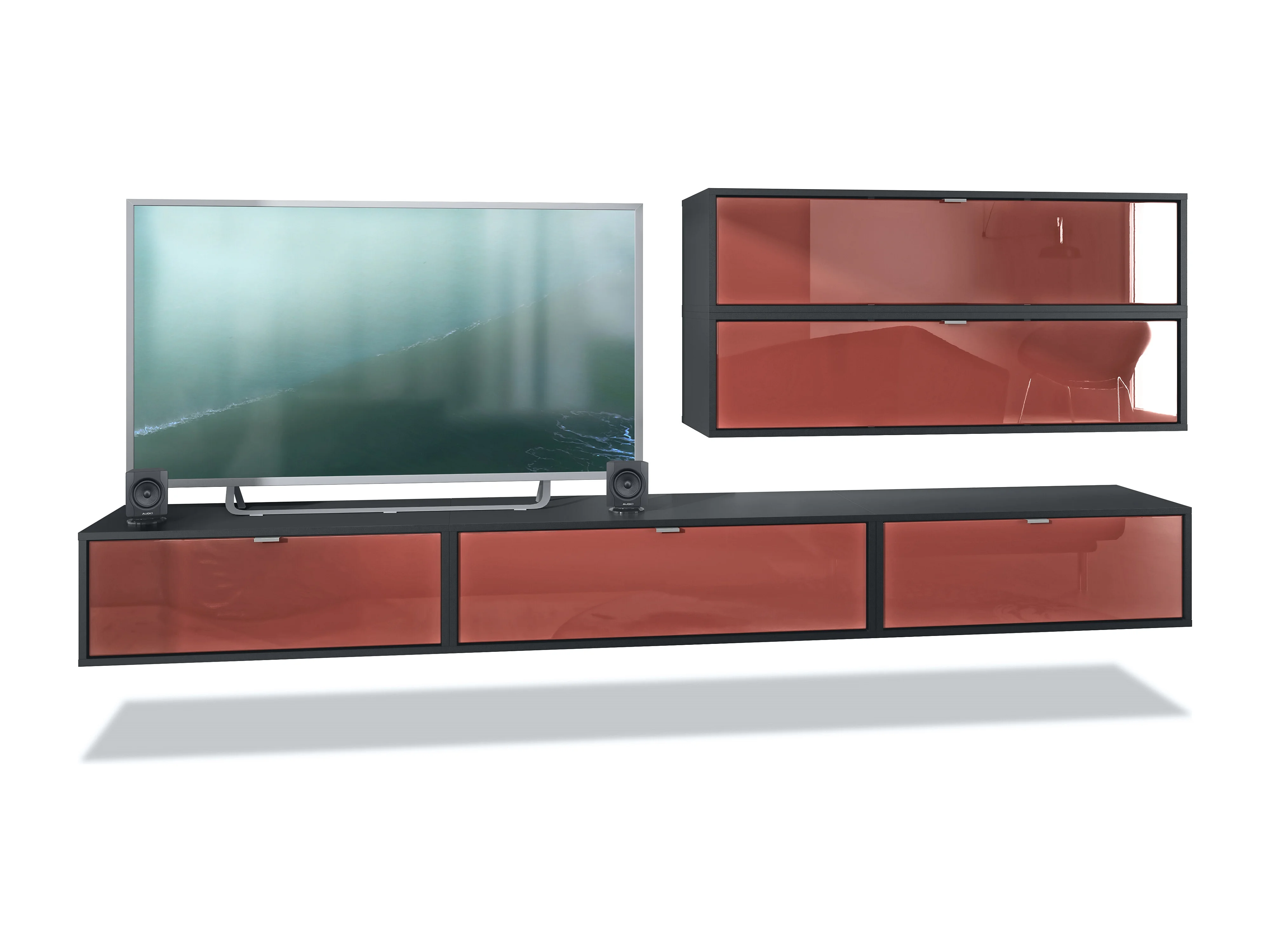 Unité murale Lana V2 composée de 5 unités murales à 12 compartiments, caisson en Noir mat, façades en Bordeaux haute brillance