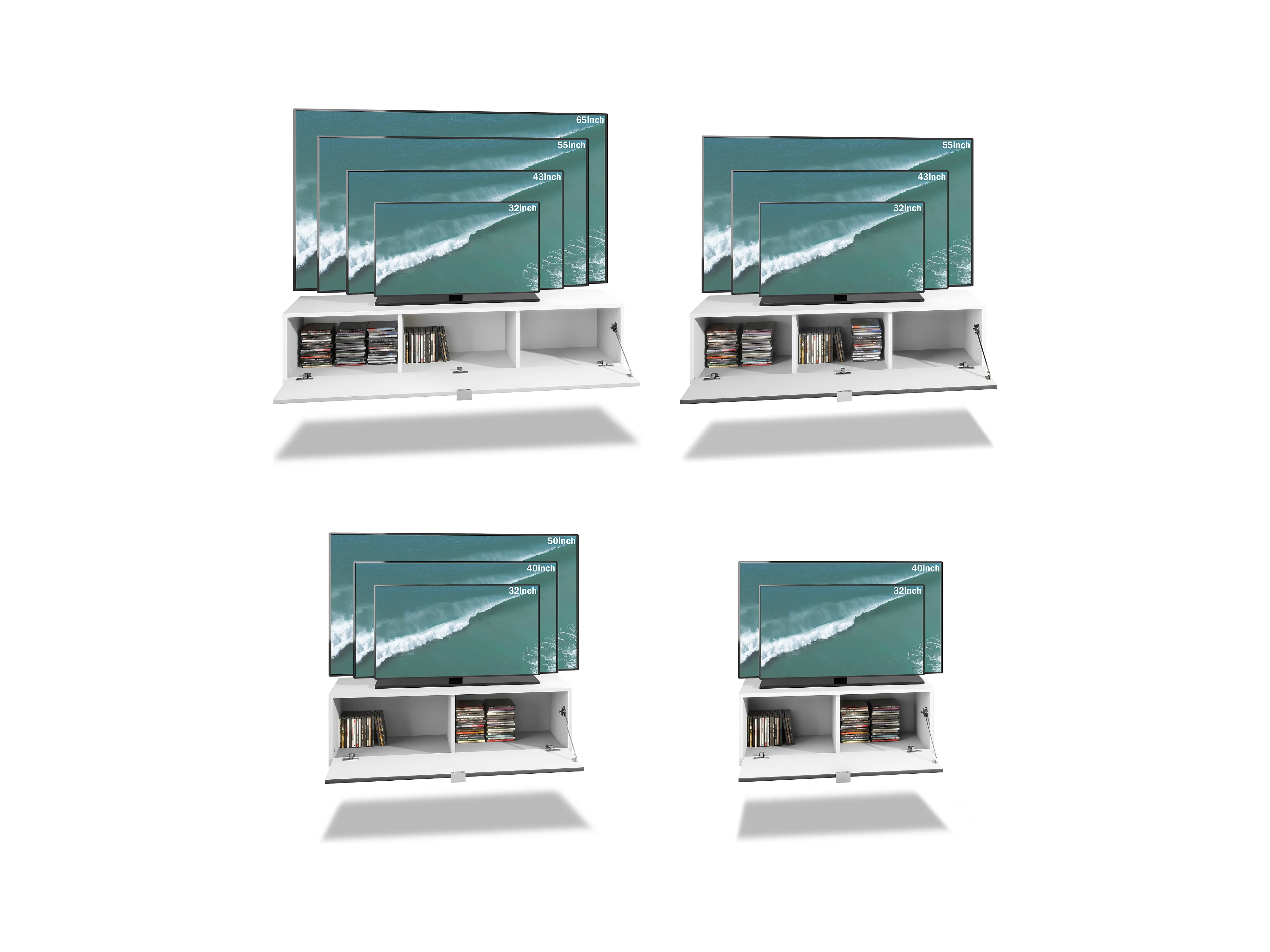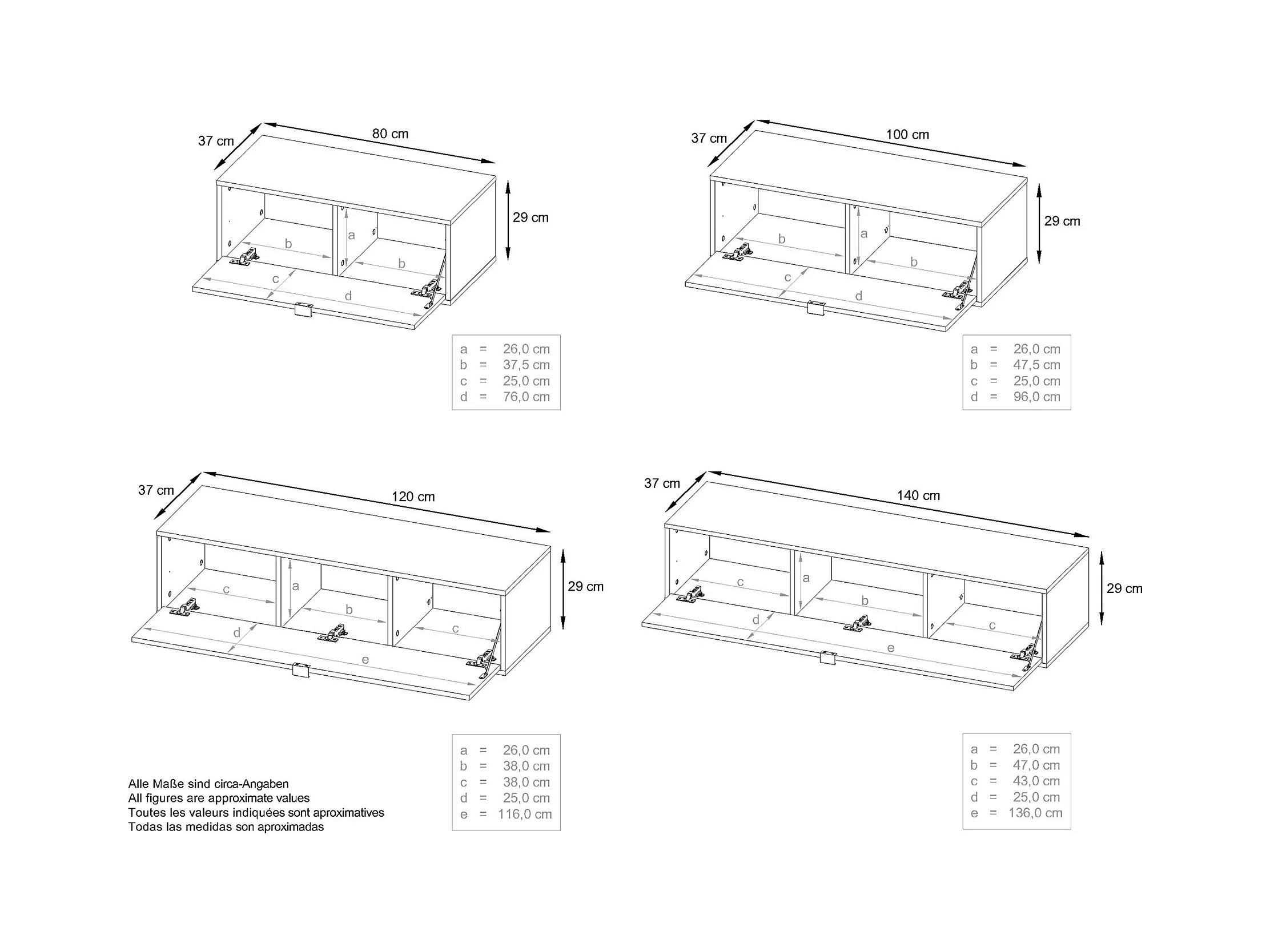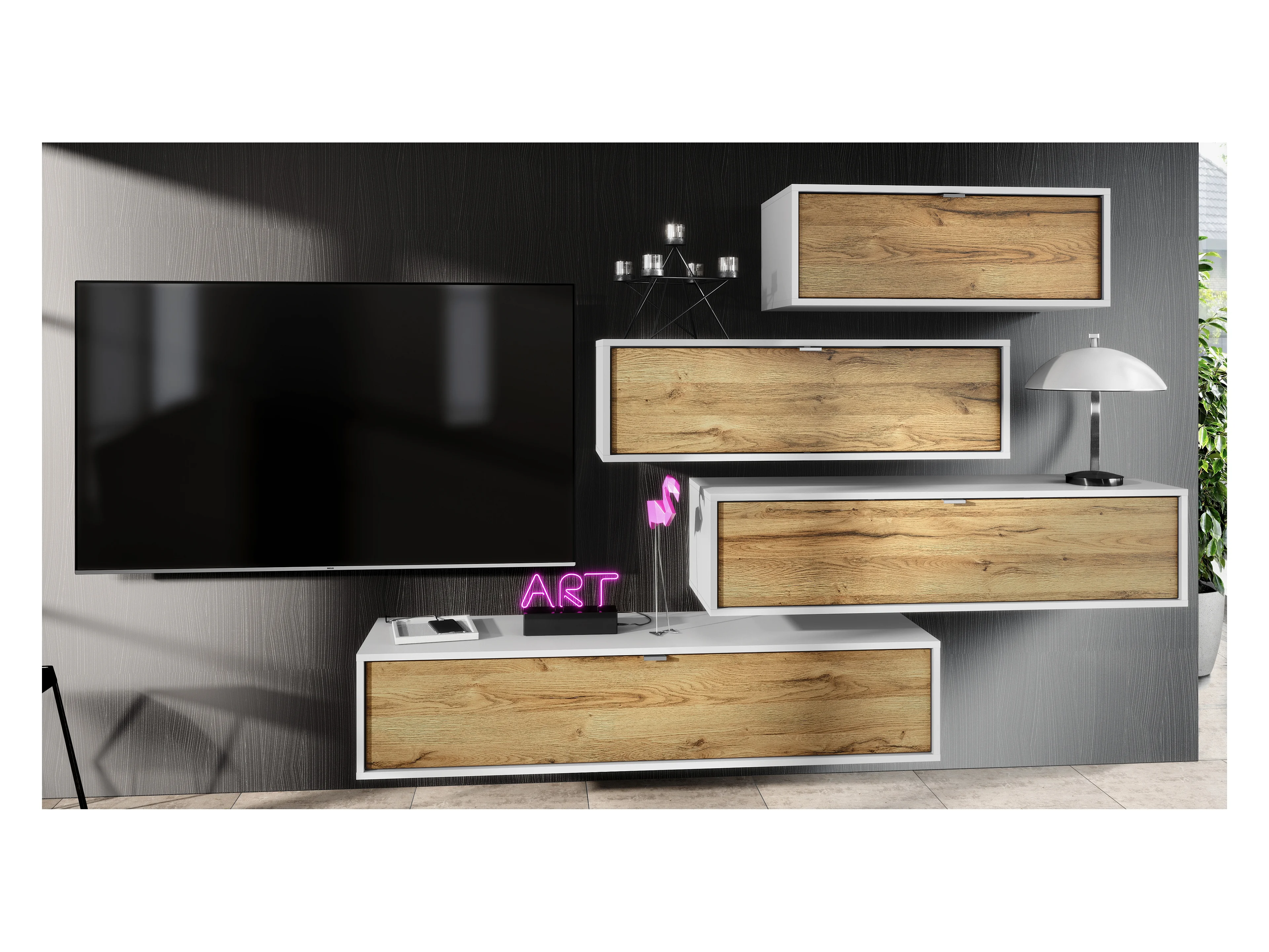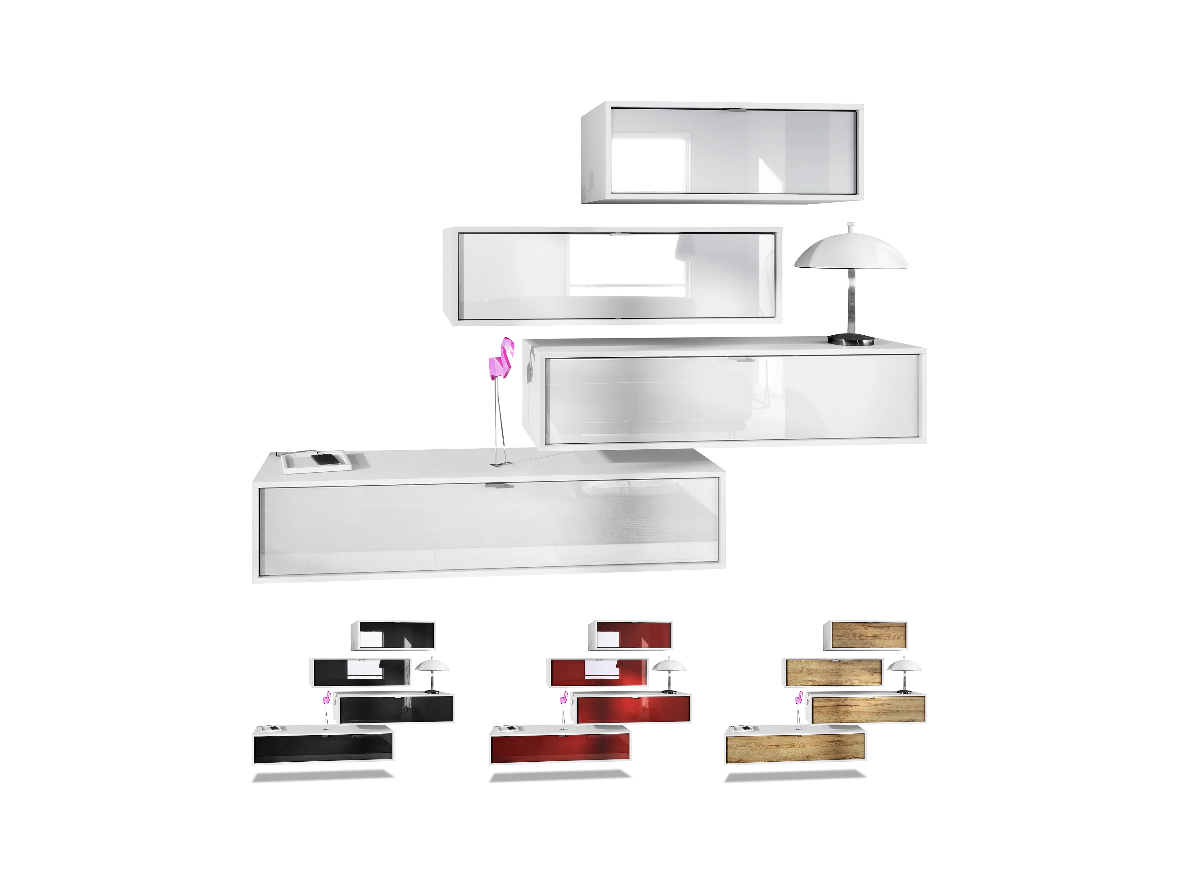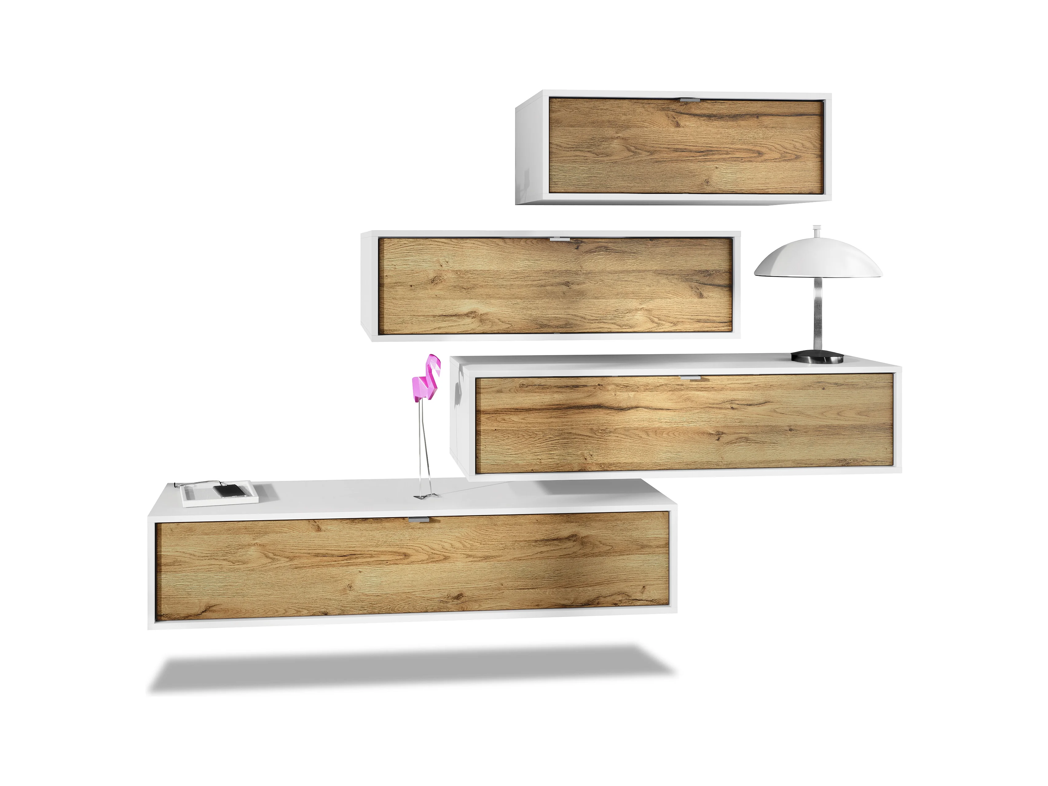Unité murale Lana V3 composée de 4 unités murales à 10 compartiments, caisson en Blanc mat, façades en Chêne Nature
