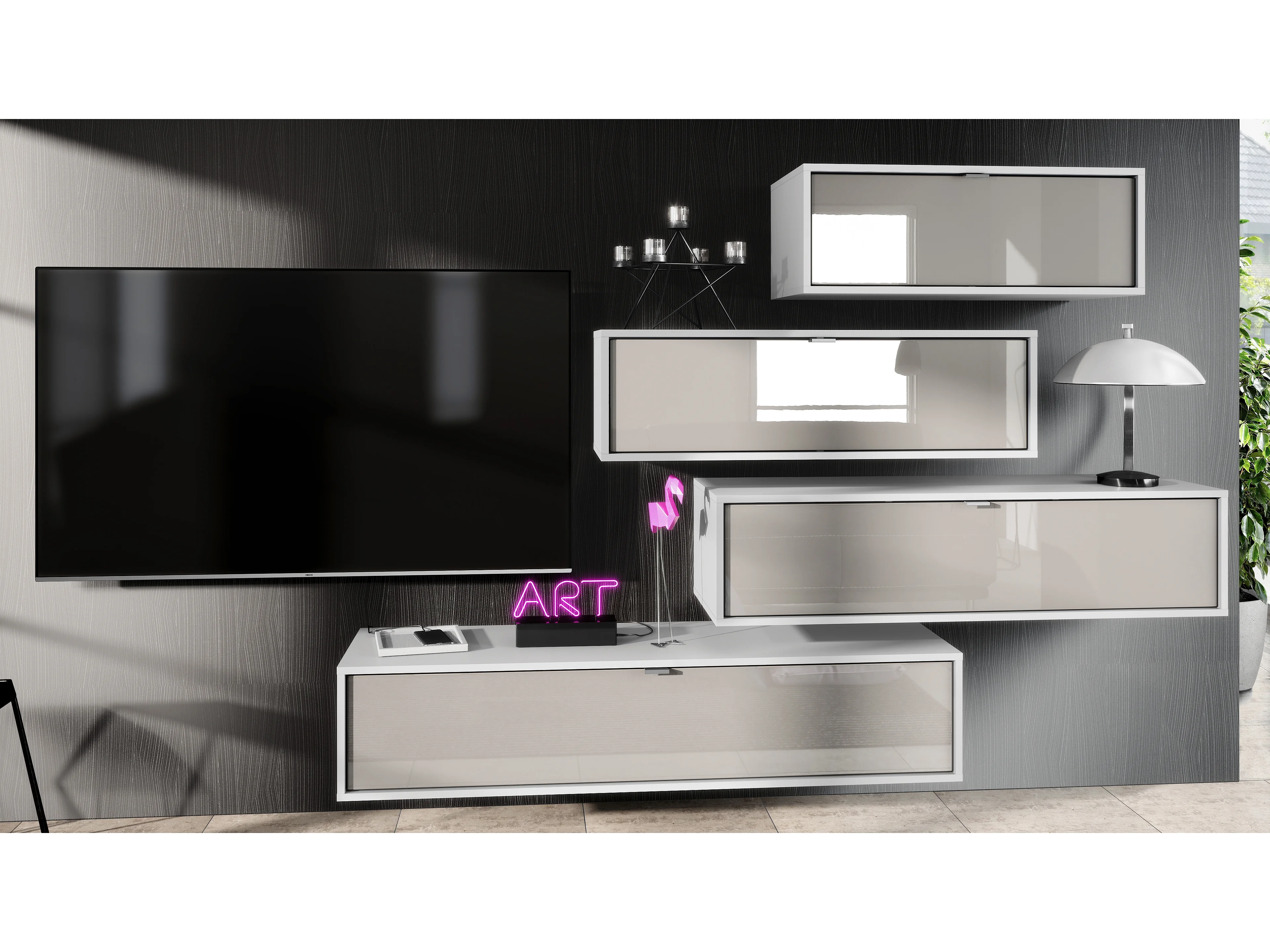 Unité murale Lana V3 composée de 4 unités murales à 10 compartiments, caisson en Blanc mat, façades en Gris sable haute brillance