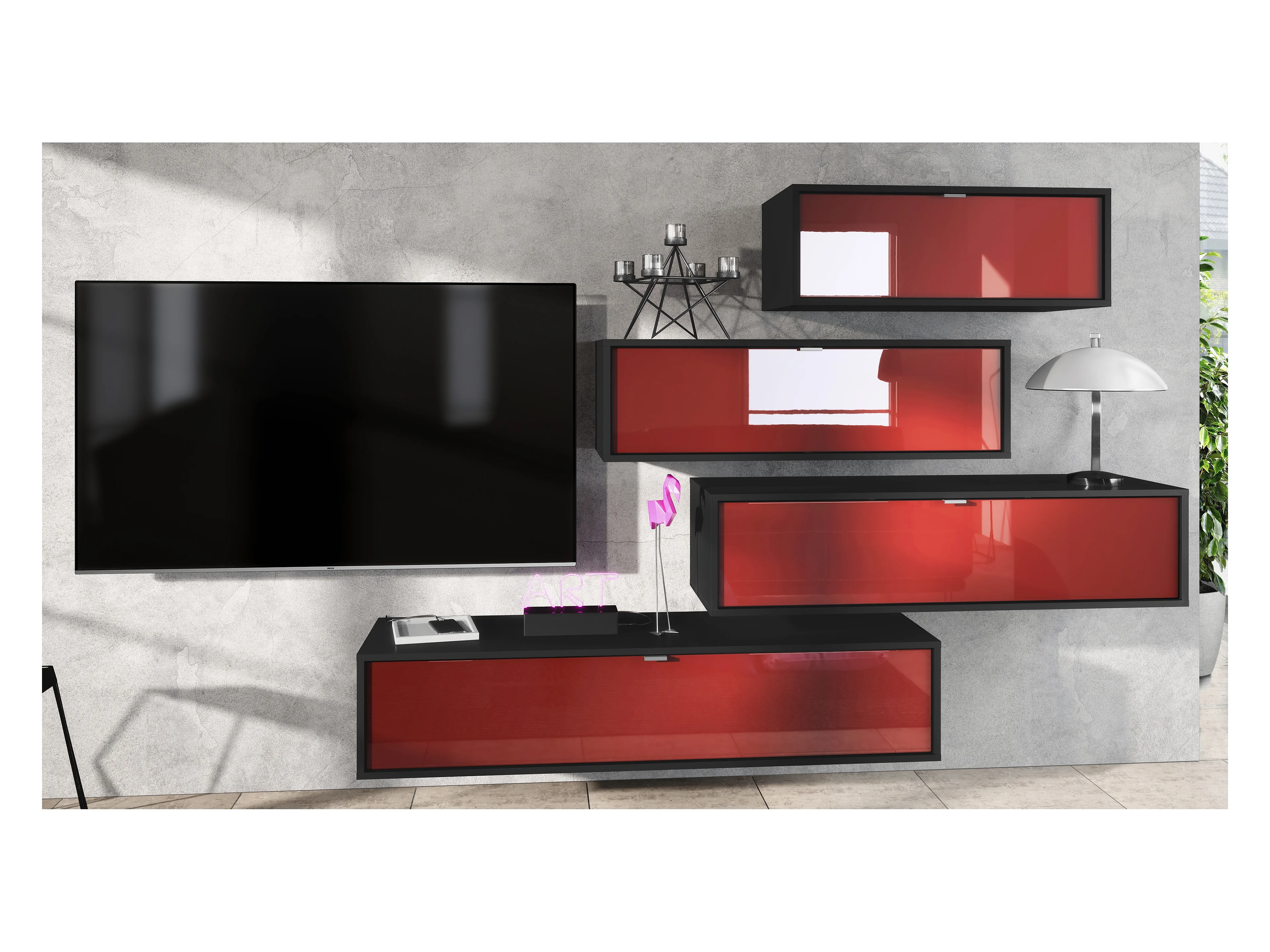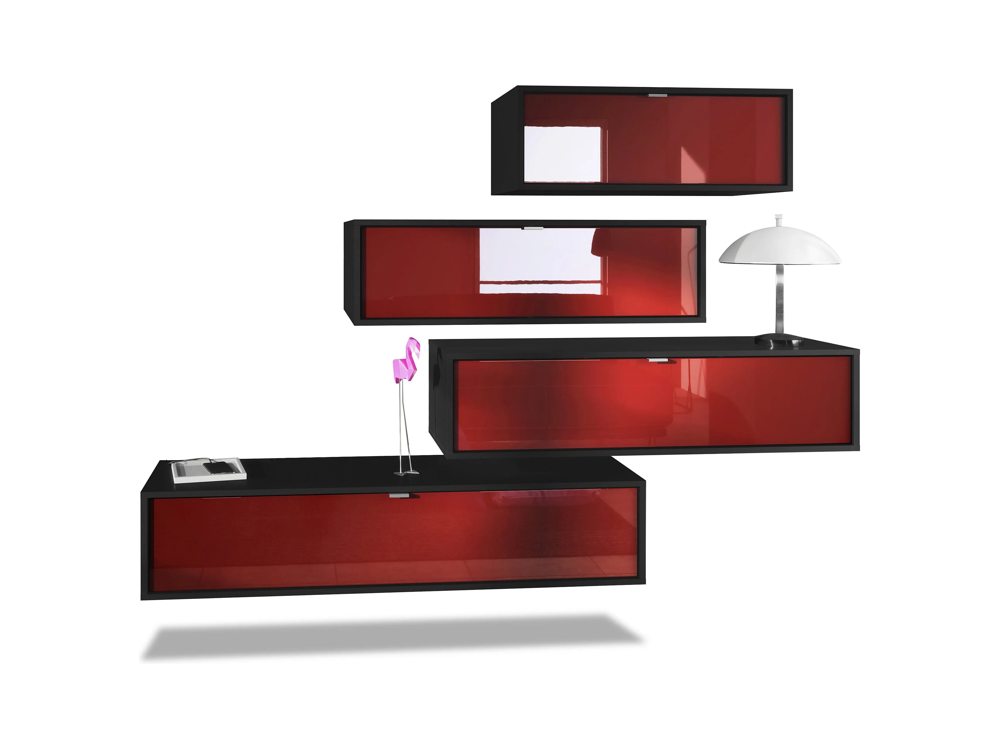 Unité murale Lana V3 composée de 4 unités murales à 10 compartiments, caisson en Noir mat, façades en Bordeaux haute brillance