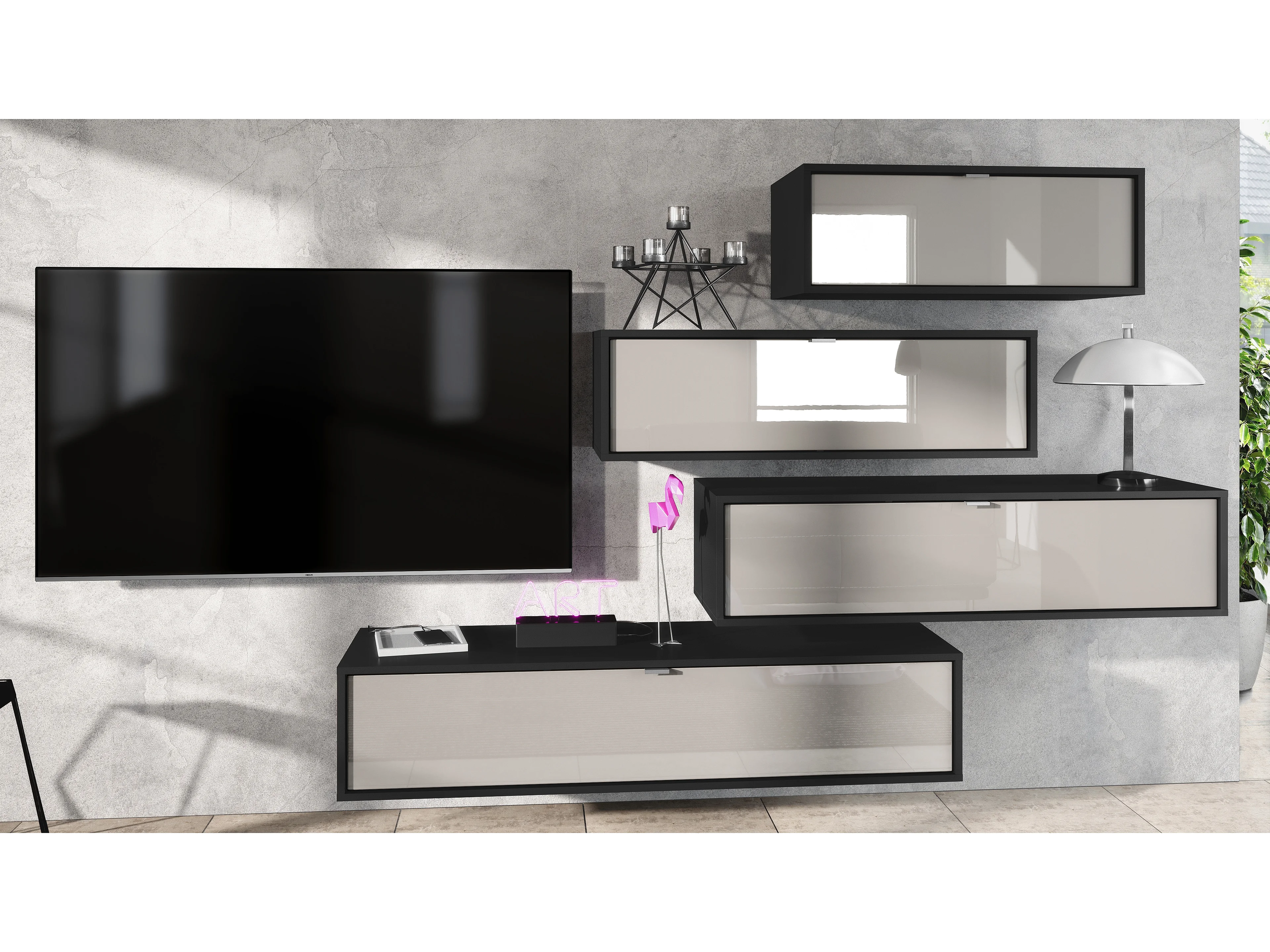 Unité murale Lana V3 composée de 4 unités murales à 10 compartiments, caisson en Noir mat, façades en Gris sable haute brillance