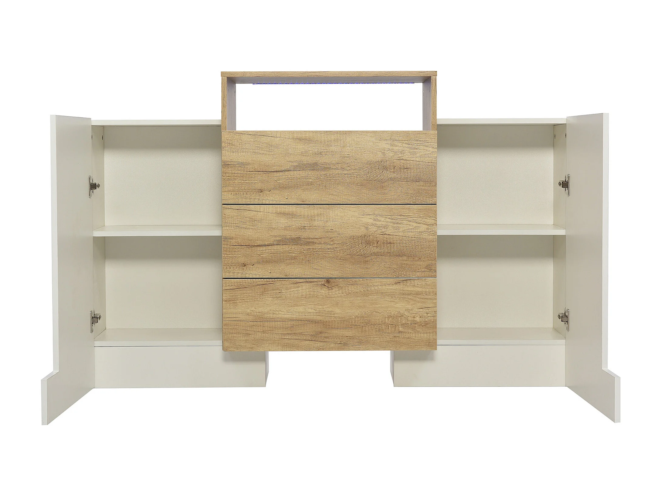 URBAN MEUBLE Buffet moderne blanc brillant et effet bois 2 portes, niche, 3 tiroirs avec éclairage