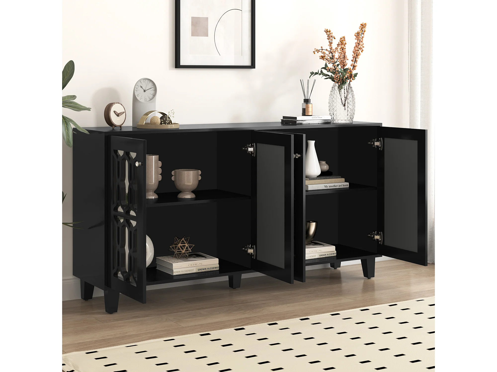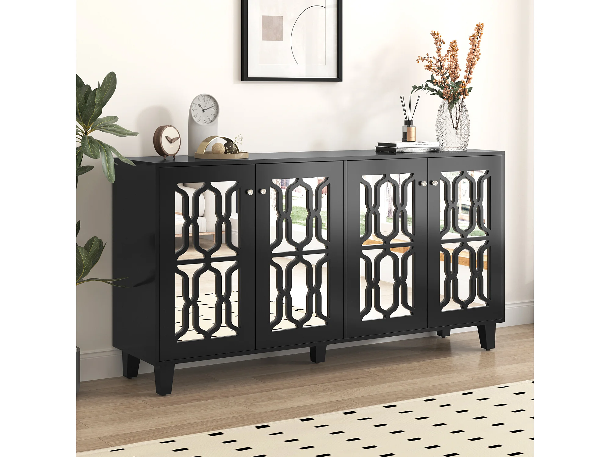URBAN MEUBLE Buffet noir design 4 portes miroir motif géométrique et poignées en cristal froid 160*40*84cm