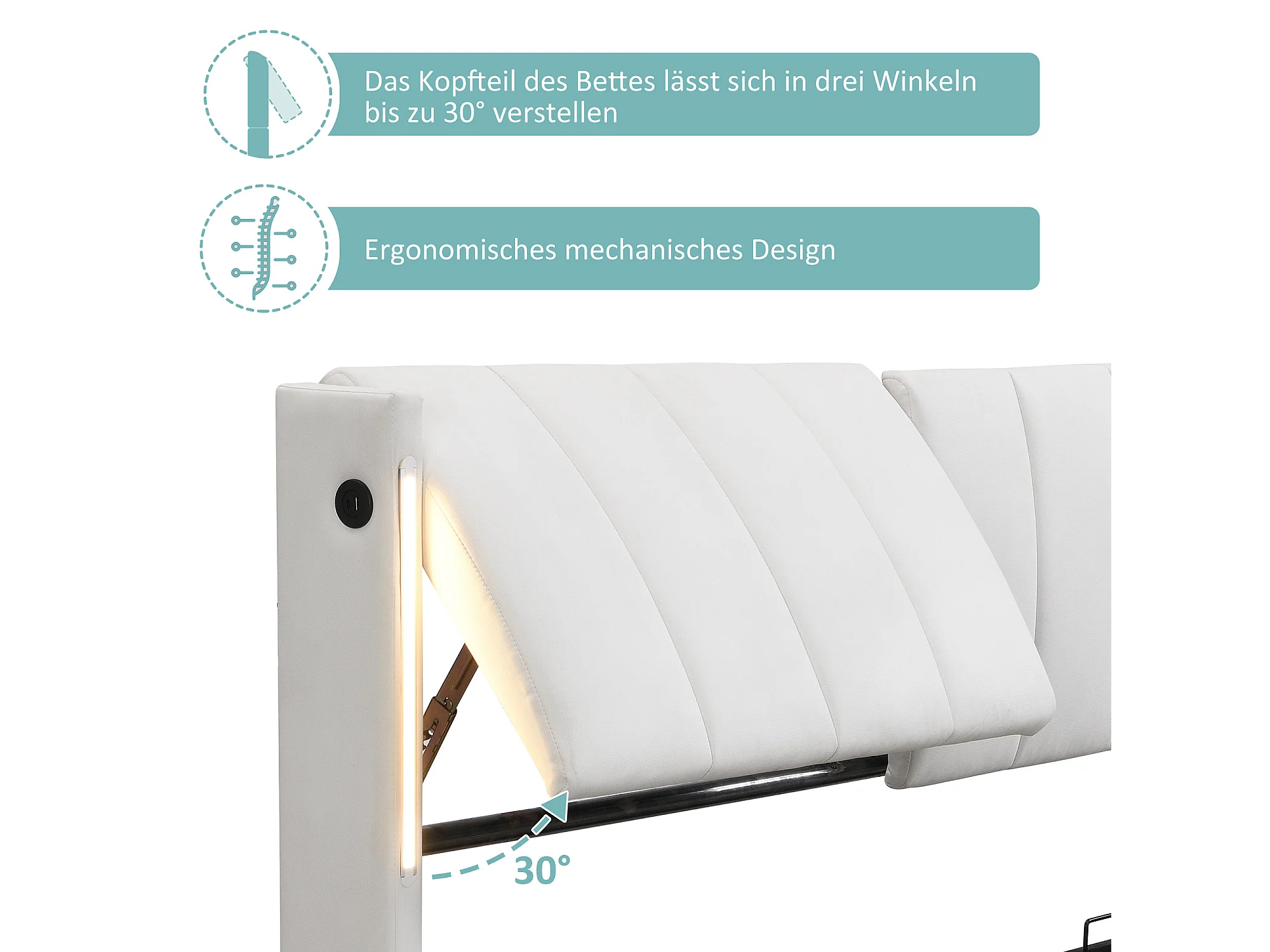 URBAN MEUBLE Lit coffre double PU blanc avec éclairage LED, USB et tête de lit réglable (160x200 cm)