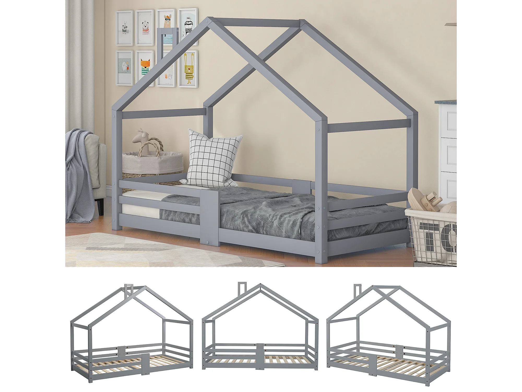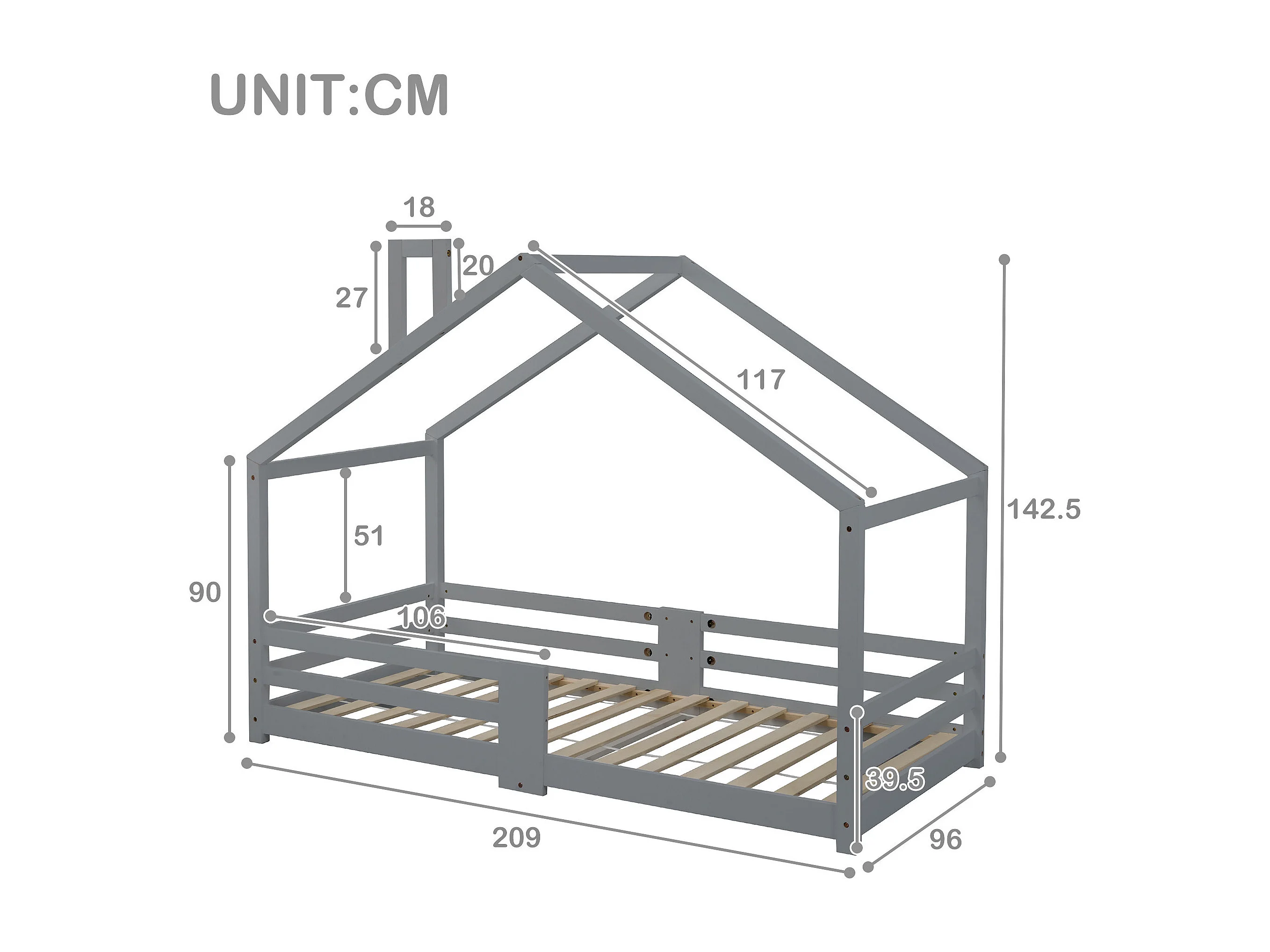 URBAN MEUBLE Lit enfant lit cabane avec cheminée sommier à lattes robuste lit cabane en bois de pin gris, 90 x 200 cm sans matelas