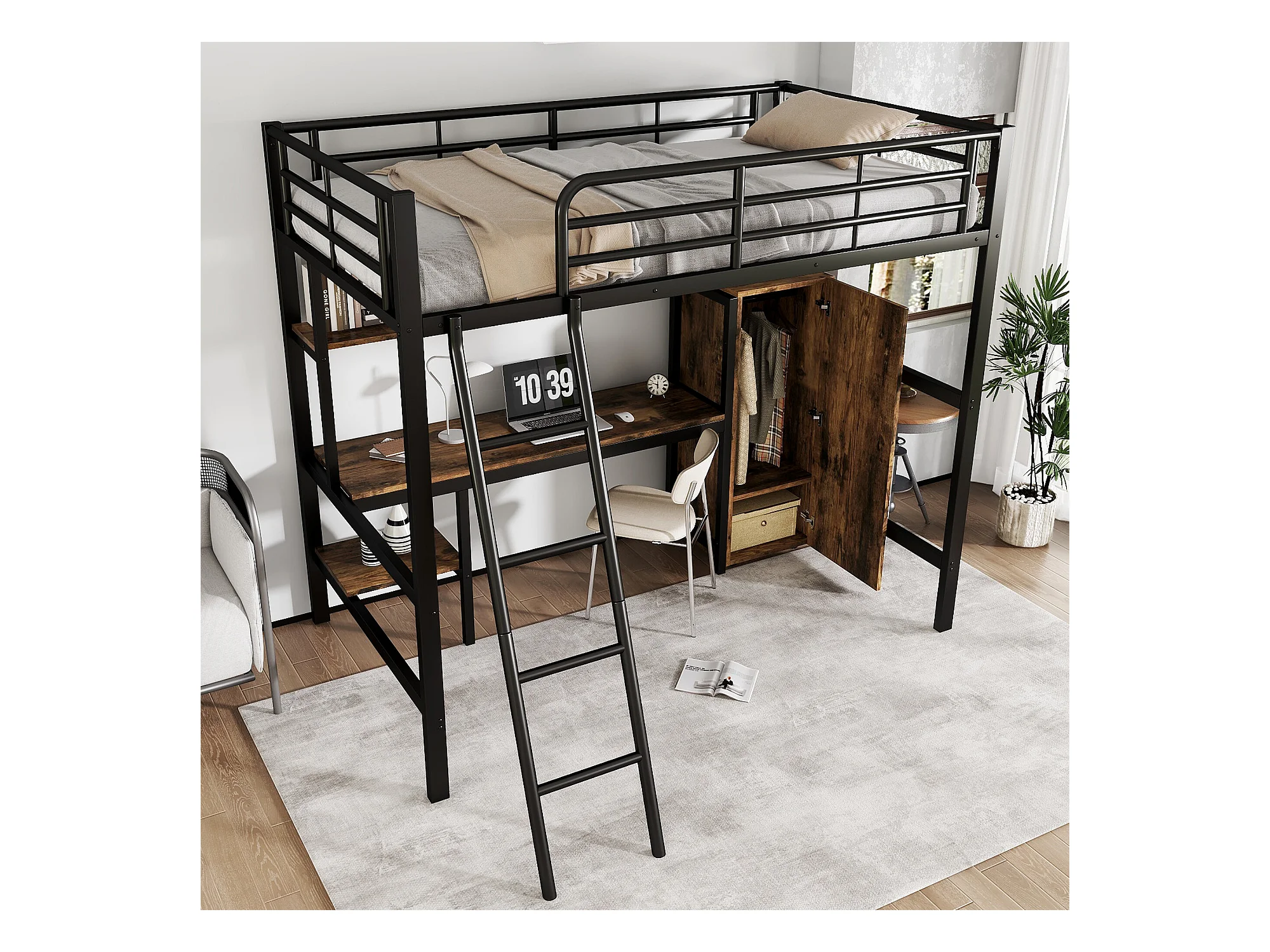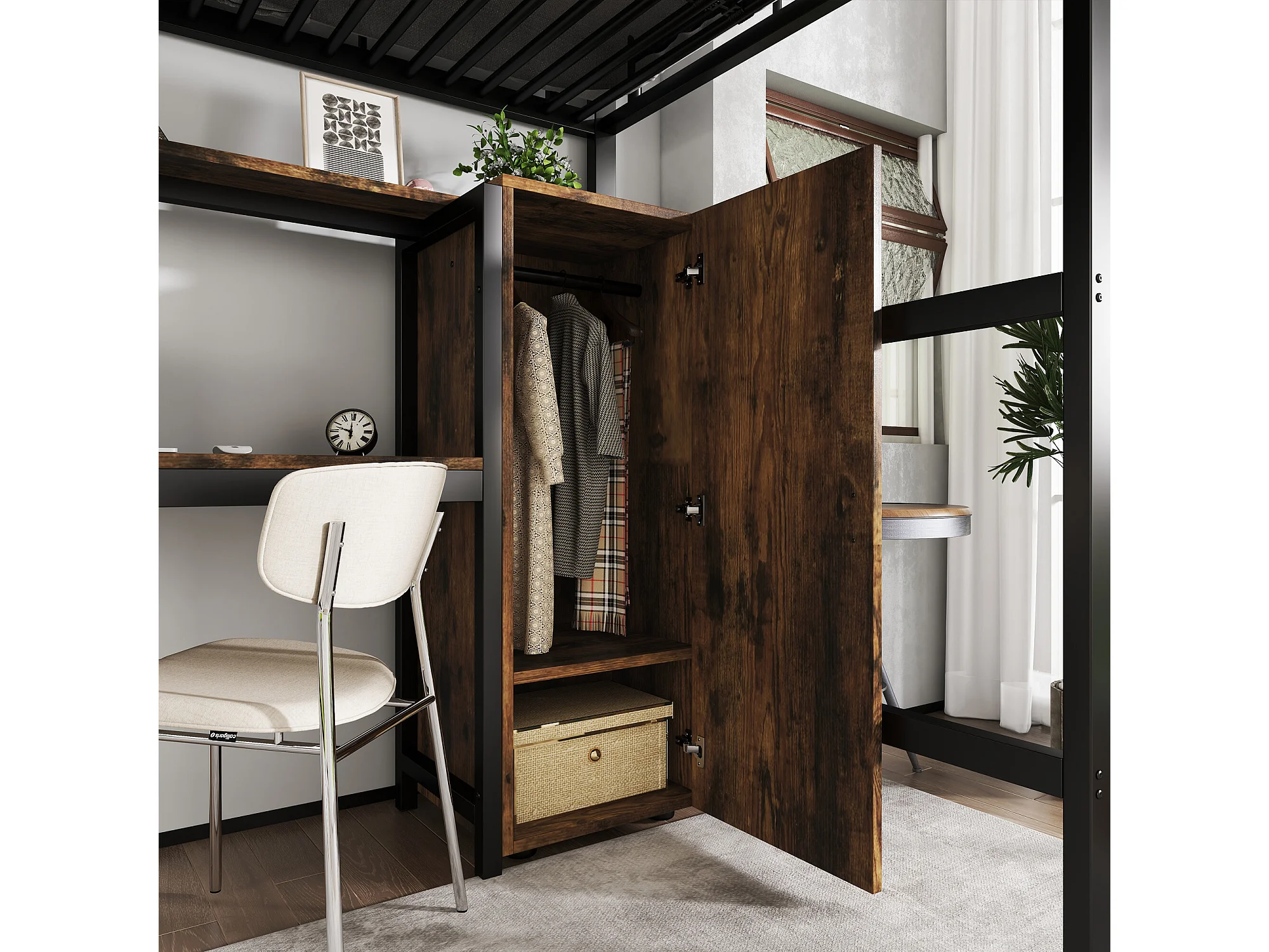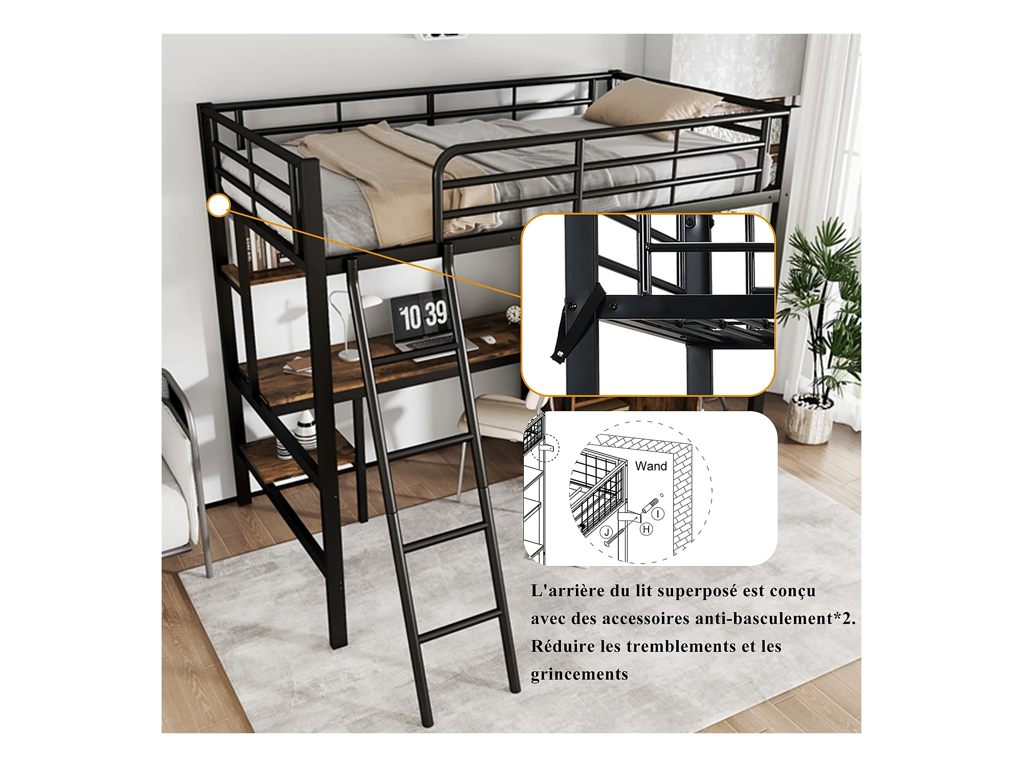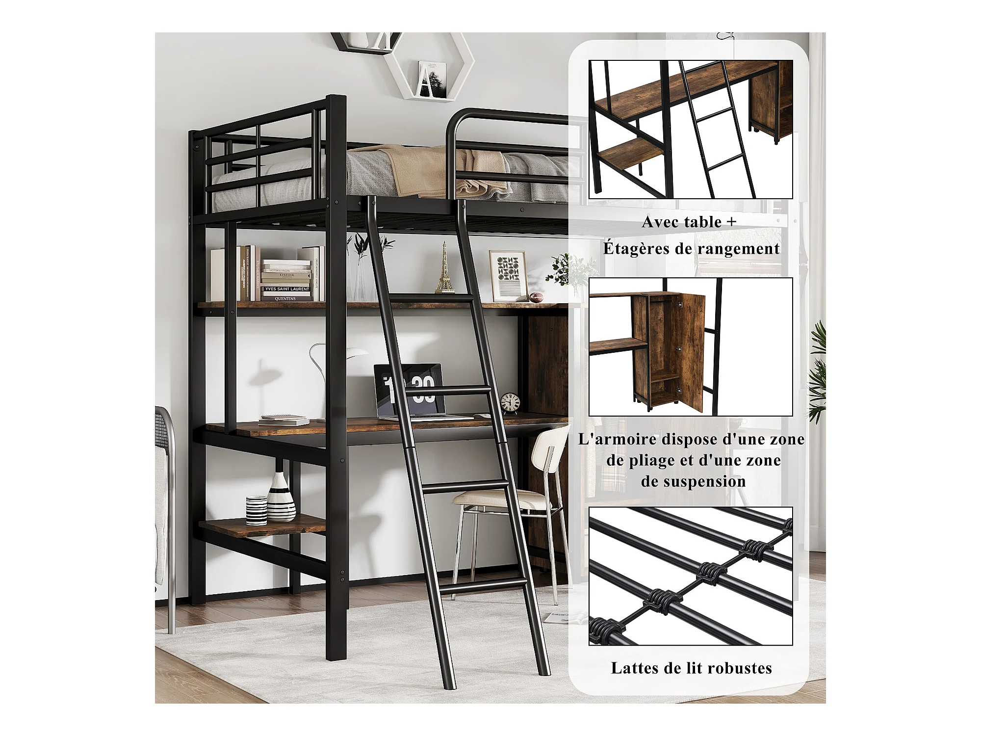 URBAN MEUBLE Lit simple superposé en métal noir effet bois avec bureau intégré et armoire, taille 90x200 cm