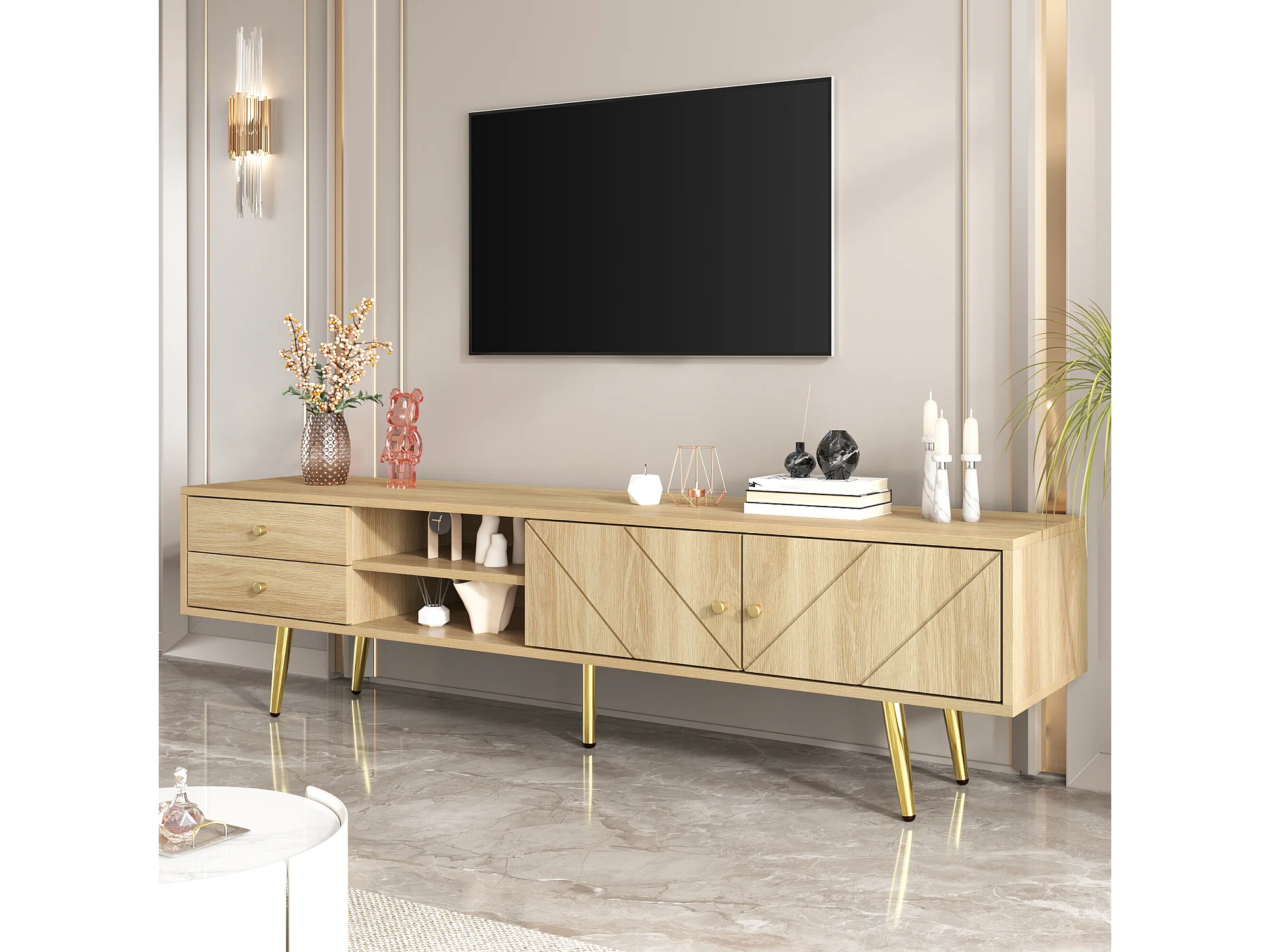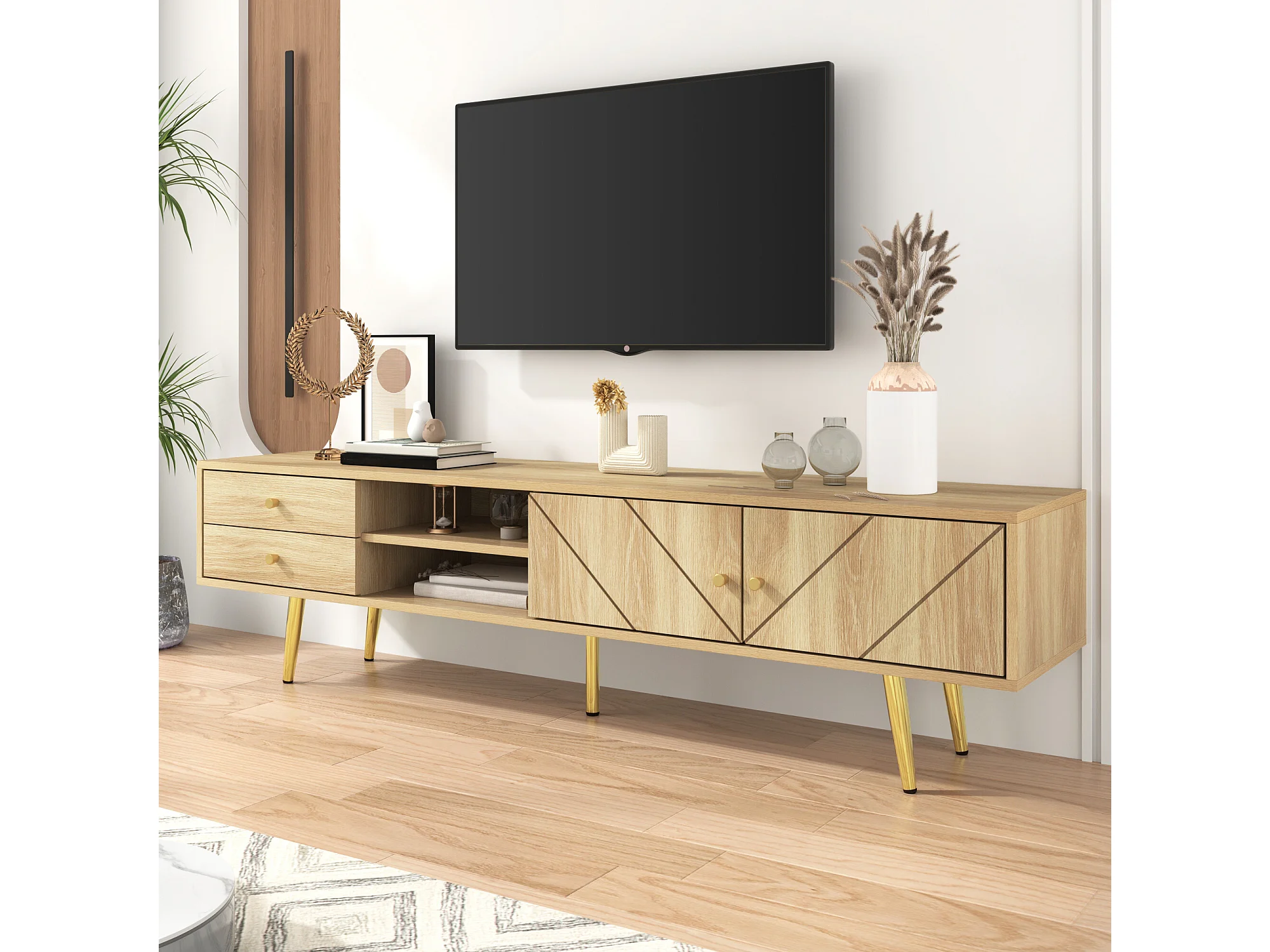 URBAN MEUBLE Meuble TV effet bois naturel portes rainurés, et accents dorés