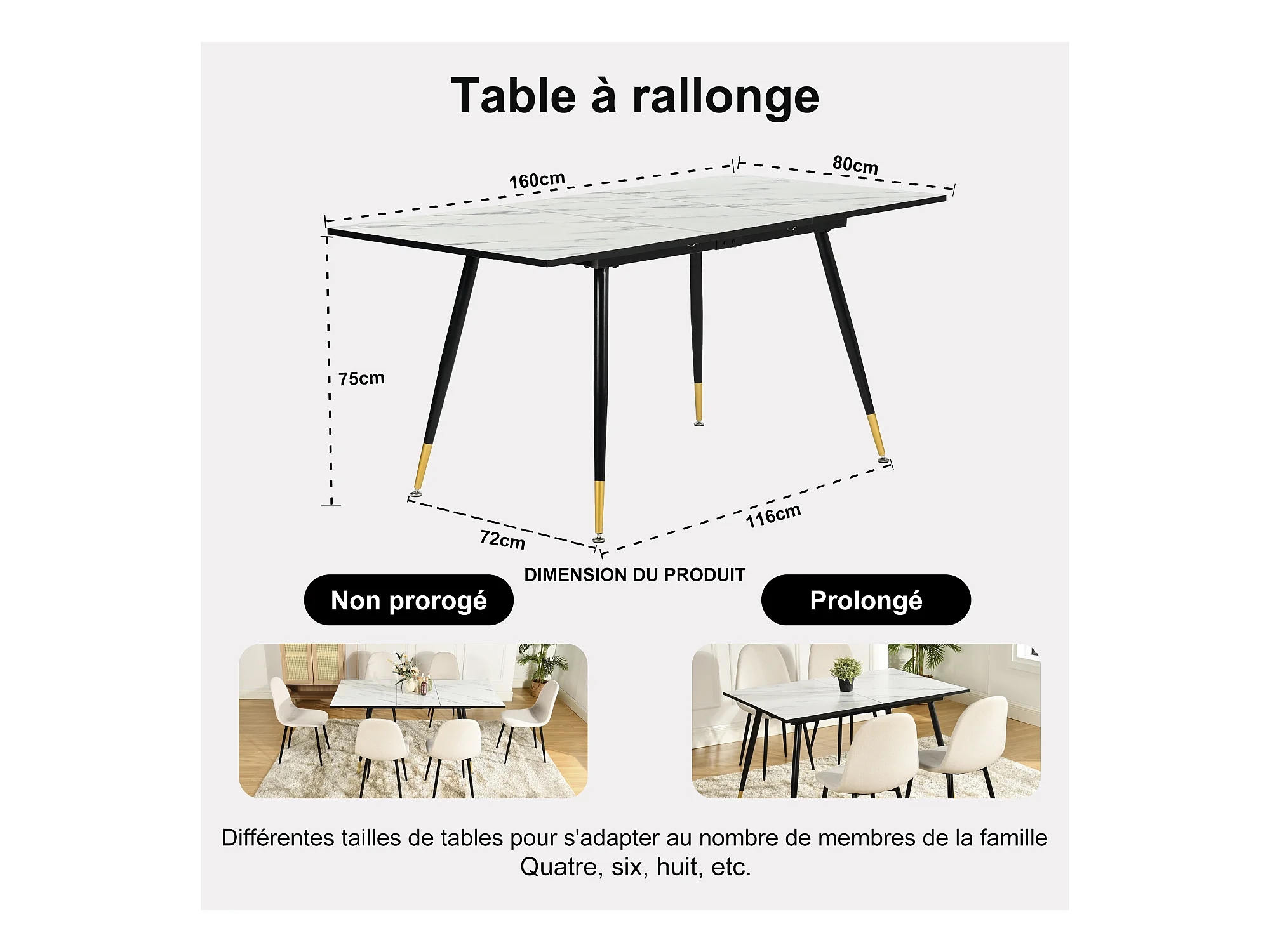 URBAN MEUBLE Table de salle à manger extensible effet marbre blanche pieds dorés style luxueux 140-180*80cm