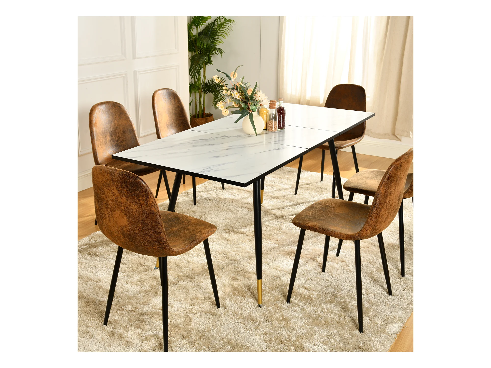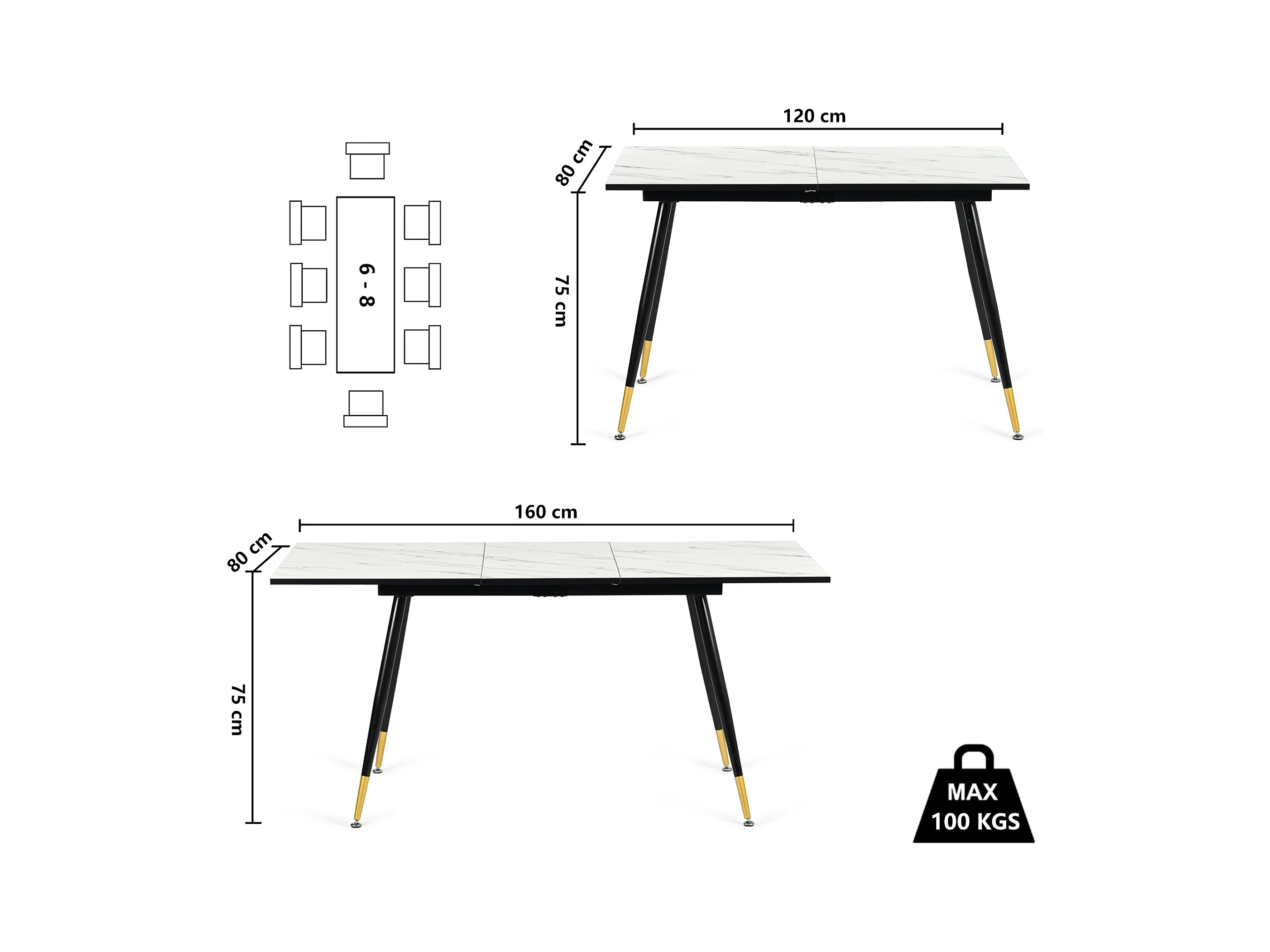 Table à manger extensible 160x80x66 cm - 6 personnes - pieds de table en forme d'étoile - plateau de table imitation marbre - Blanc