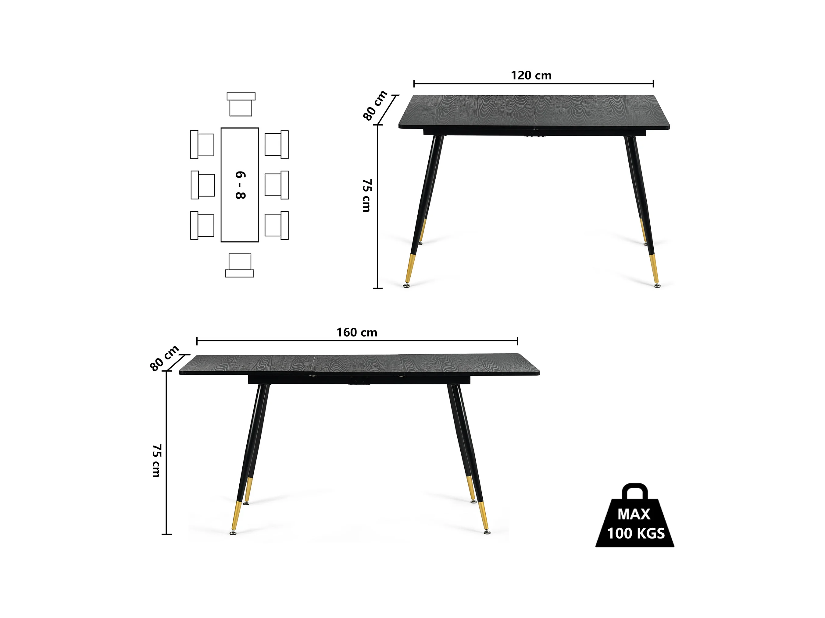 URBAN MEUBLE Table de salle à manger rectangulaire extensible noir effet bois de style scandinave pieds points dorés 120-160 cm