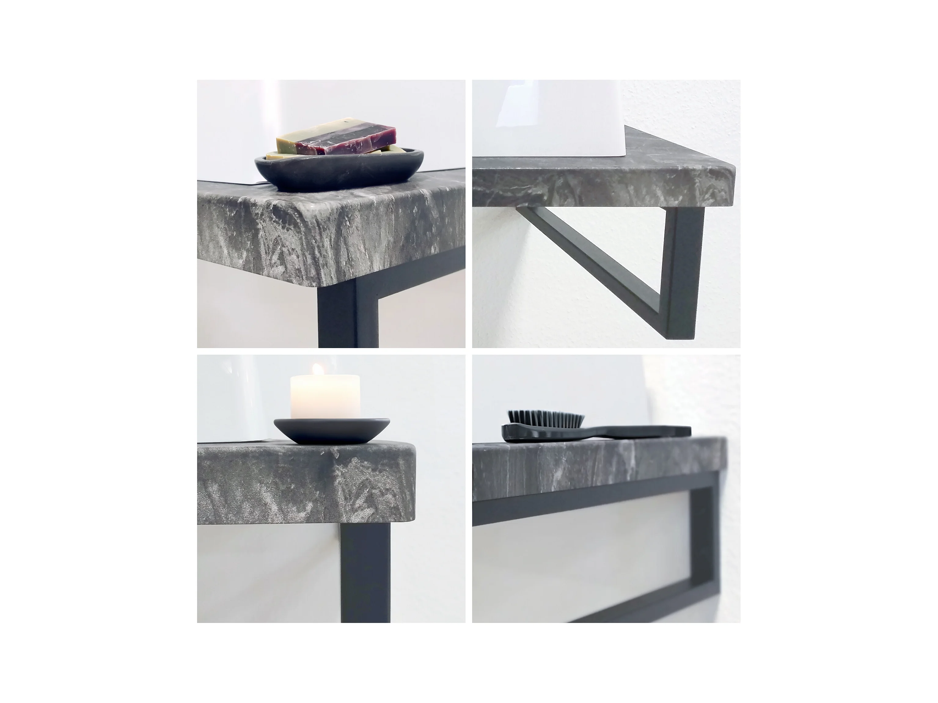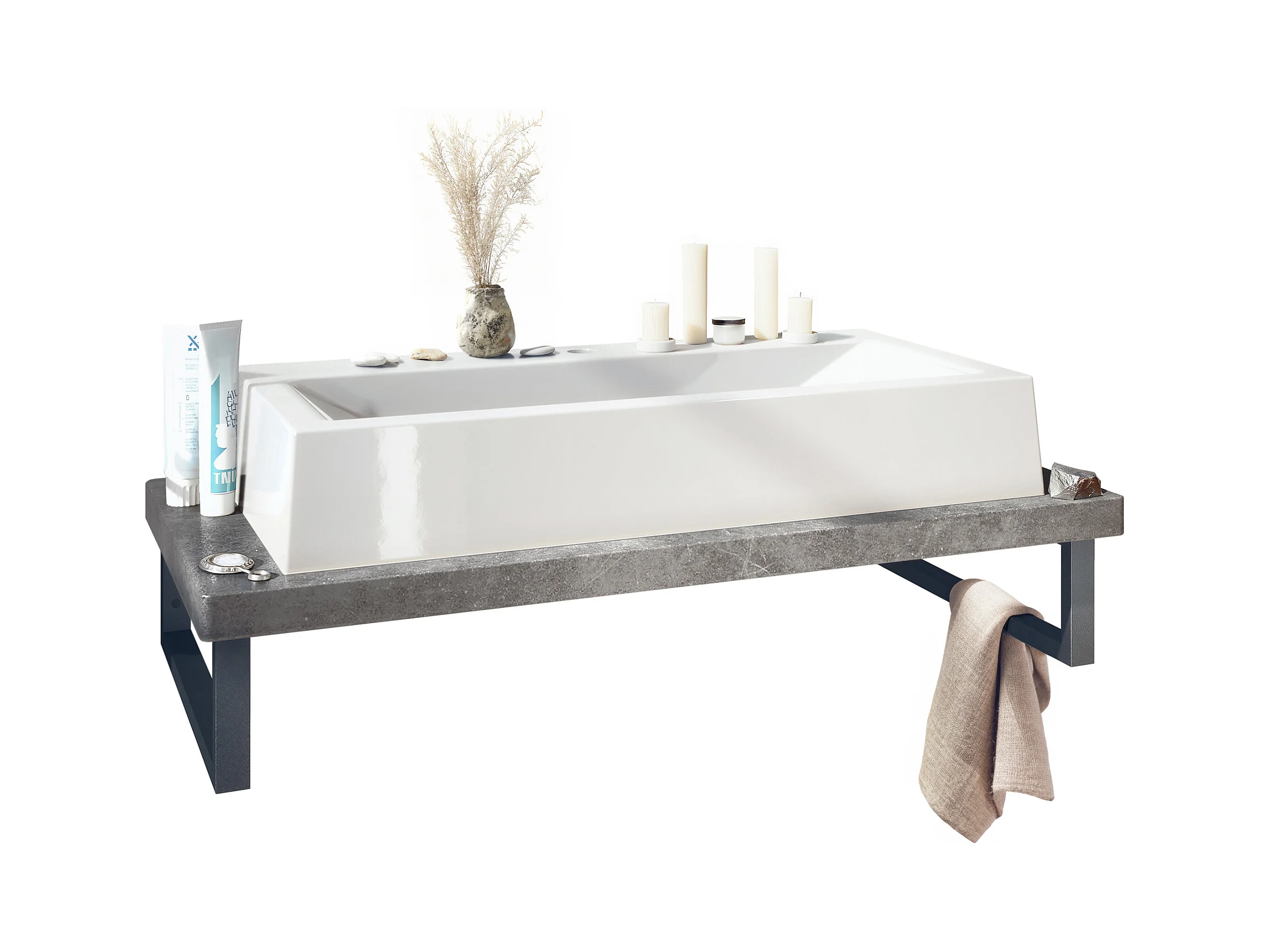 Vasque Nizza avec plateau de lavabo de couleur Gris pierre et support de lavabo en métal noir (95 x 31,4 x 51 cm)