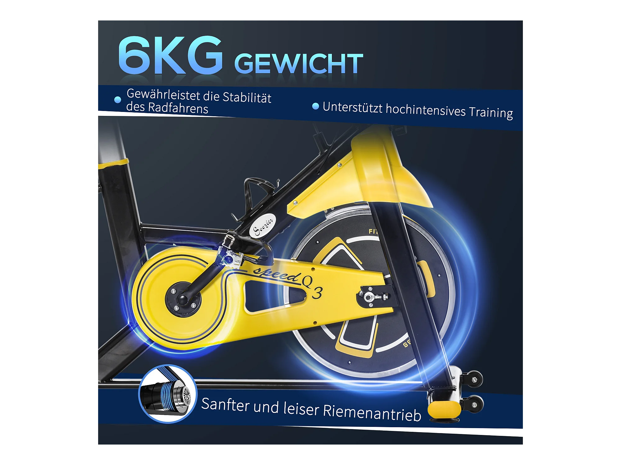 Vélo d'appartement réglable en hauteur avec transmission par courroie, écran LCD, acier et ABS, jaune (45.5x100x101-113cm)