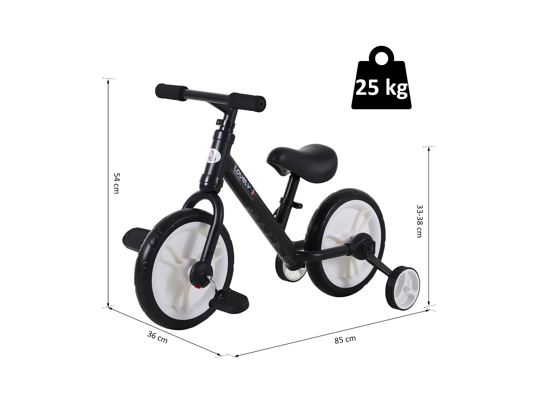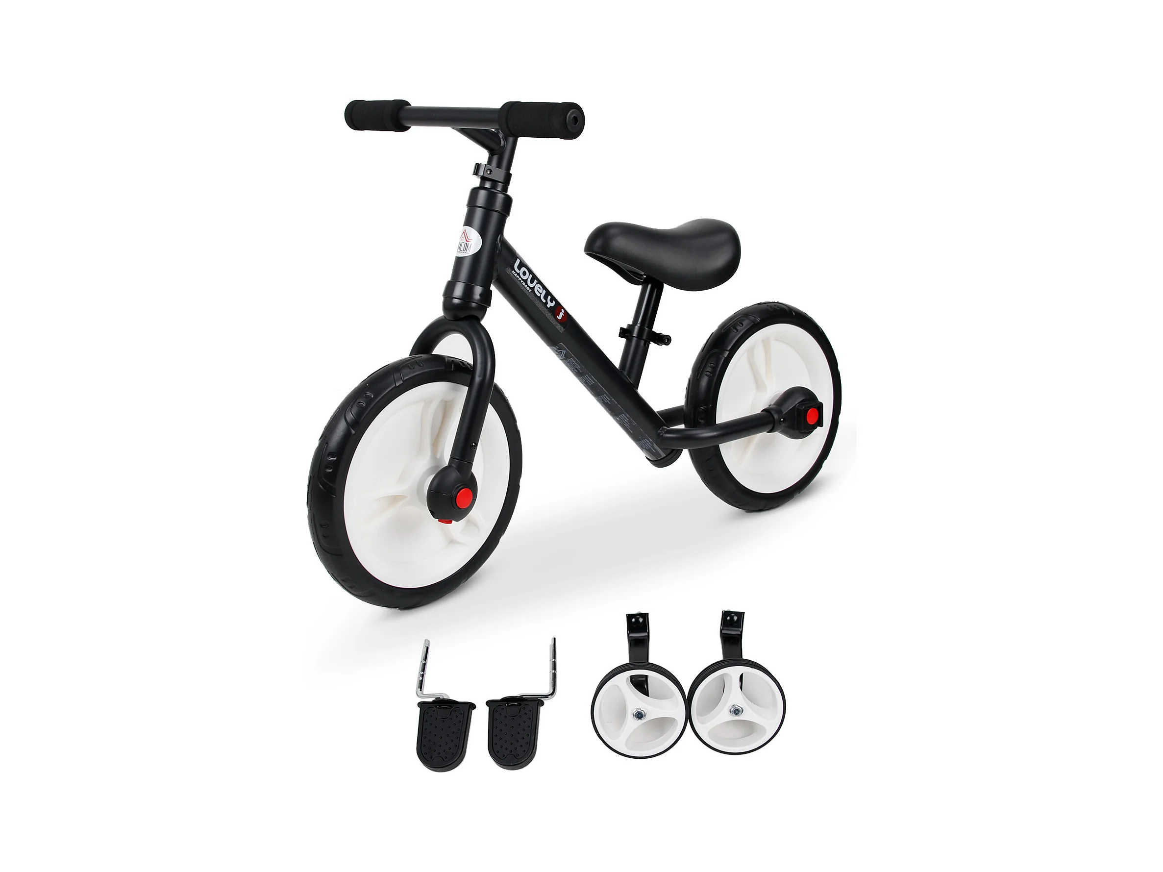 Vélo enfant draisienne 2 en 1 roulettes et pédales amovibles roues 12" hauteur selle réglable acier noir