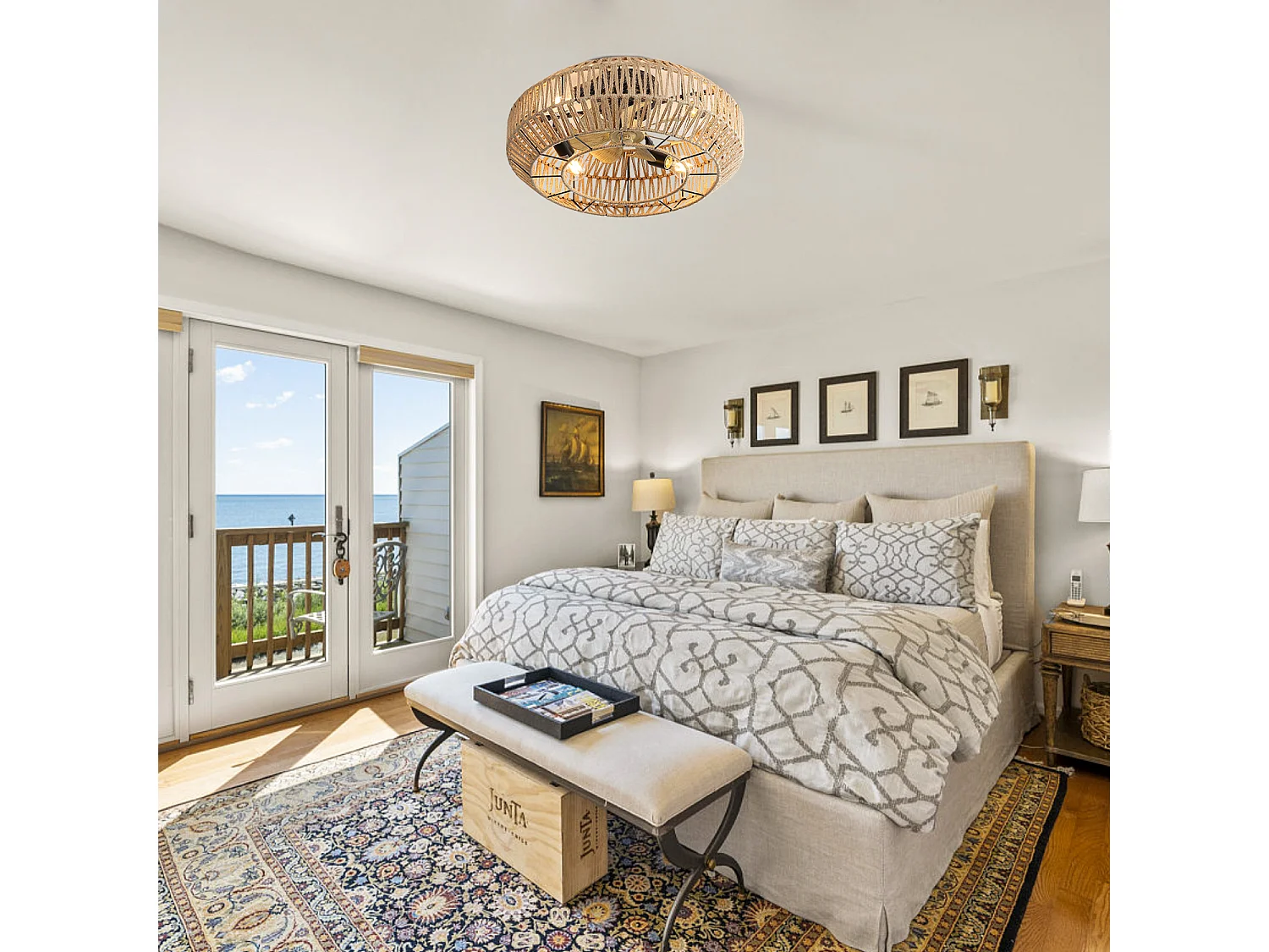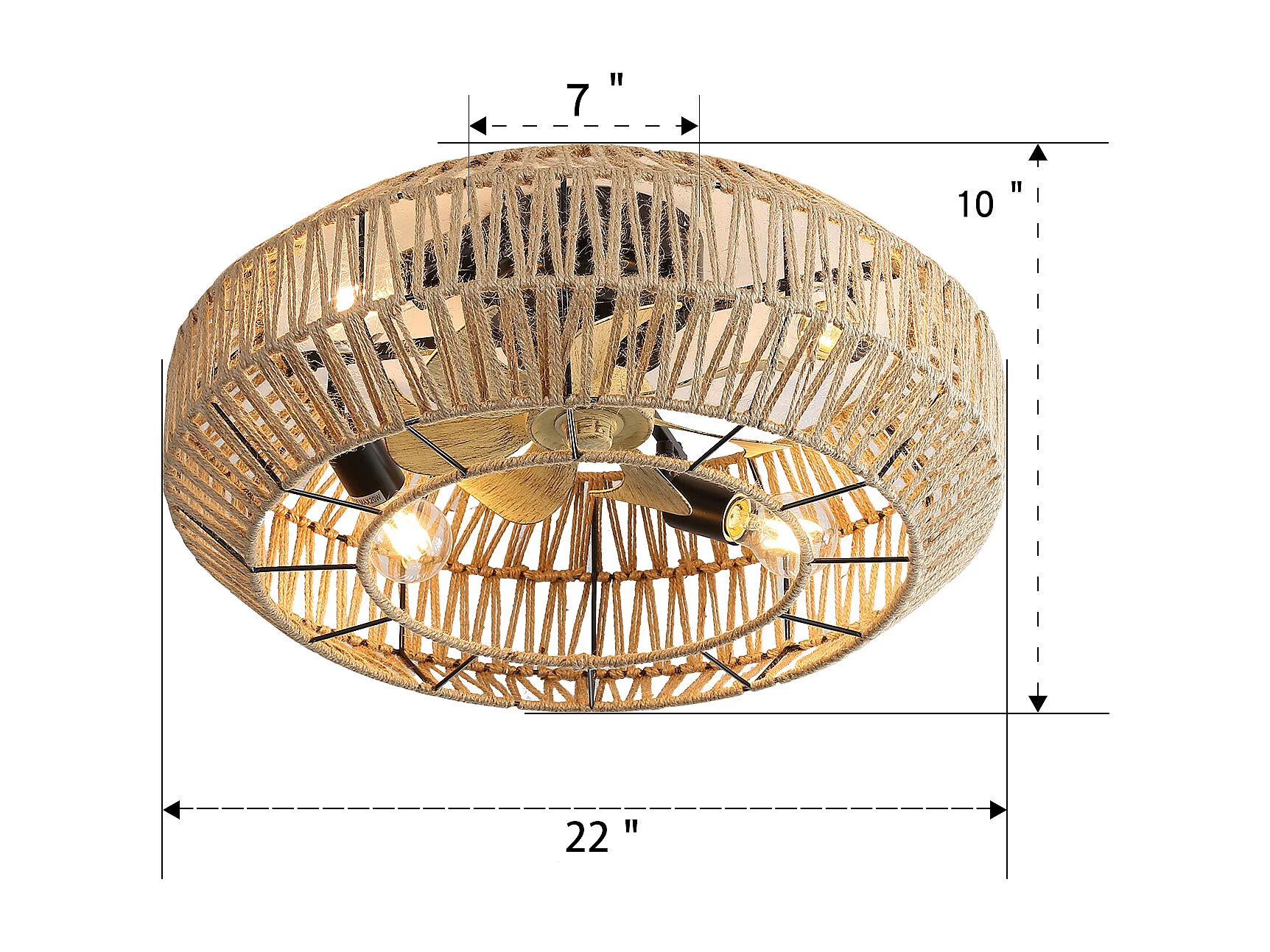 Ventilateur de plafond avec abat-jour en corde de jute 56cm 7 pales avec éclairage, 6 vitesses, Moteur DC réversible,naturel clair