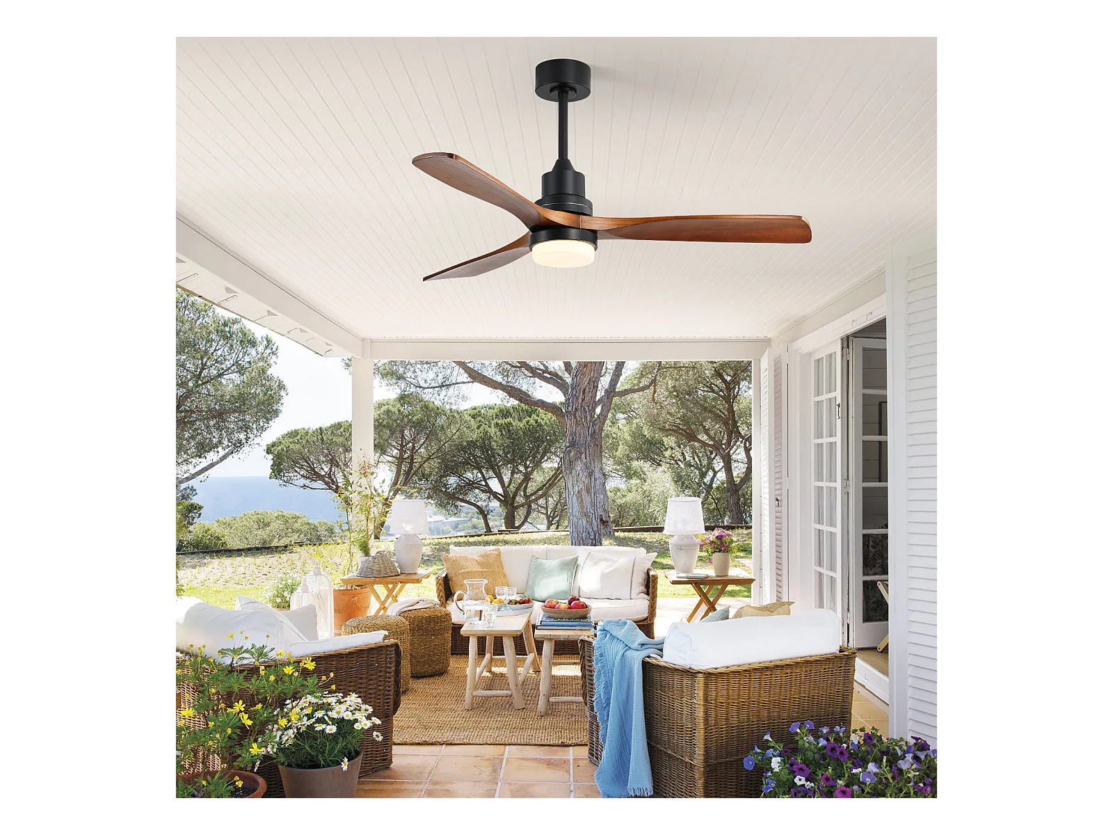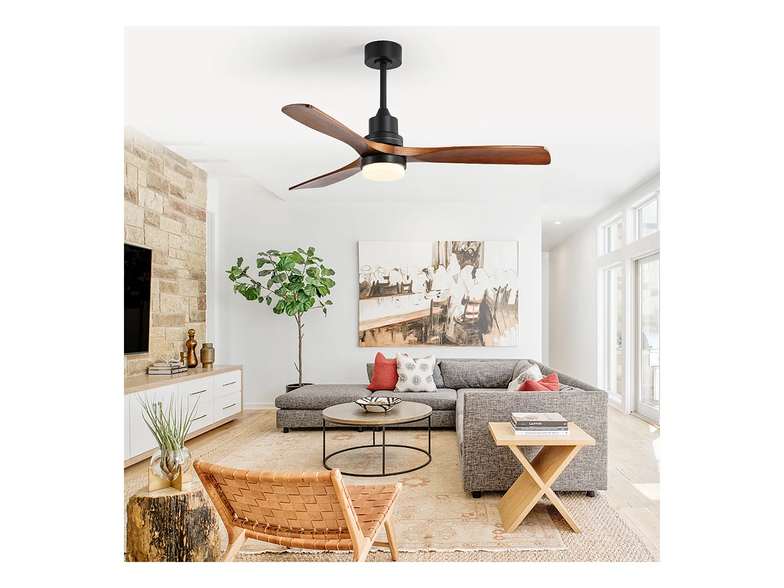 Ventilateur Plafond Bois Massif 132 cm avec LED – Moteur DC Réversible Silencieux – Pour Salon, Chambre, Patio
