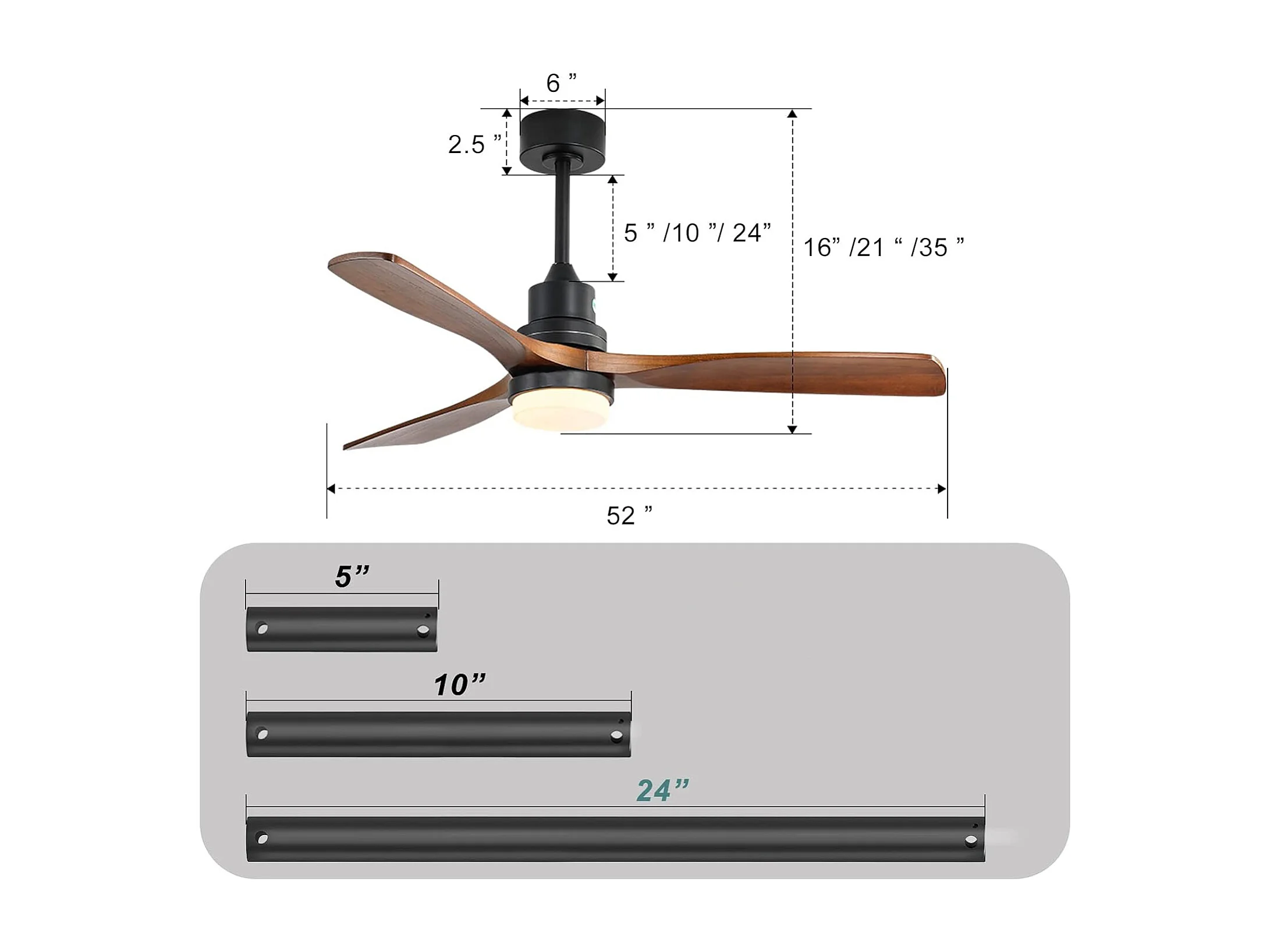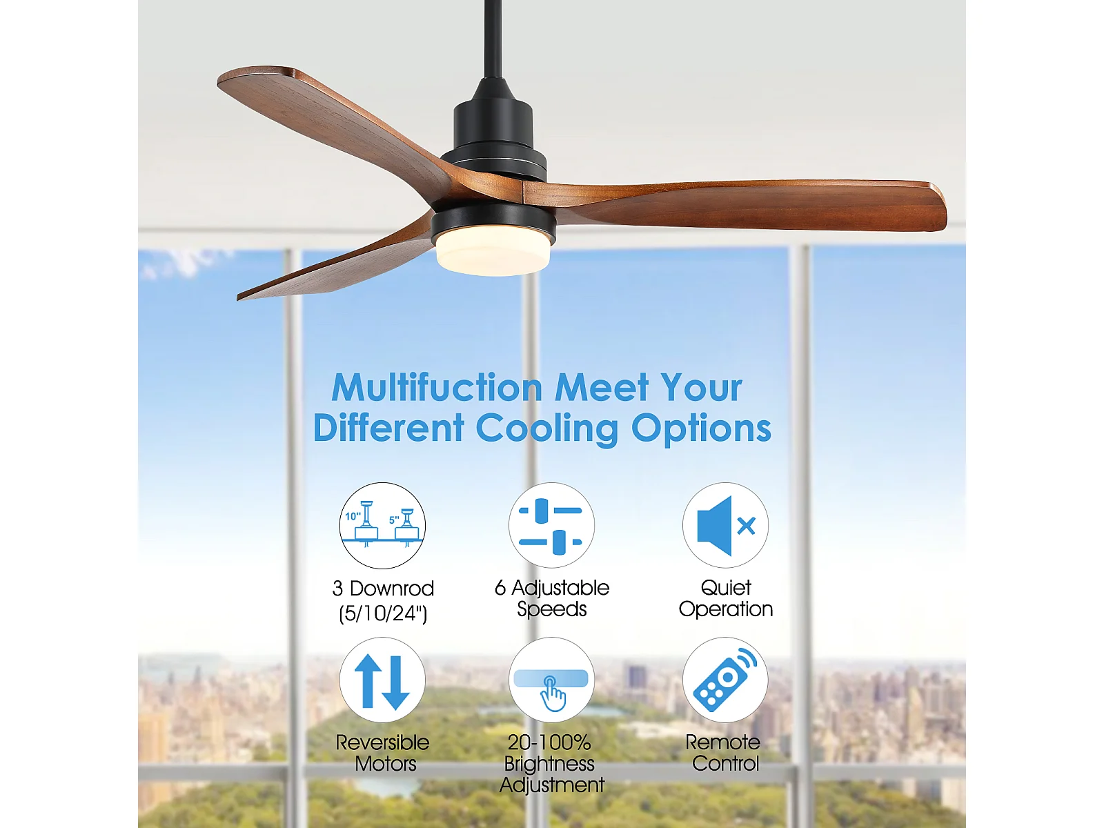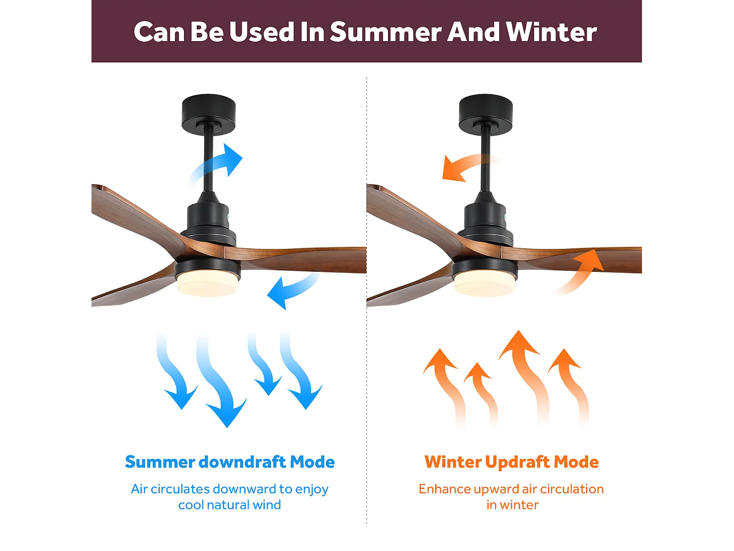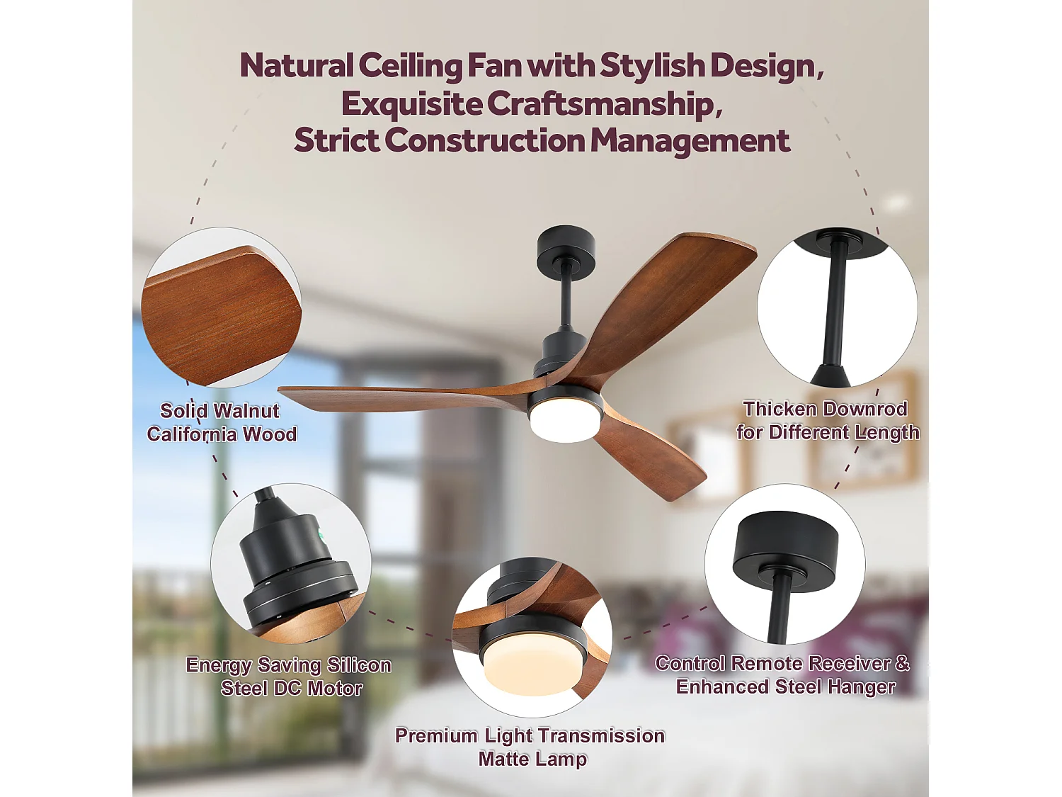 Ventilateur Plafond Bois Massif 132 cm avec LED – Moteur DC Réversible Silencieux – Pour Salon, Chambre, Patio