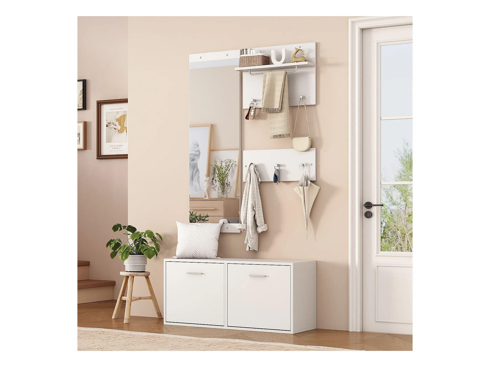 Porte-manteau blanc avec miroir – Vestiaire à 2 portes et patères – rangement ouvert et structure métallique