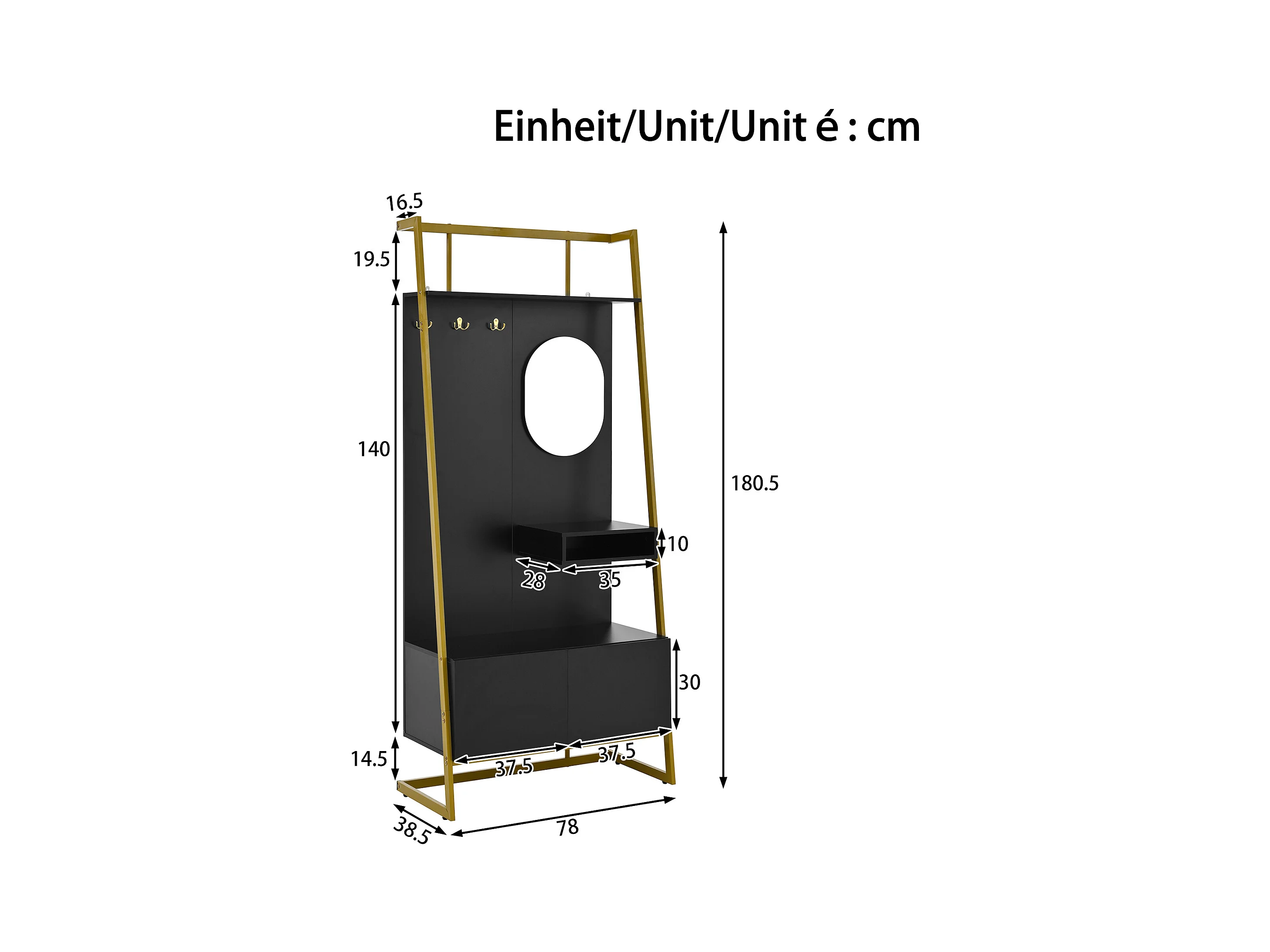 Vestiaire/armoire de rangement avec miroir + meubles de chaussures - crochets en métal - 78 x 38.5 x 180.5 cm - MDF - noir