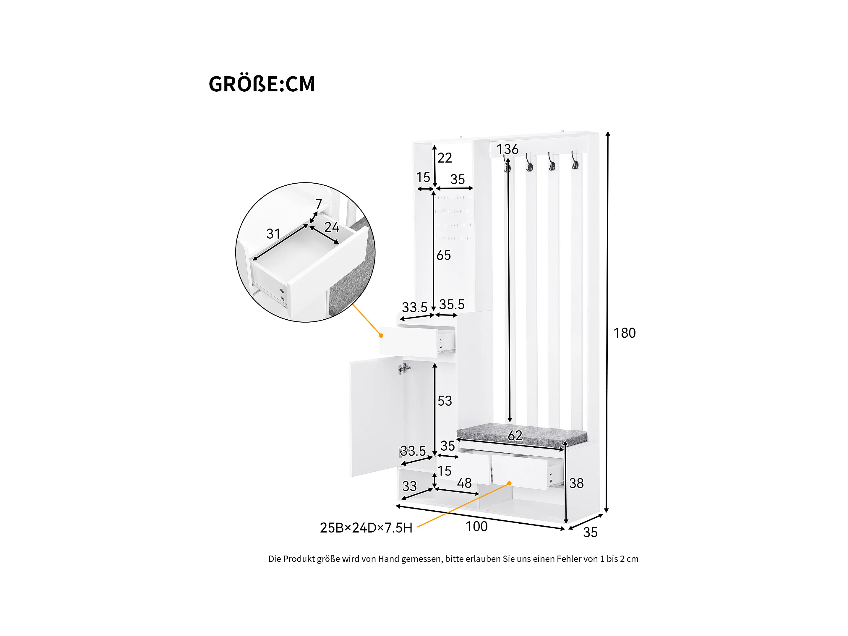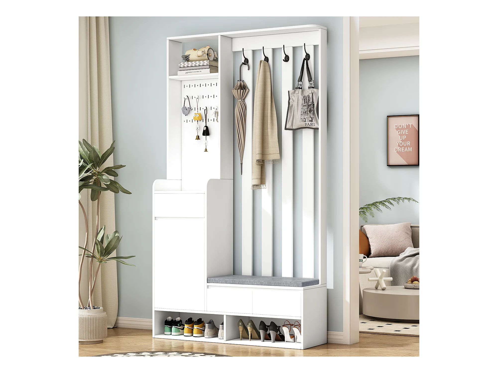 Vestiaire blanc avec 3 tiroirs, 1 porte, 4 crochets et panneau perforé, 100 x 35 x 180 cm