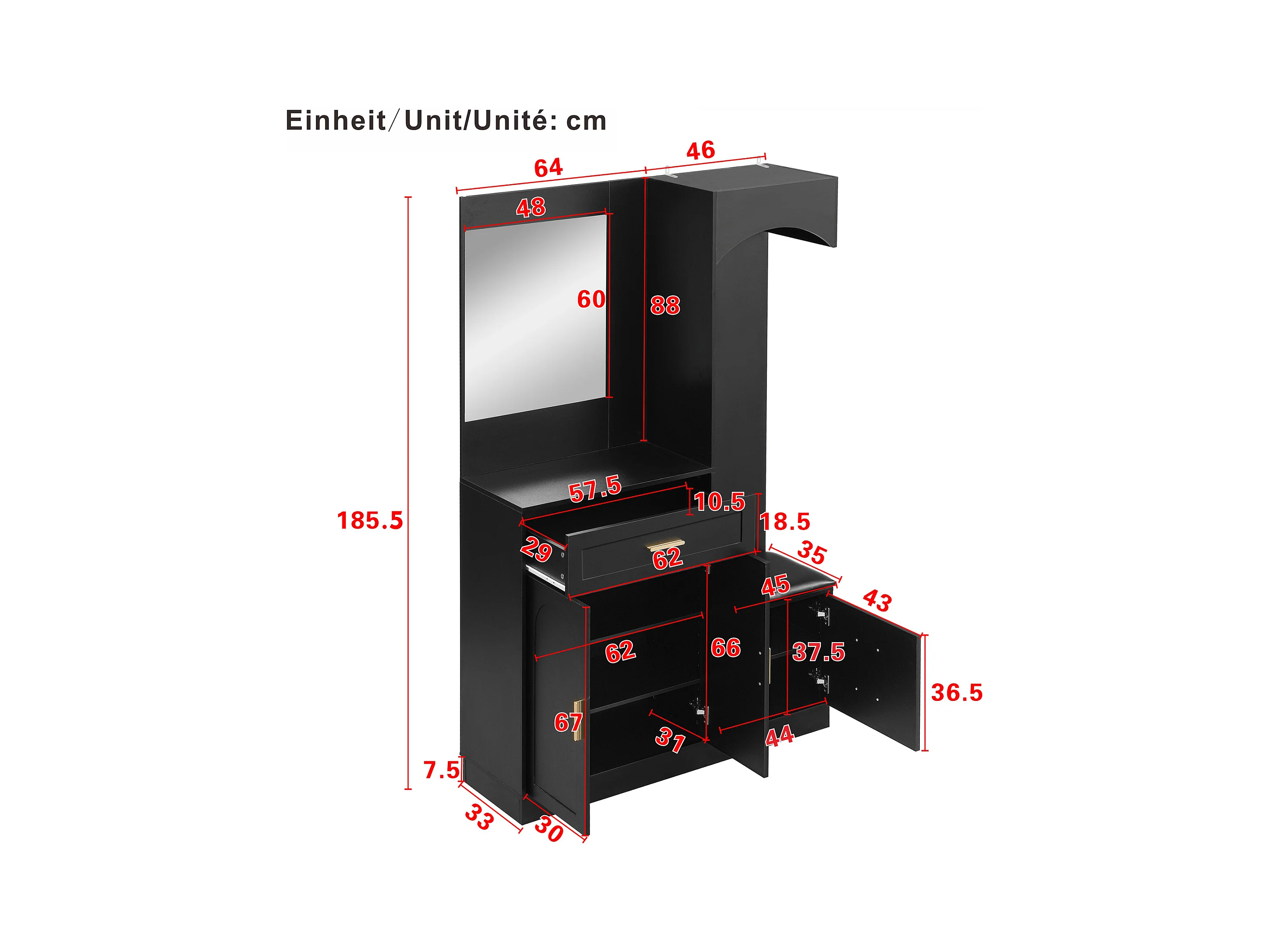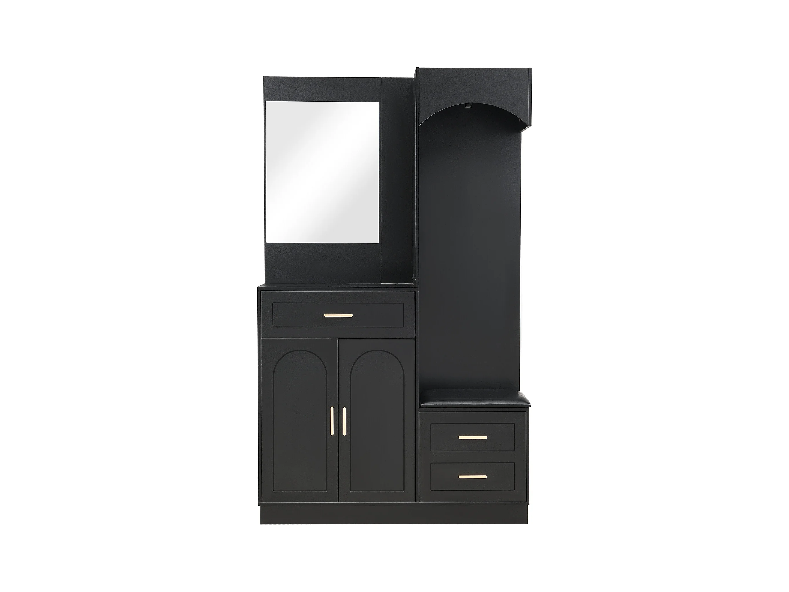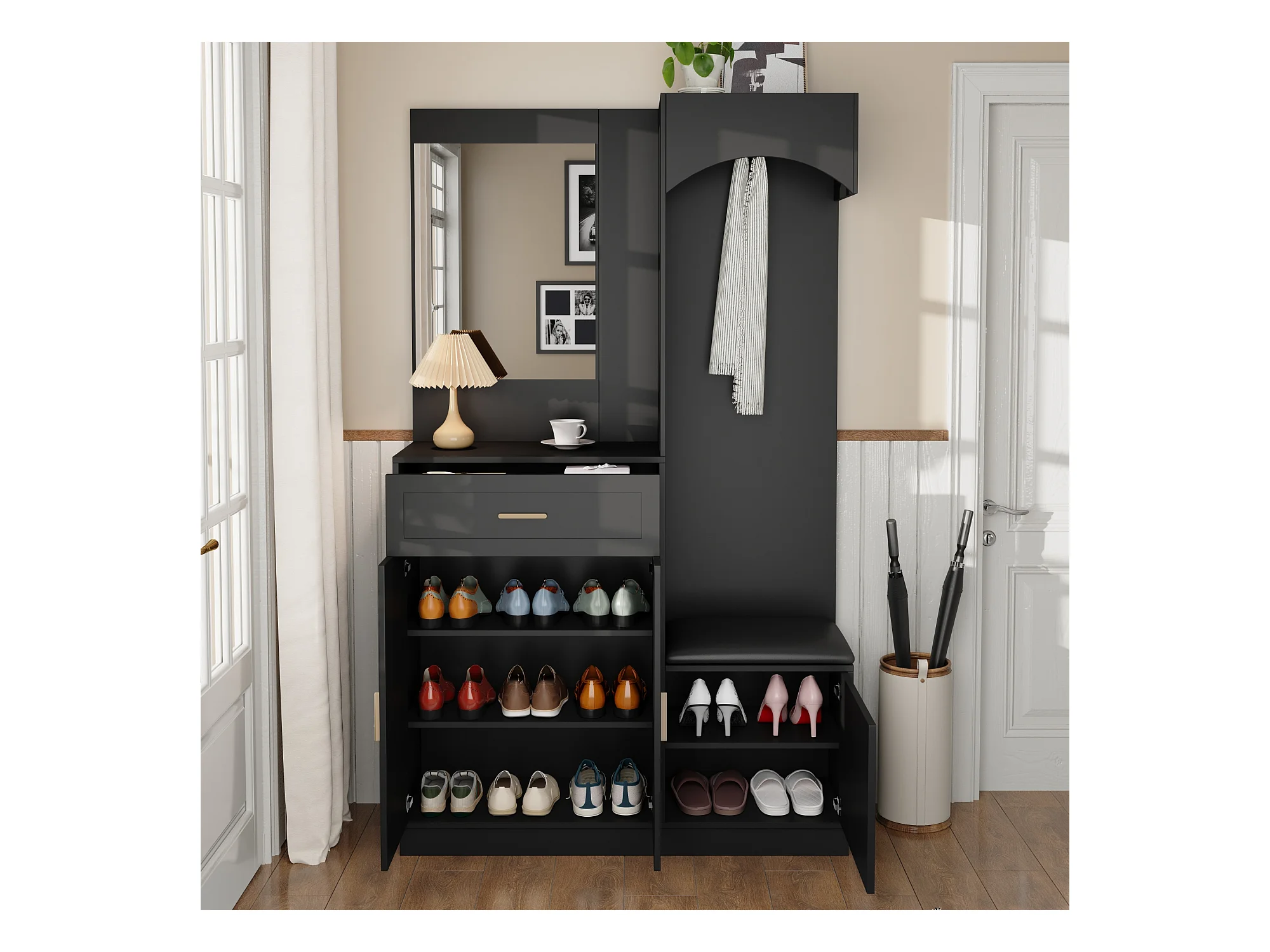 Vestiaire/combinaison armoire et meuble à chaussures avec miroir + 1 tiroir + 3 portes - 110 x 33 x 185.5 - MDF - noir