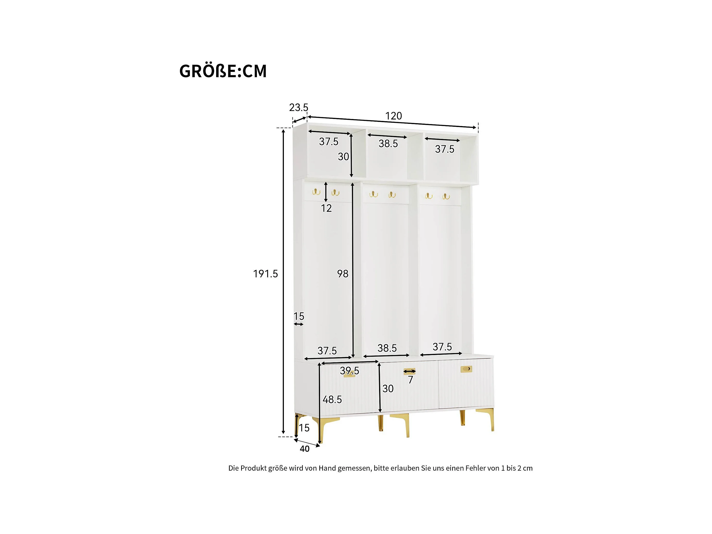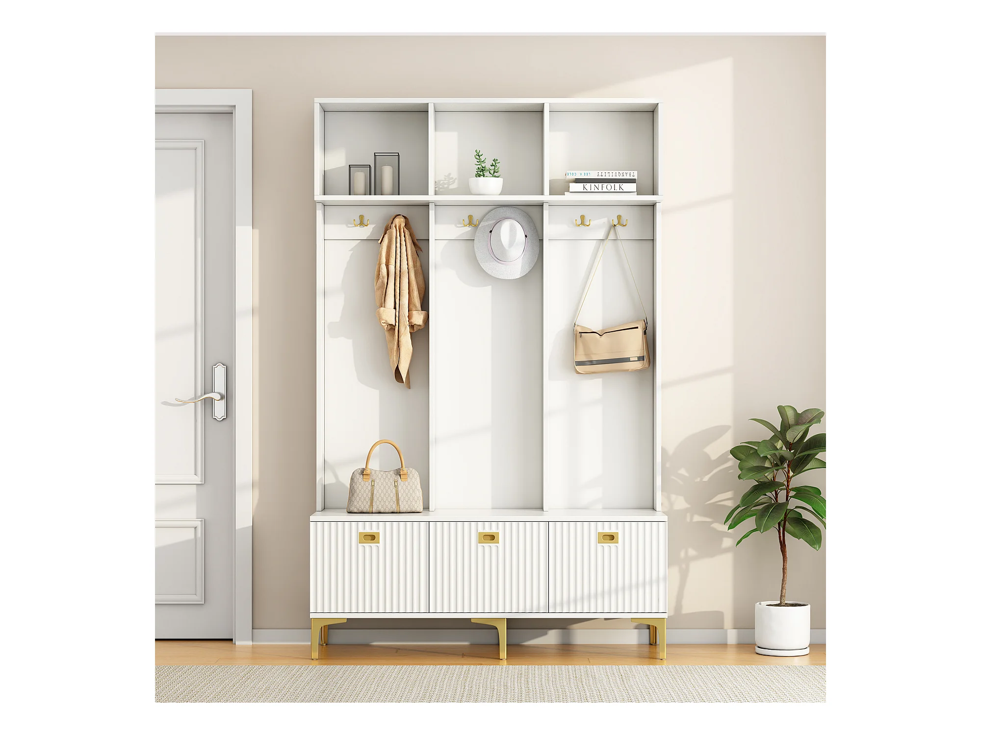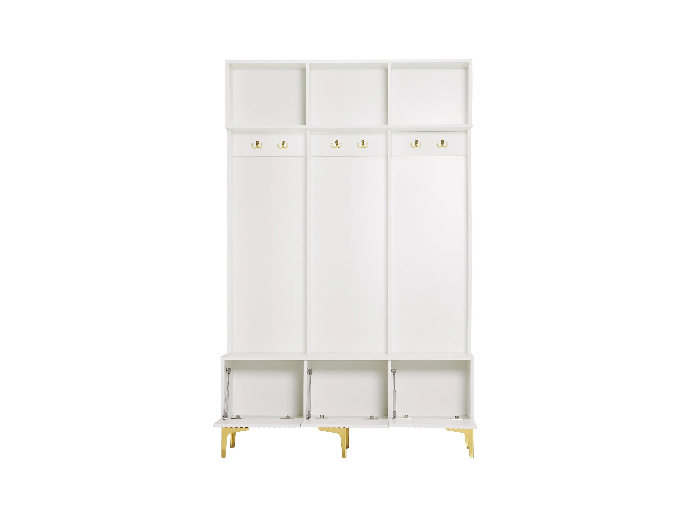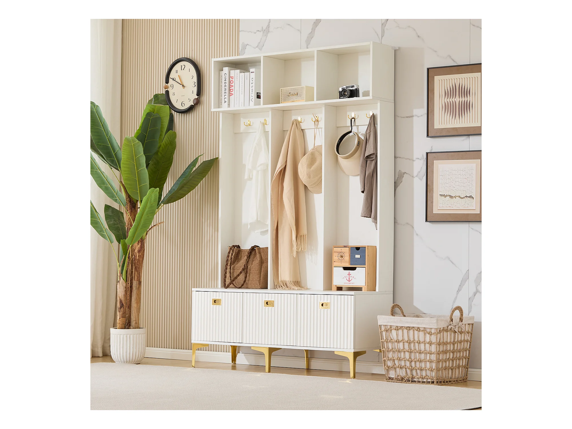 Vestiaire d'entrée avec meuble à chaussures de rangement, crochets dorés et rangement ouvert, blanc