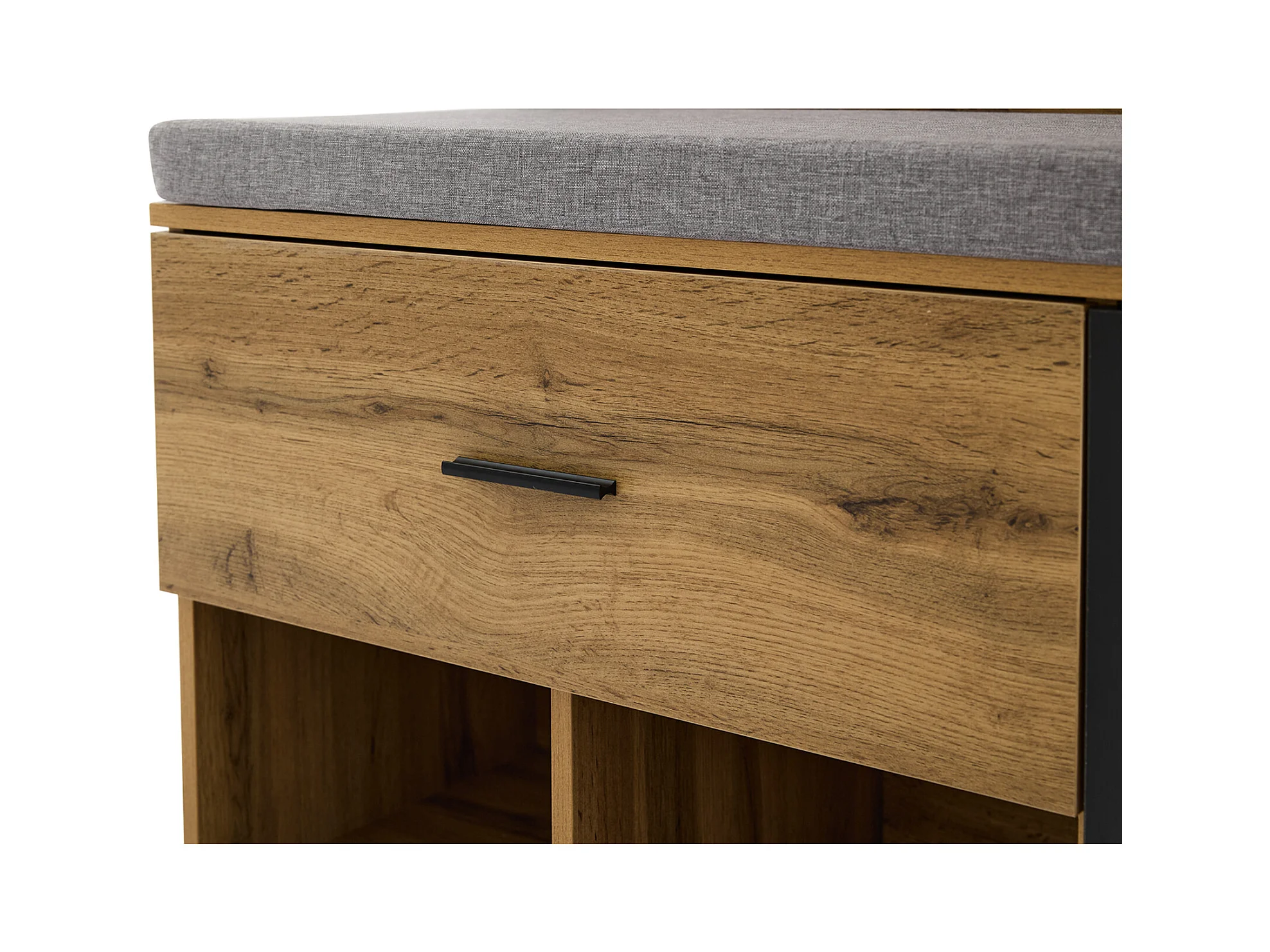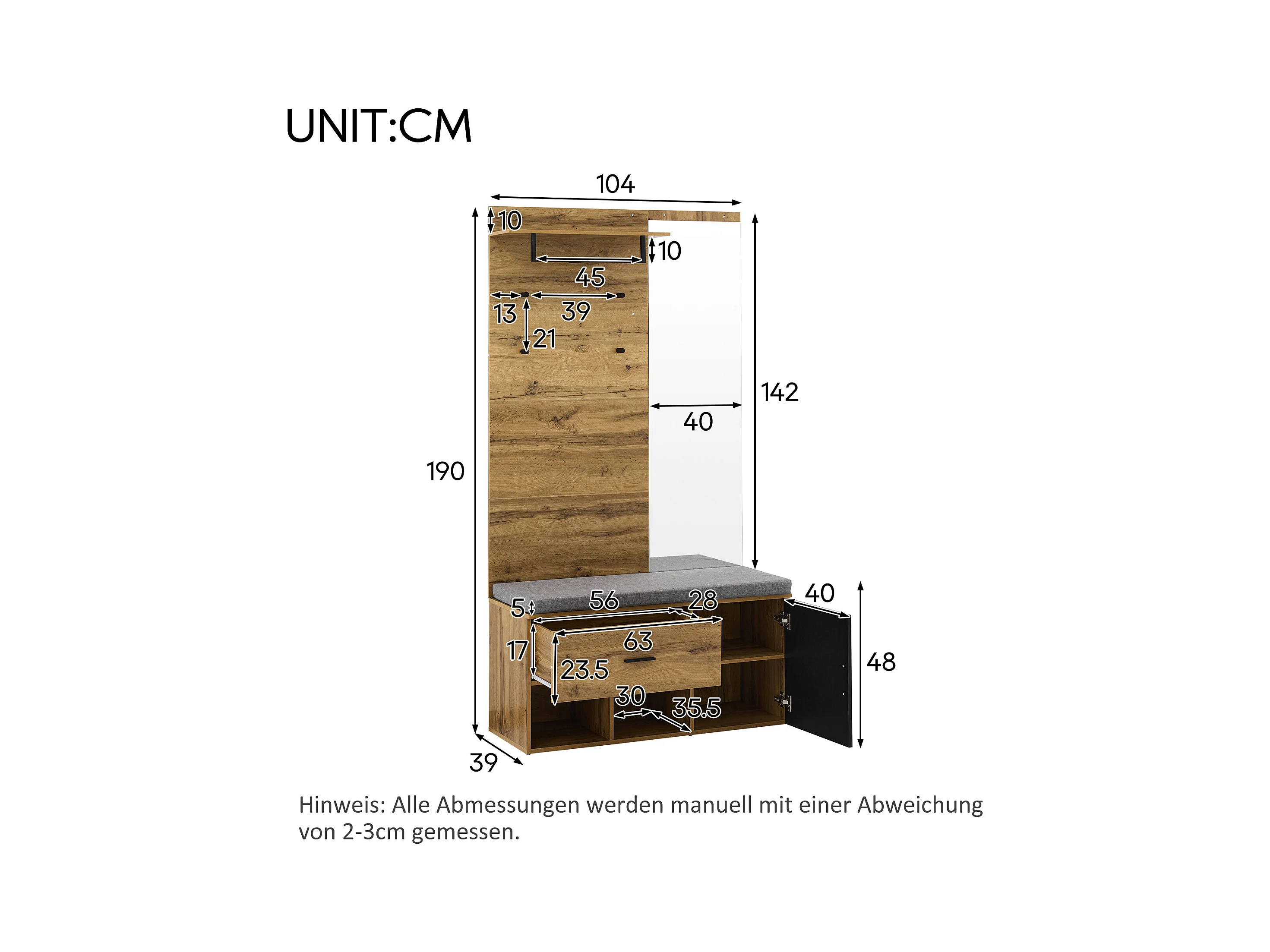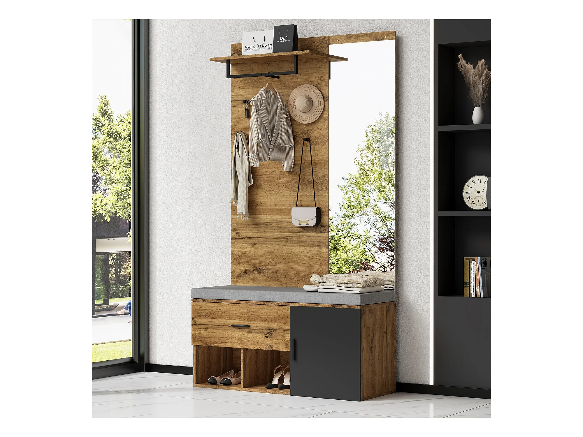 Vestiaire d'entrée chêne 104x190x39 cm avec miroir 1 porte 1 tiroir assise rembourrée rangement chaussures étagères et patères en bois