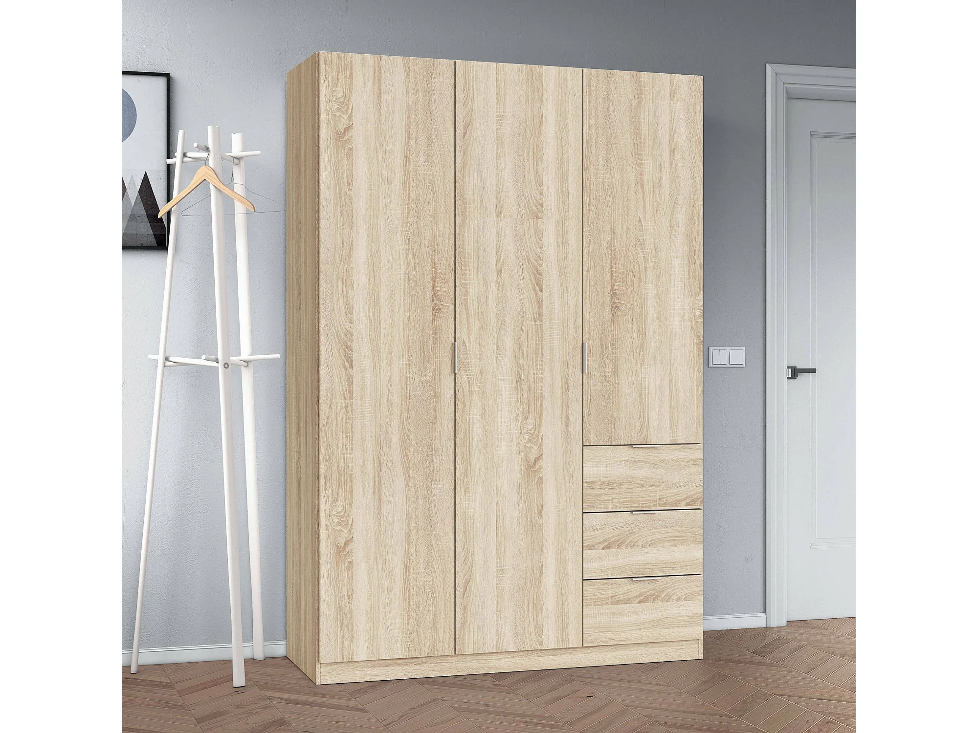 Armoire Fullerton, Armoire de chambre avec 3 portes et 3 tiroirs, Armoire avec 3 étagères et tringle à vêtements, 135x52h200 cm, Chêne