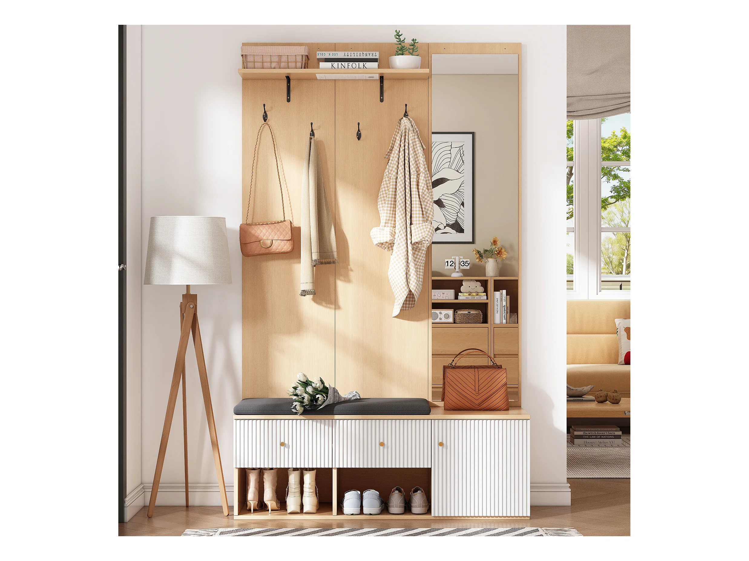 Vestiaire naturel et blanc avec 2 tiroirs, 1 porte , miroir, banc et coussins 120x40x200 cm