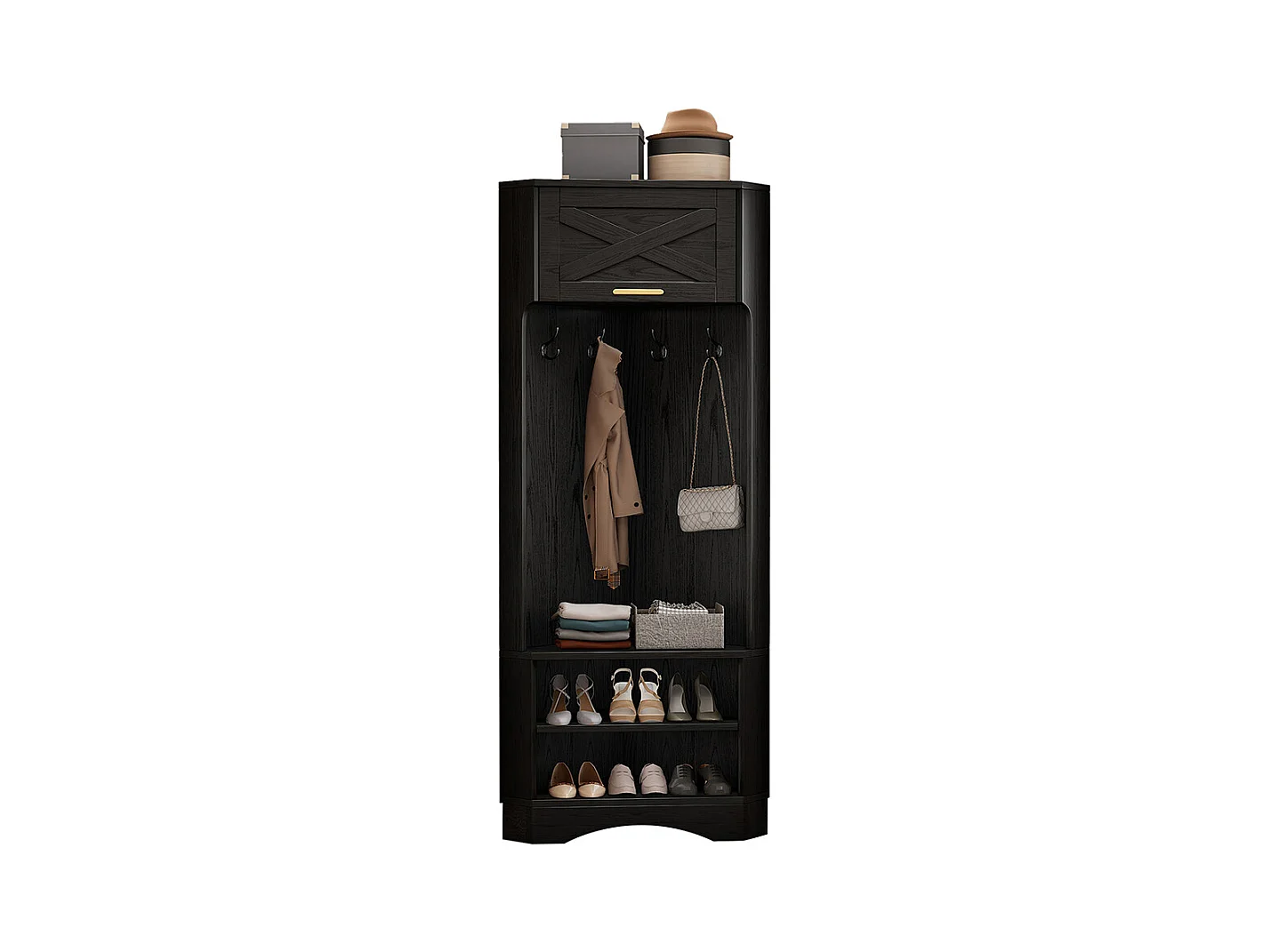 Meuble d'entrée multifonction avec banc, porte-manteaux, étagères, 4 crochets, 2 tiroirs, 1 porte, noir, (100x35x180 cm)