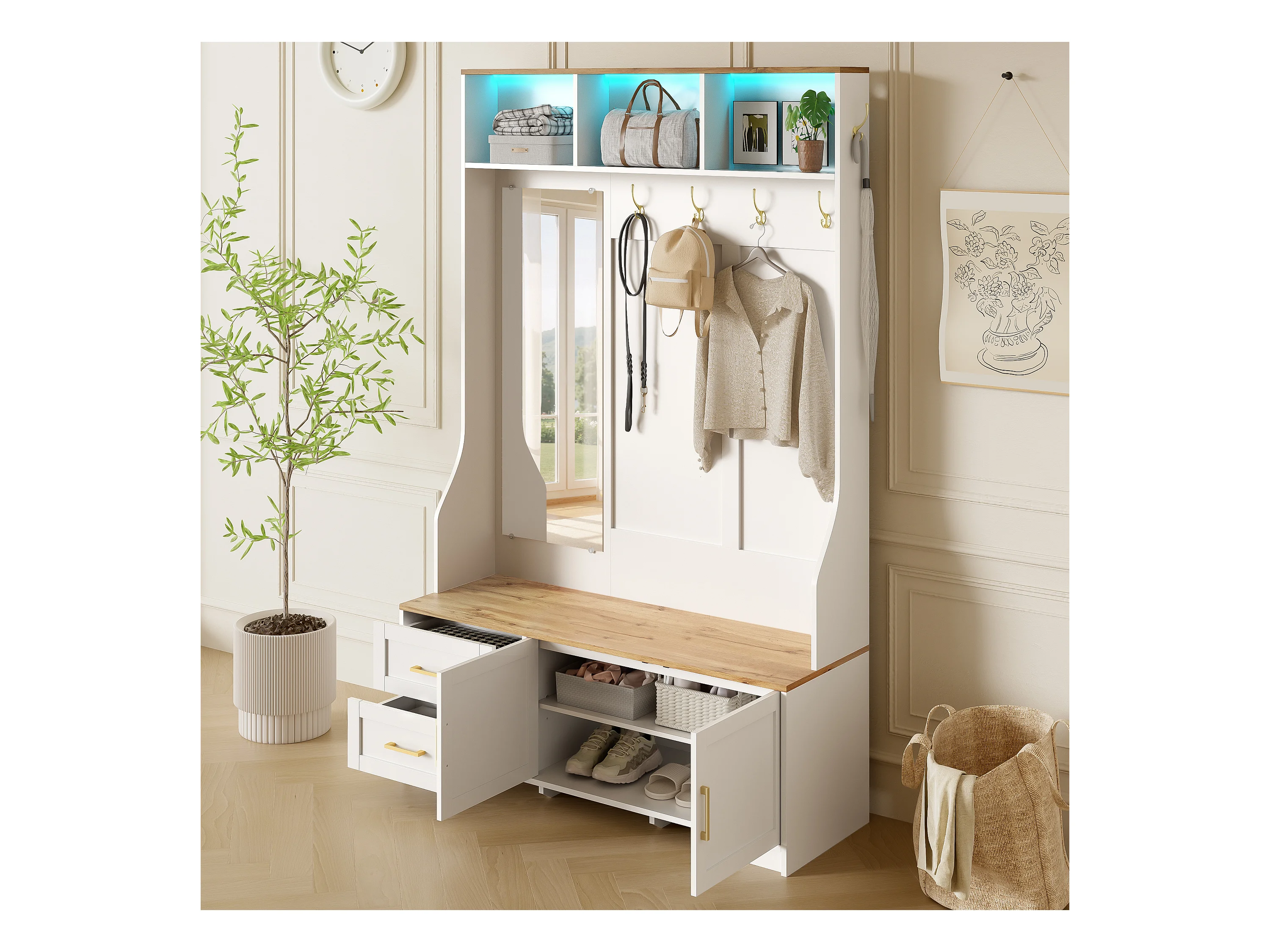 Vestiaire pour entrée et couloir avec Leds + miroir + 2 tiroirs - 120 x 40 x 187 cm - MDF - blanc + naturel