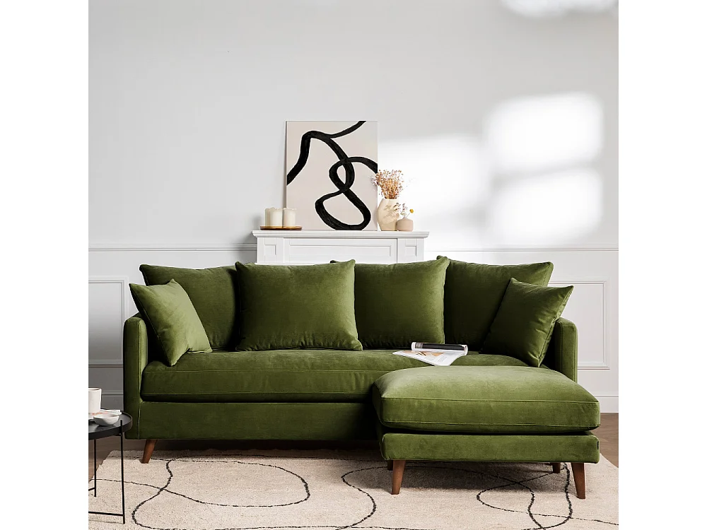 Villabon - Canapé convertible 4 places en velours pieds bois foncé - Vert olive