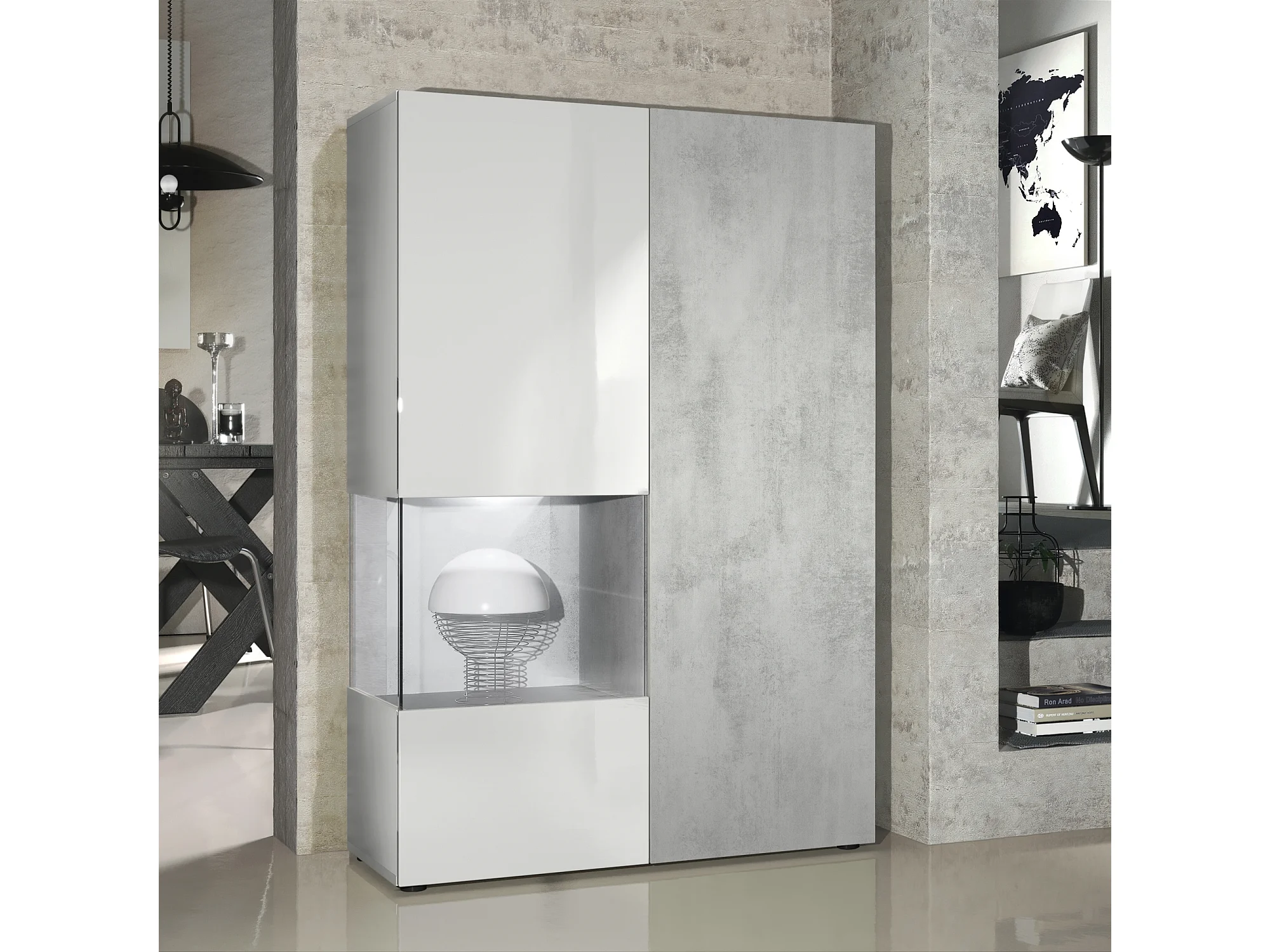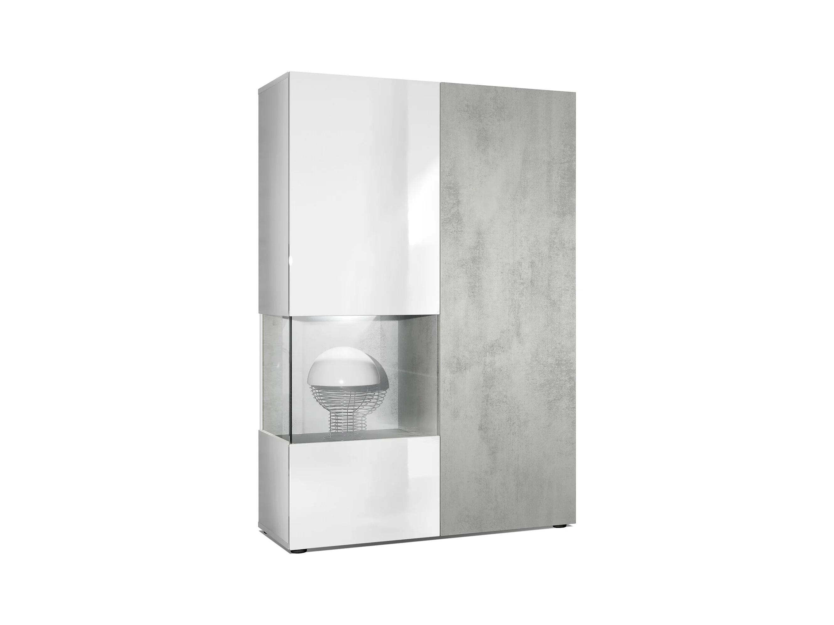 Vitrine Armoire Morena, Corps en Blanc mat / Porte droite et insert en Aspect Béton Oxyde avec éclairage LED