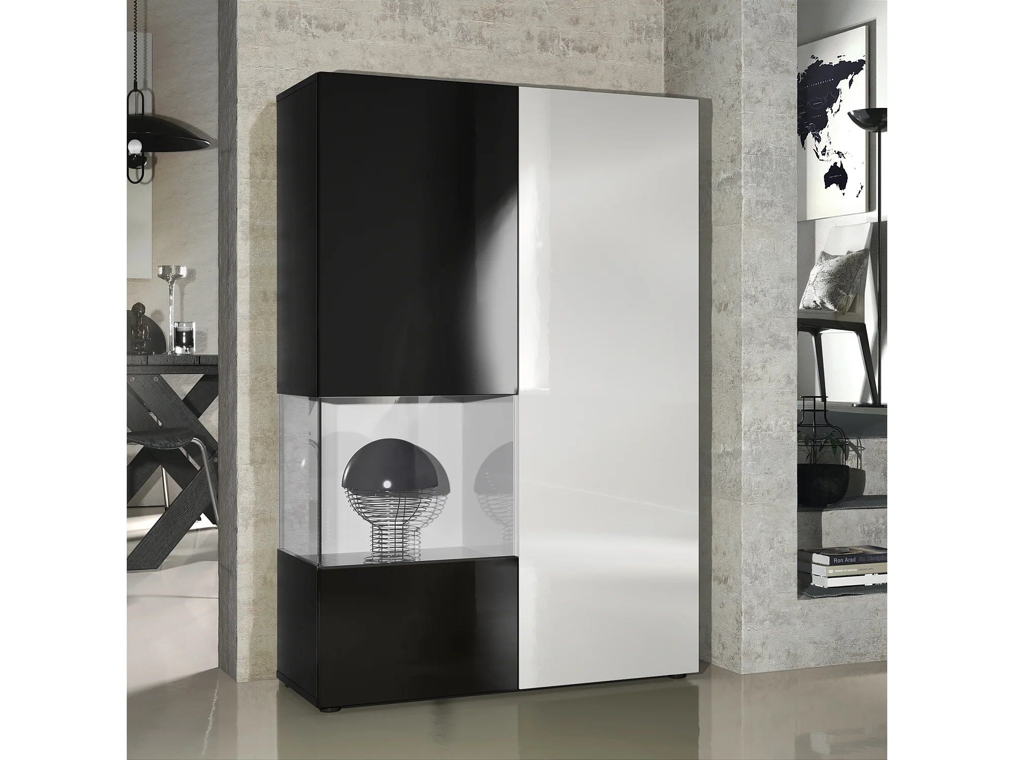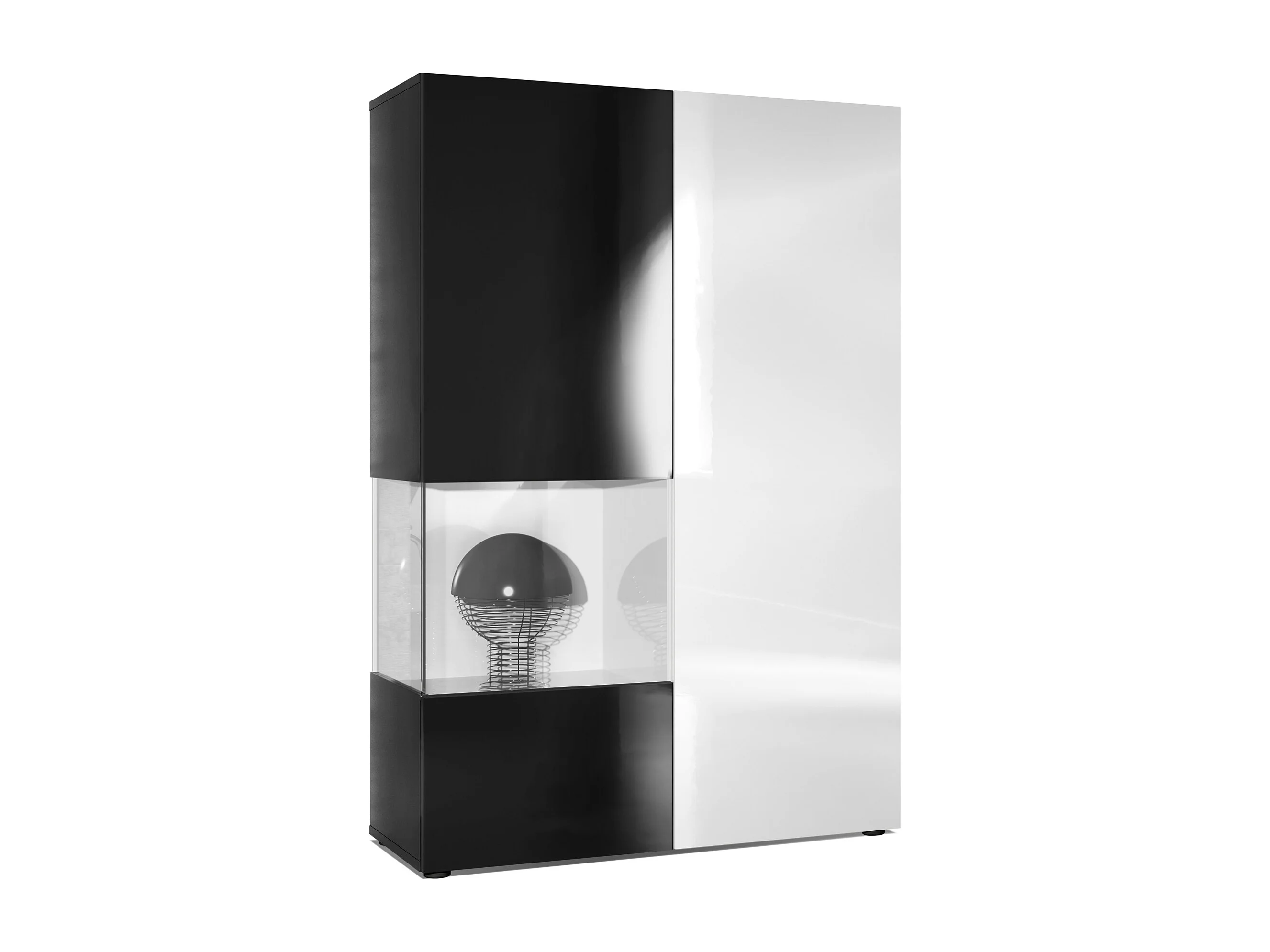 Vitrine Armoire Morena, Corps en Noir mat / Porte droite et insert en Blanc haute brillance