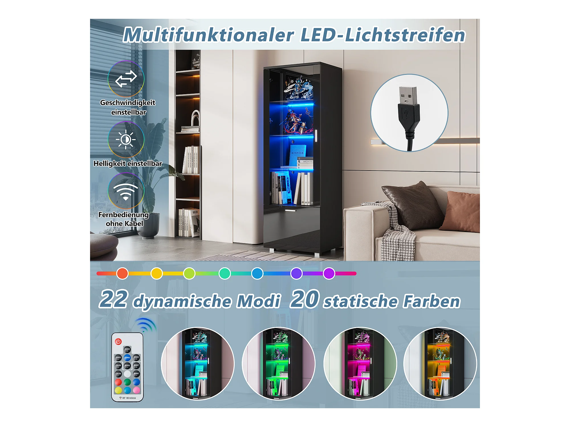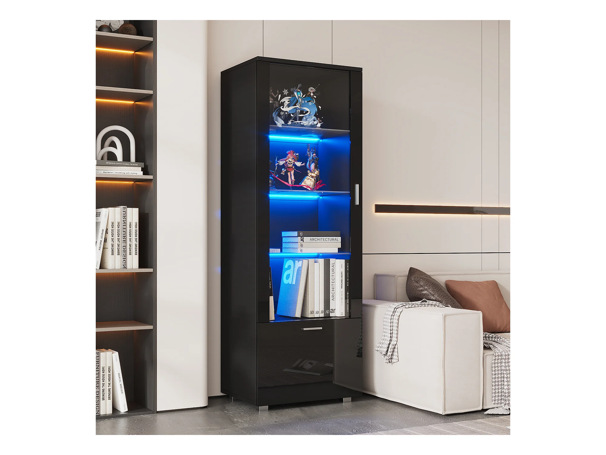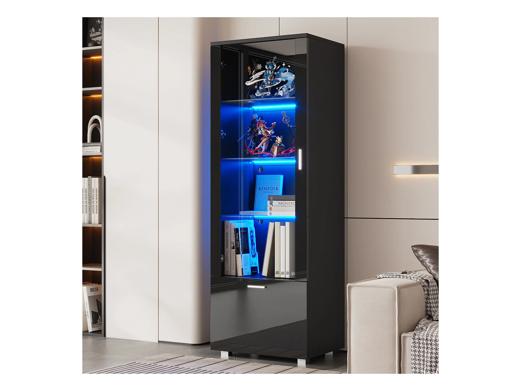 Vitrine haute brillance 55x38x170 cm - 1 tiroir et 4 portes - avec éclairage LED - Noir