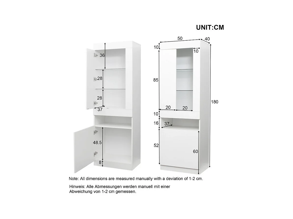 Vitrine haute autoportante - 119.5 x 40 x 180 cm - avec 4 tiroirs + Leds + 5 portes - MDF - blanc