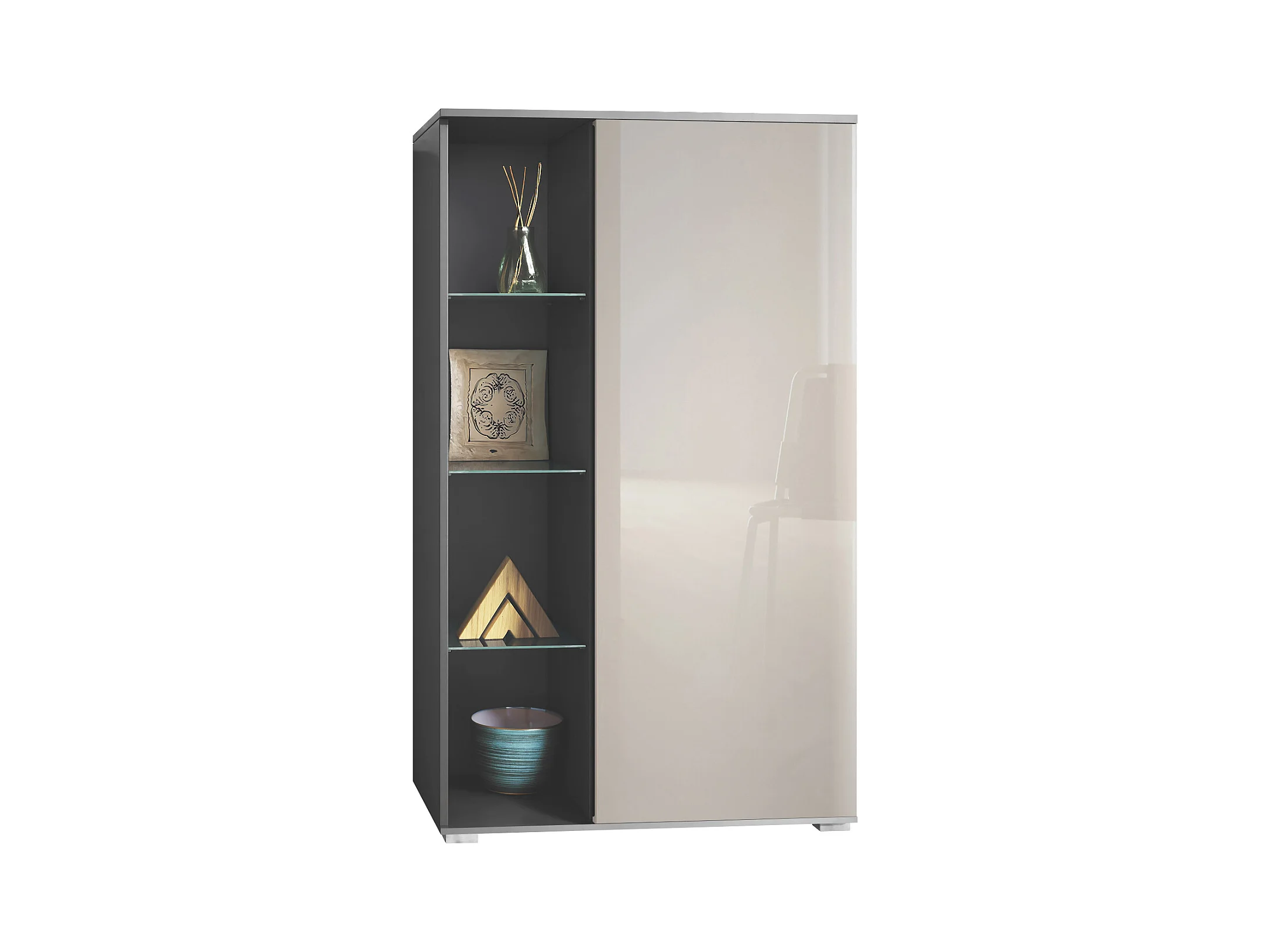 Vitrine Davos, vitrine sur pied avec 3 étagères en verre et 8 compartiments, anthracite mat/gris sable haute brillance (71,5 x 134 x 35 cm)