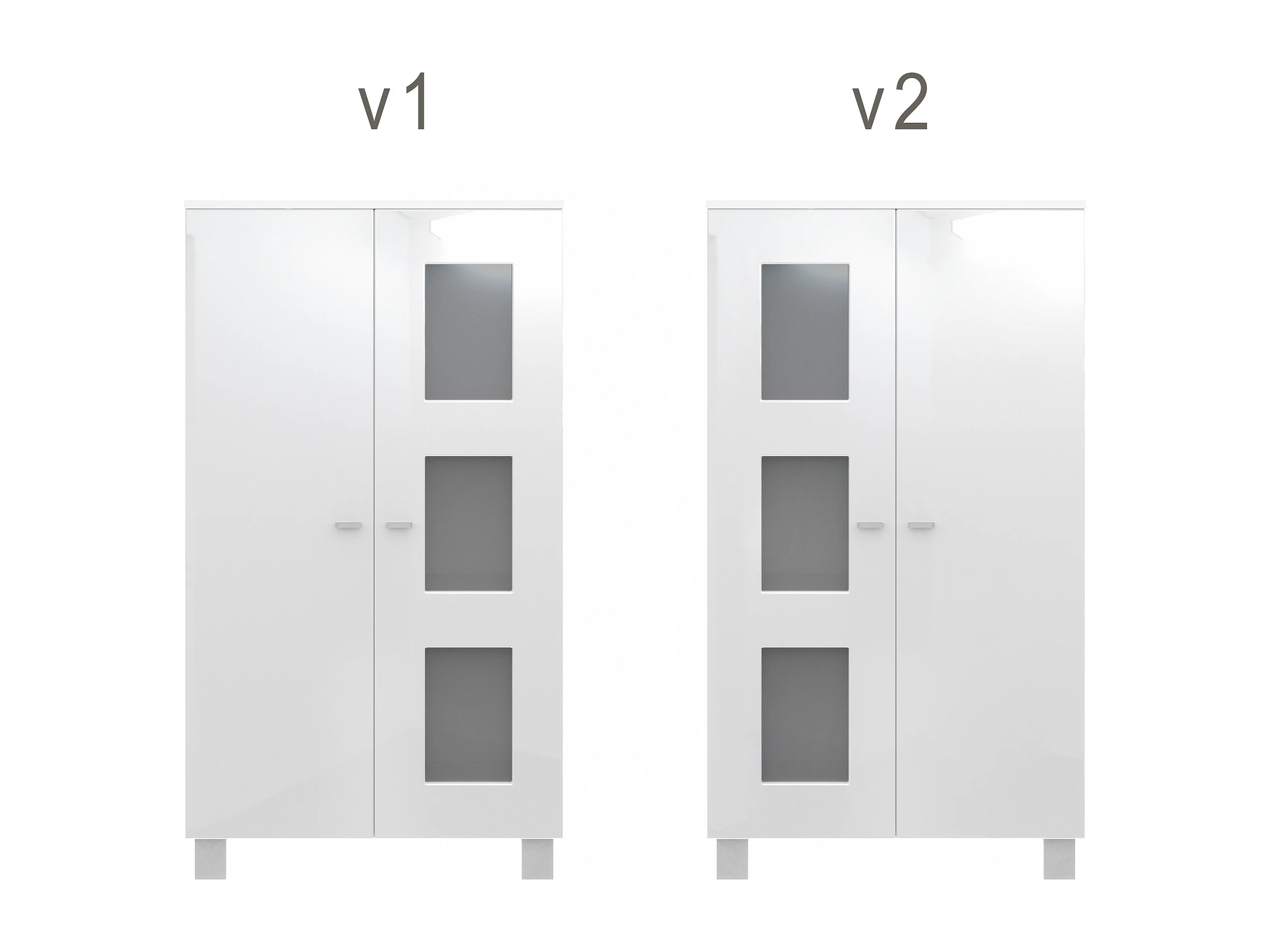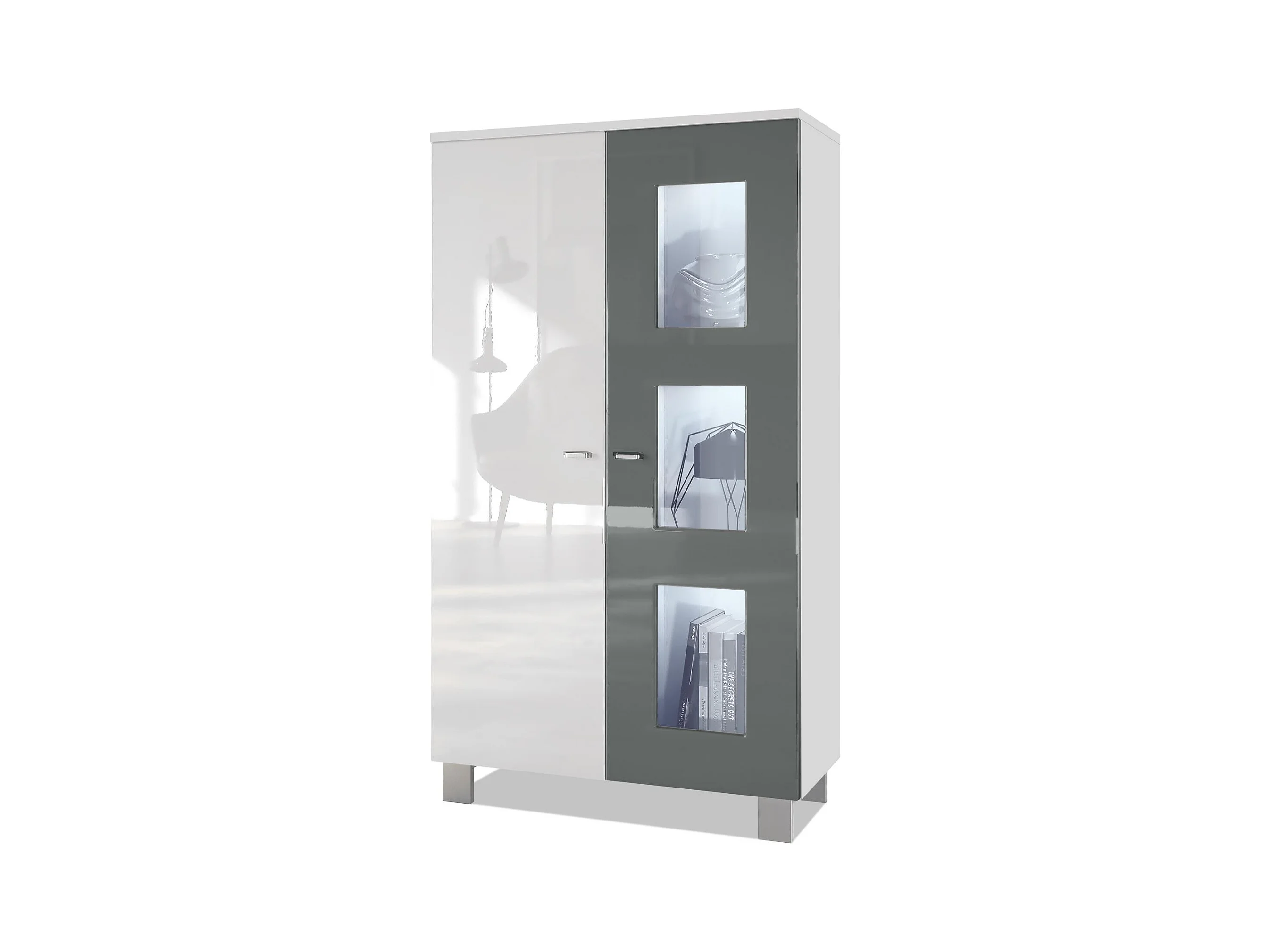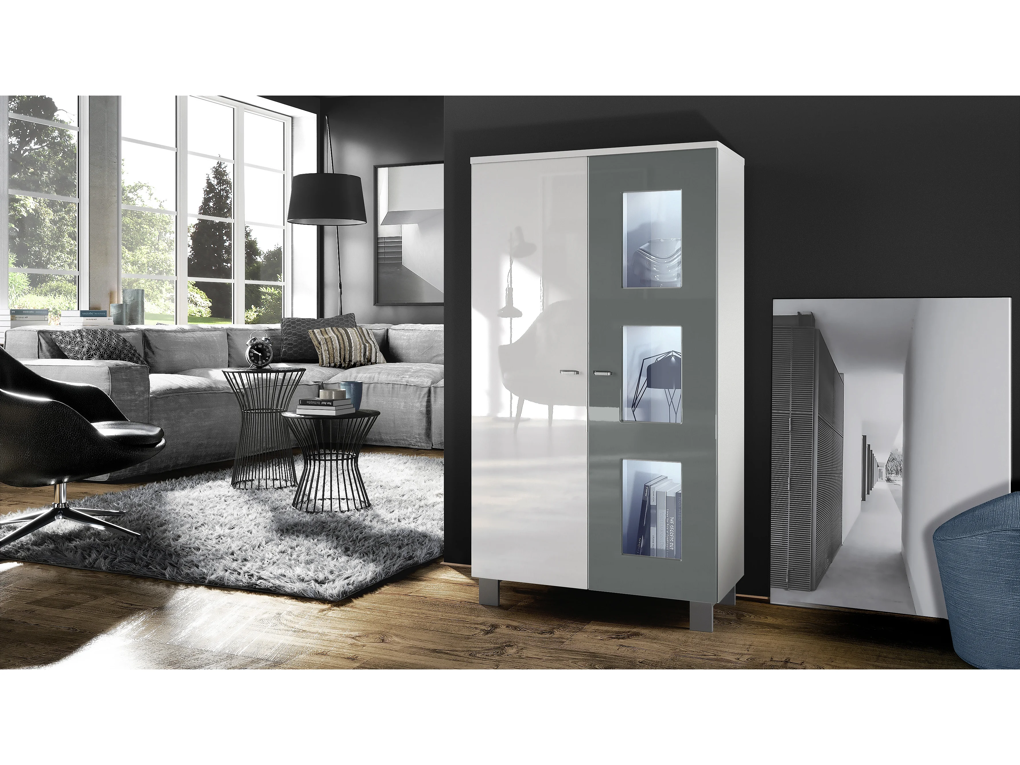Vitrine de salon Denjo, Vitrine sur pied avec 2 portes et 3 vitres, Blanc mat/Blanc brillant/Gris haute brillance, éclairage LED inclus (71 x 129 x 35 cm)
