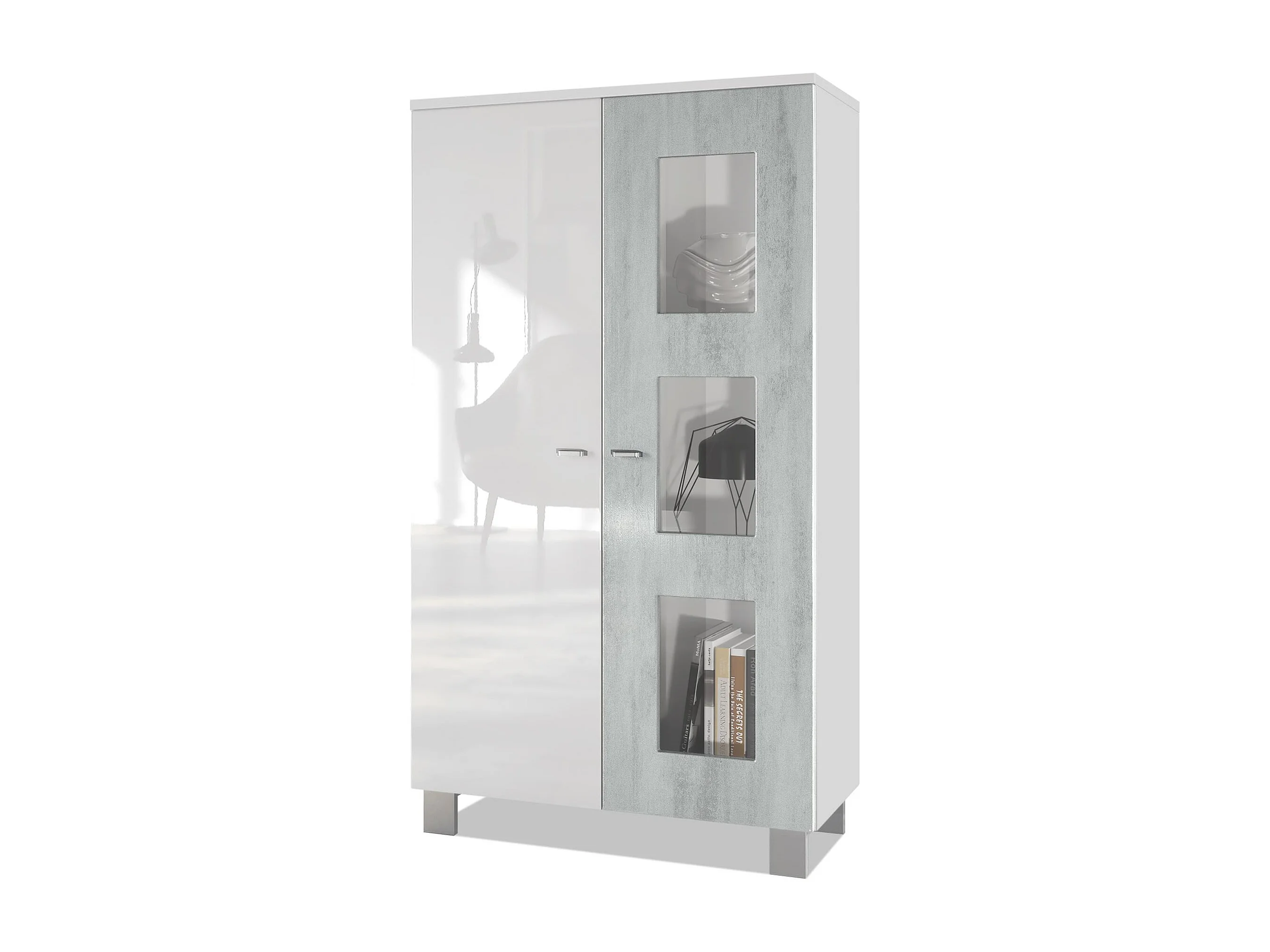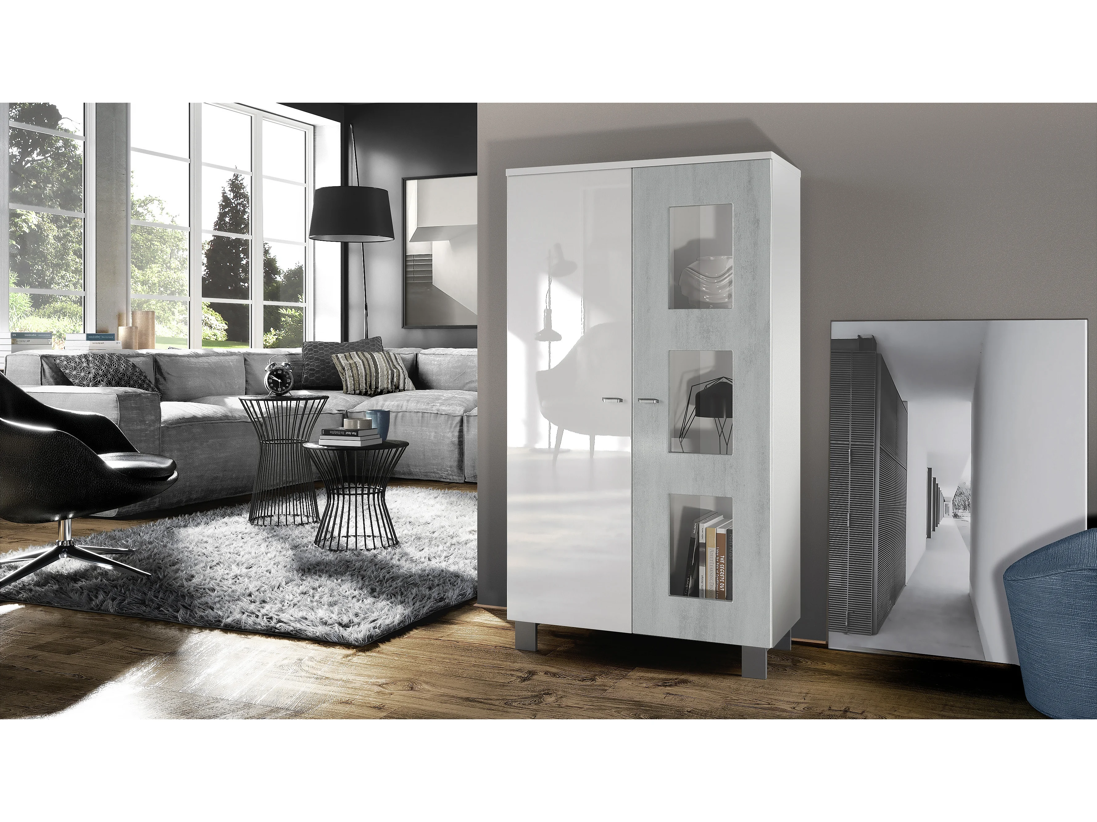 Vitrine de salon Denjo, Vitrine sur pied avec 2 portes et 3 vitres, Blanc mat/Blanc haute brillance/Aspect Béton Oxyde (71 x 129 x 35 cm)