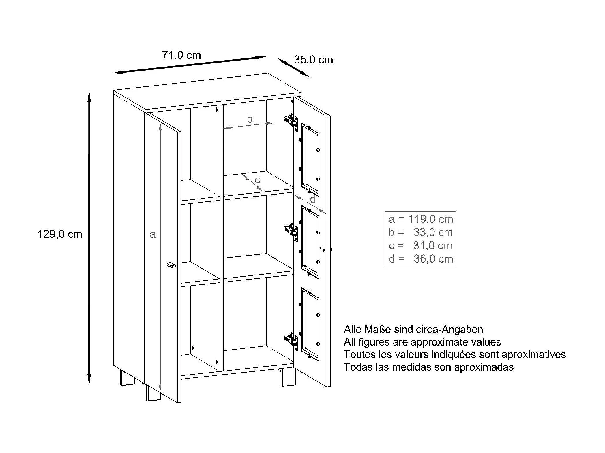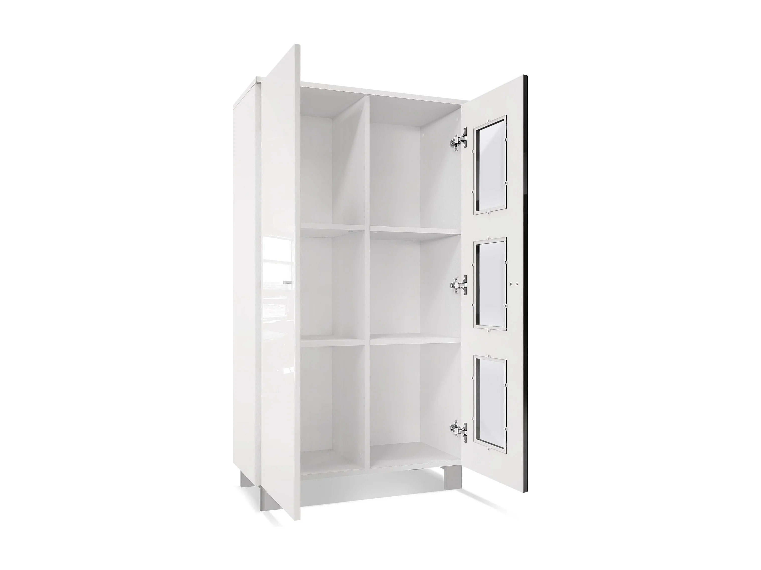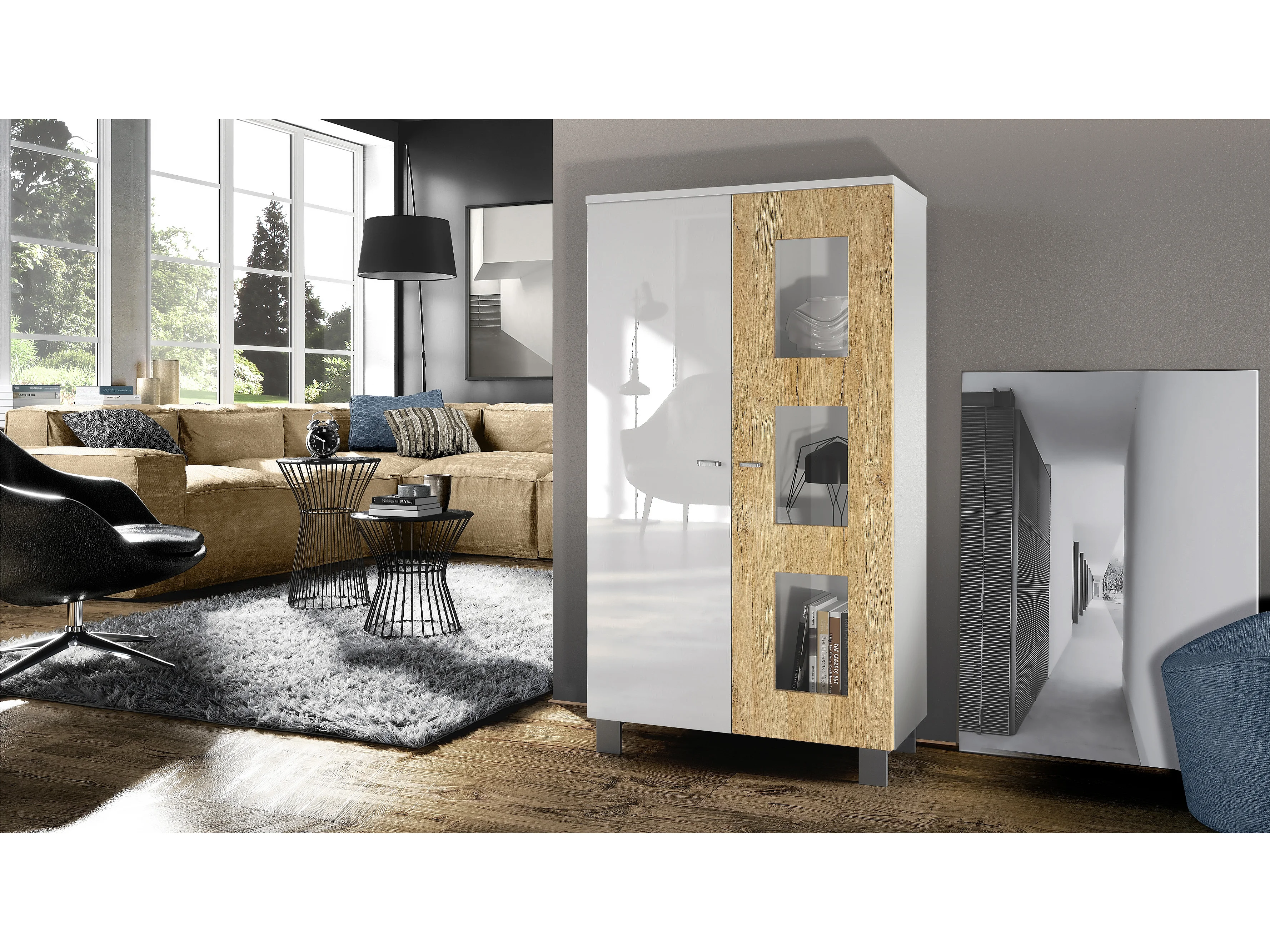 Vitrine de salon Denjo, Vitrine sur pied avec 2 portes et 3 vitres, Blanc mat/Blanc haute brillance/Chêne Nature (71 x 129 x 35 cm)