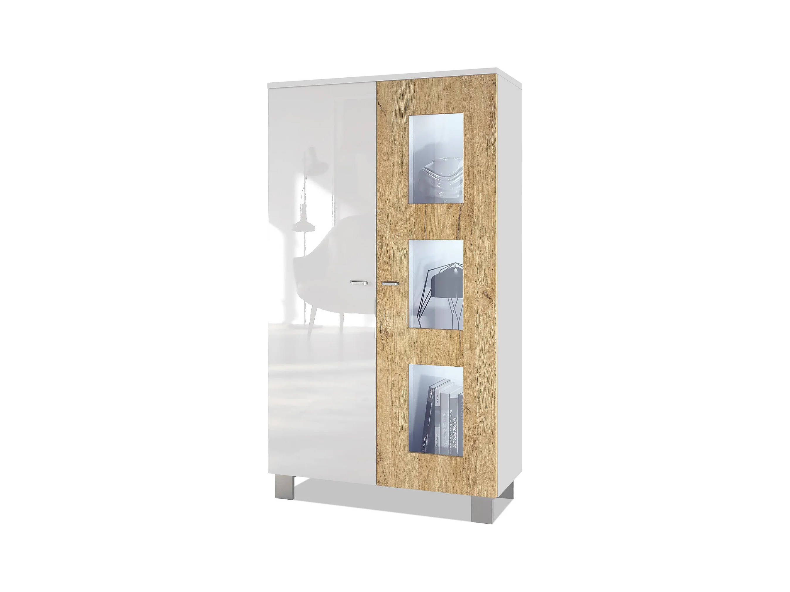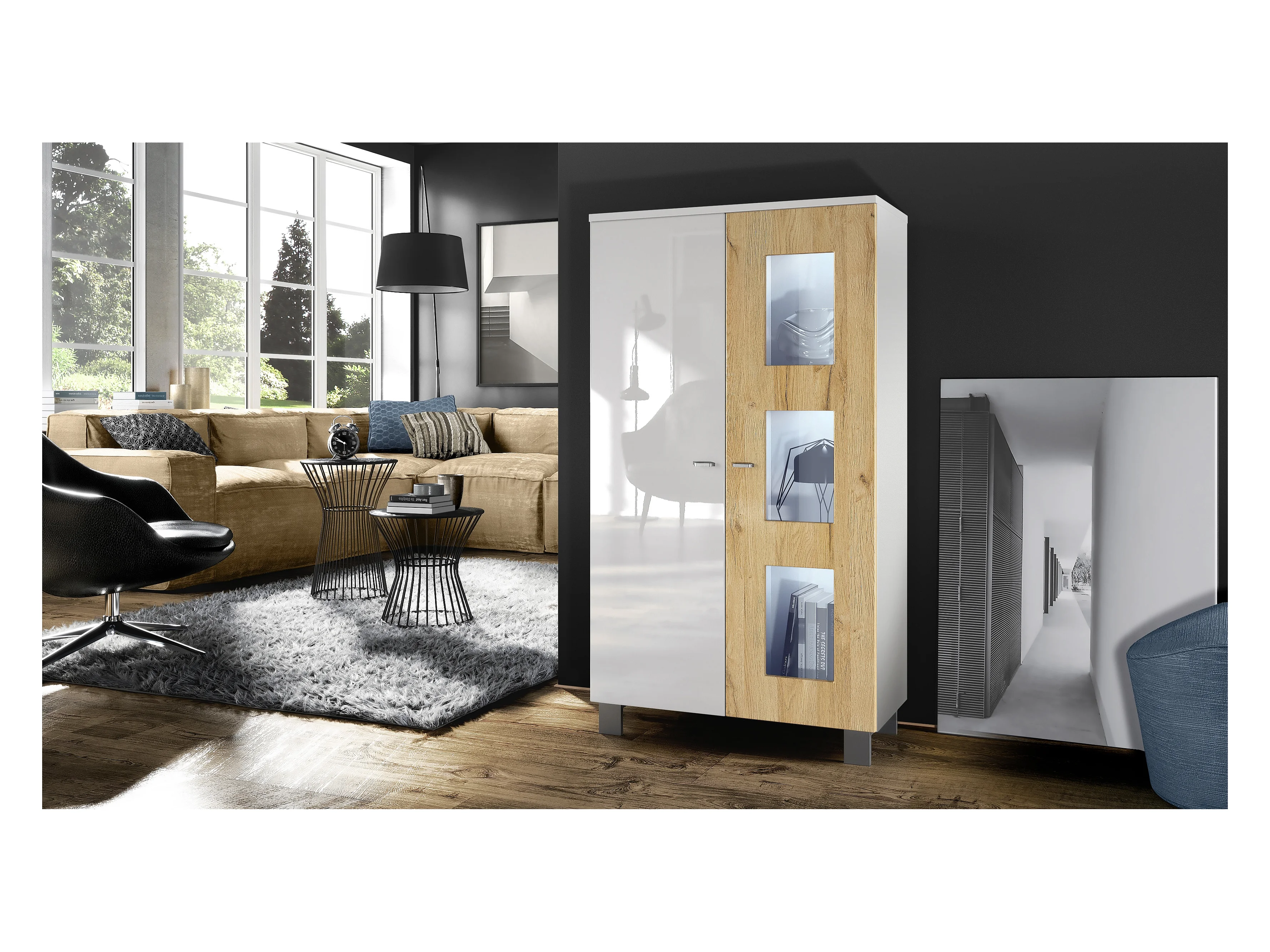 Vitrine de salon Denjo, Vitrine sur pied avec 2 portes et 3 vitres, Blanc mat/Blanc haute brillance/Chêne Nature, éclairage LED inclus (71 x 129 x 35 cm)