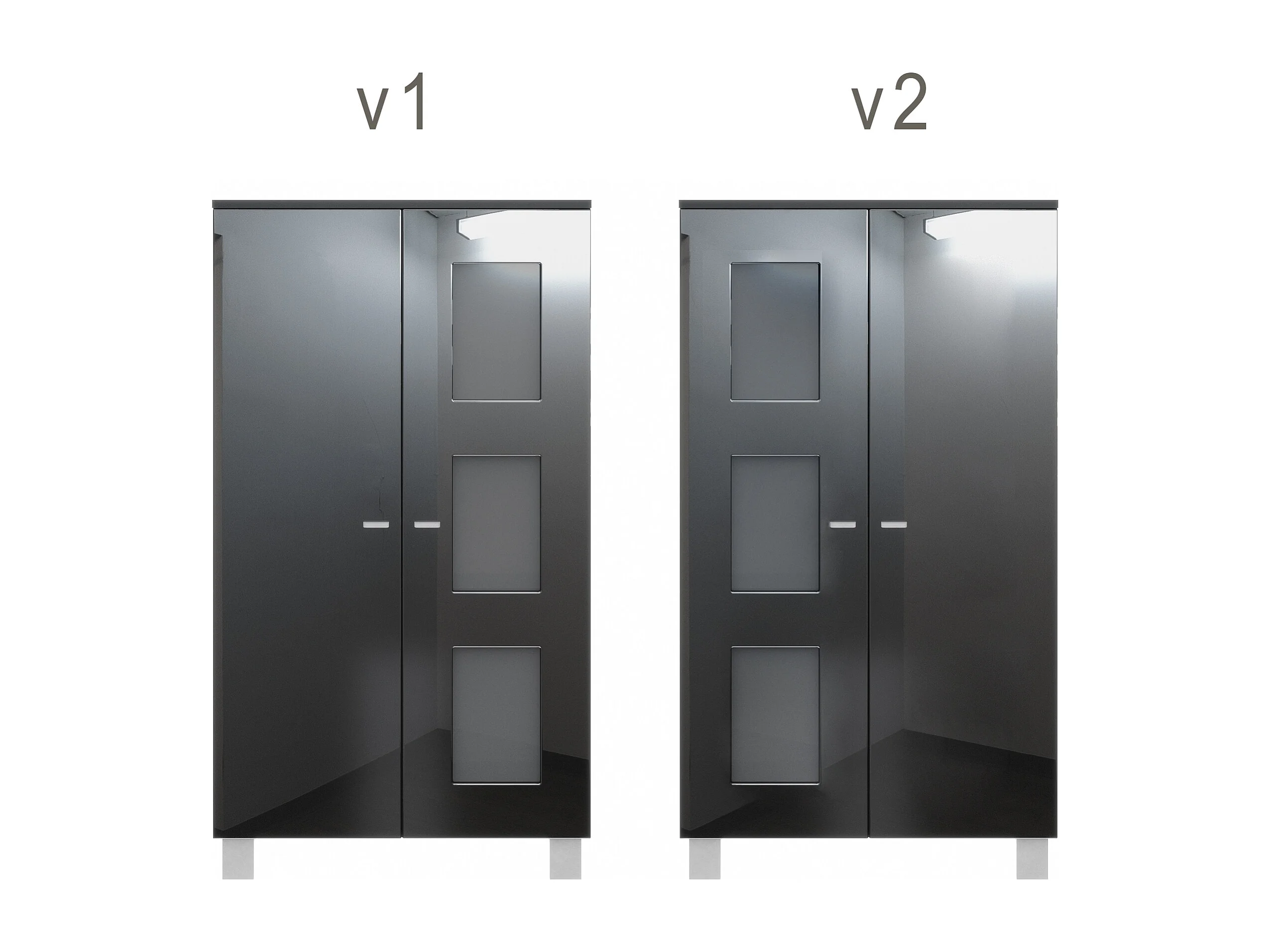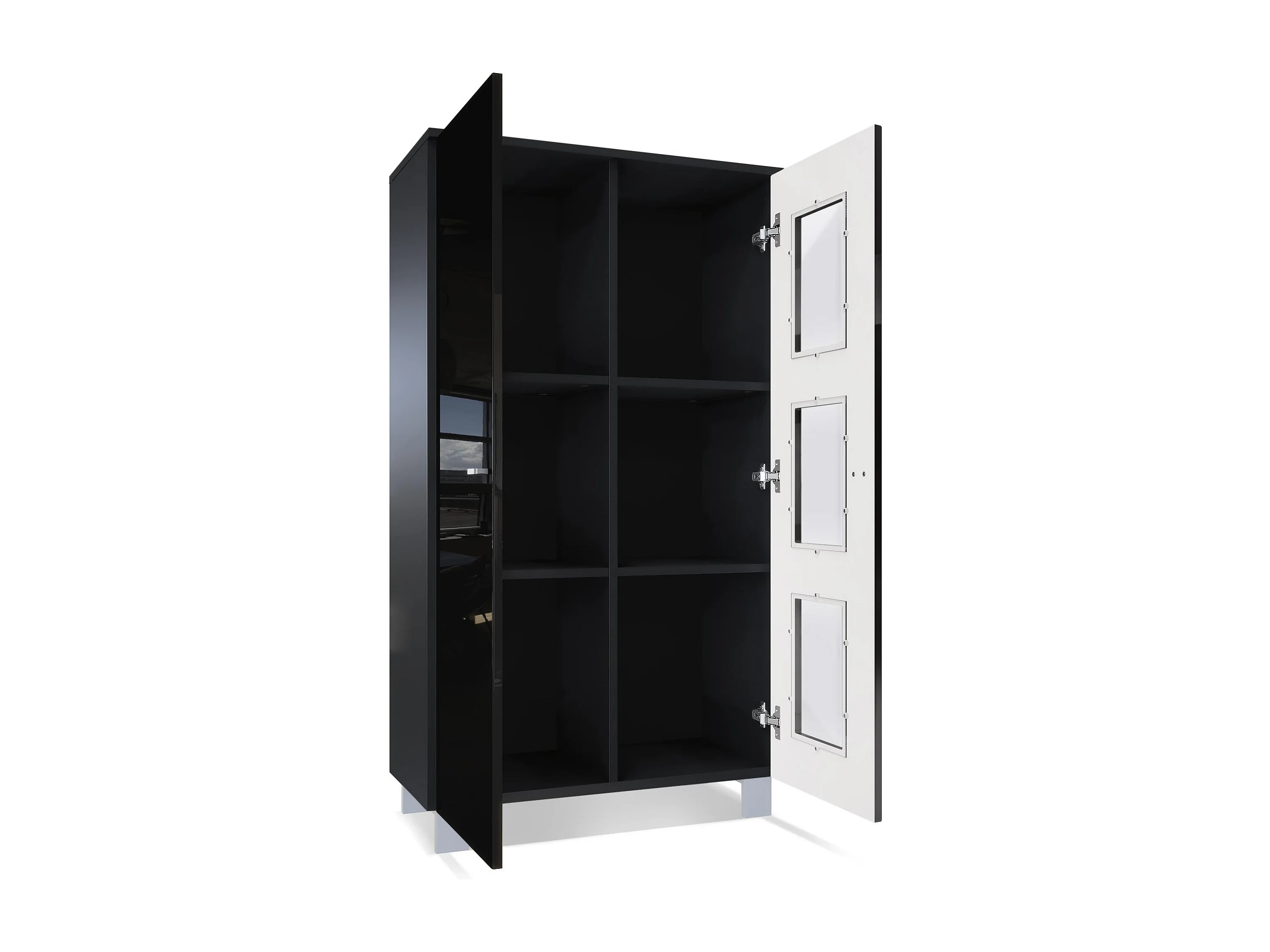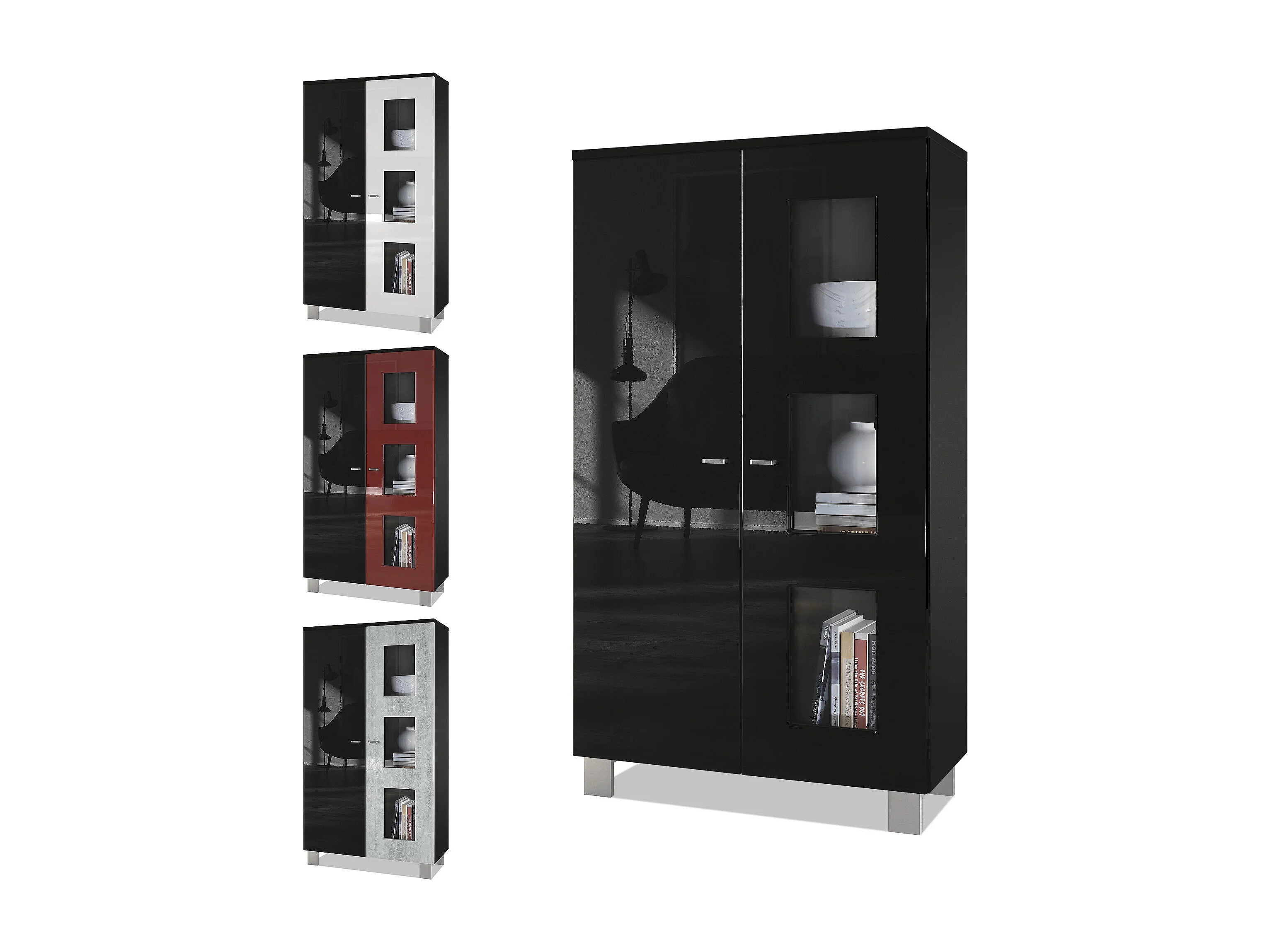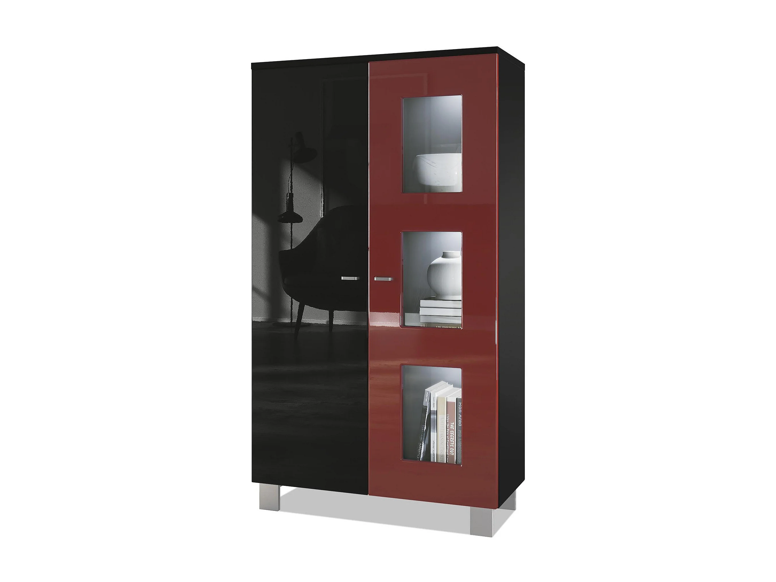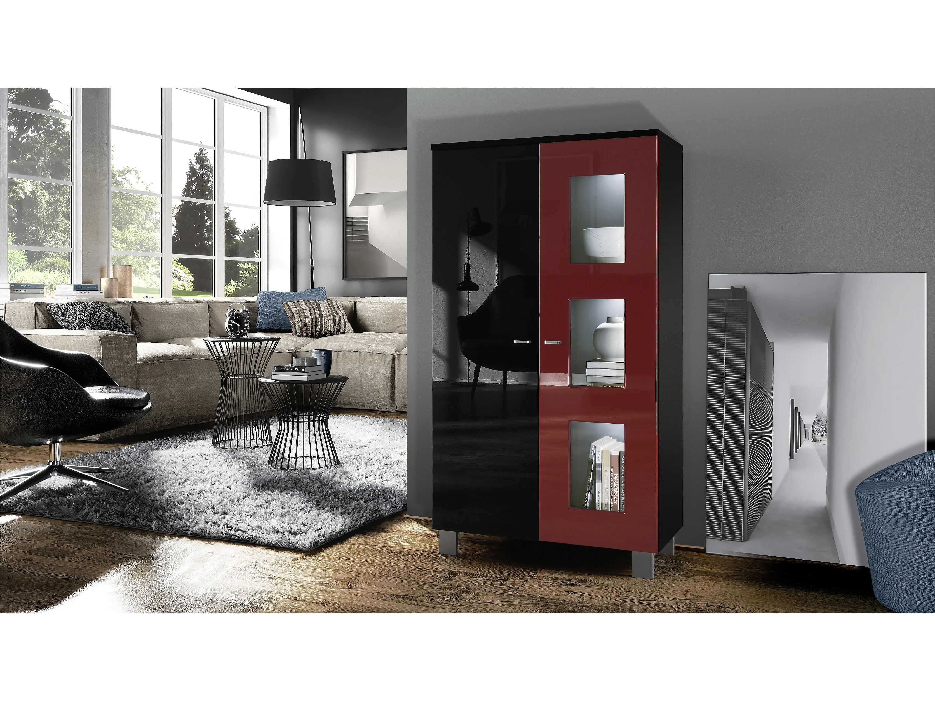 Vitrine de salon Denjo, Vitrine sur pied avec 2 portes et 3 vitres, Noir mat/Noir brillant/Bordeaux brillant, éclairage LED inclus (71 x 129 x 35 cm)