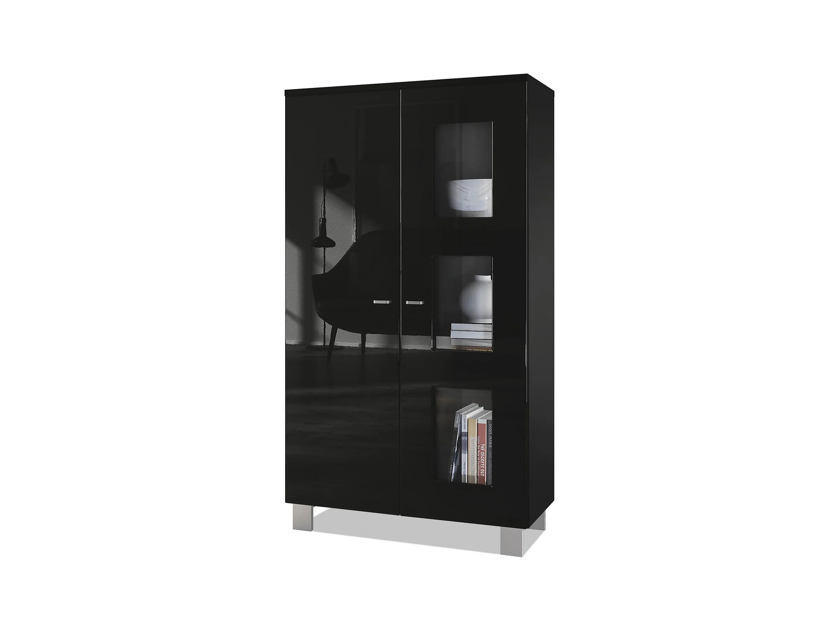 Vitrine de salon Denjo, Vitrine sur pied avec 2 portes et 3 vitres, Noir mat/Noir haute brillance (71 x 129 x 35 cm)