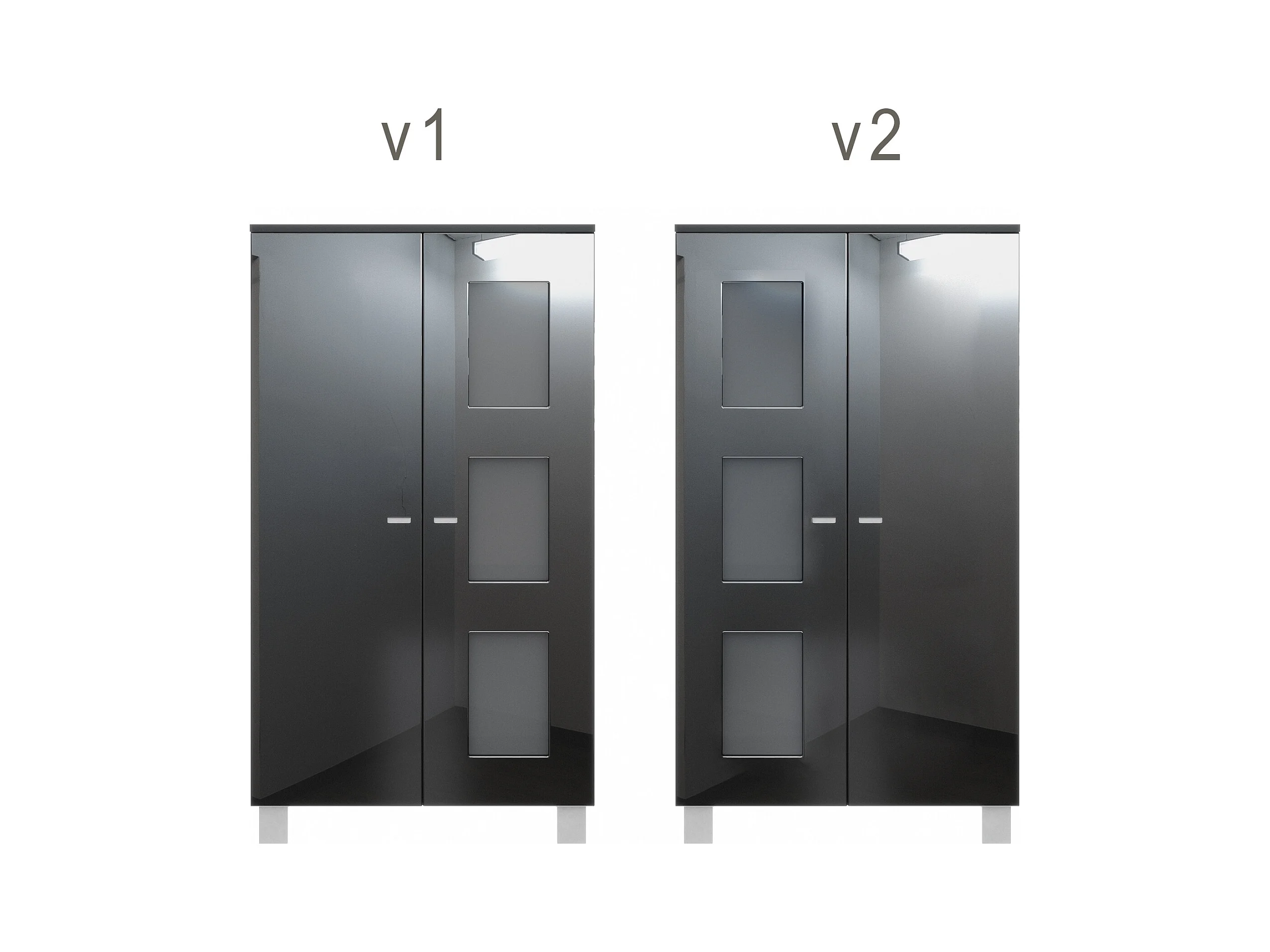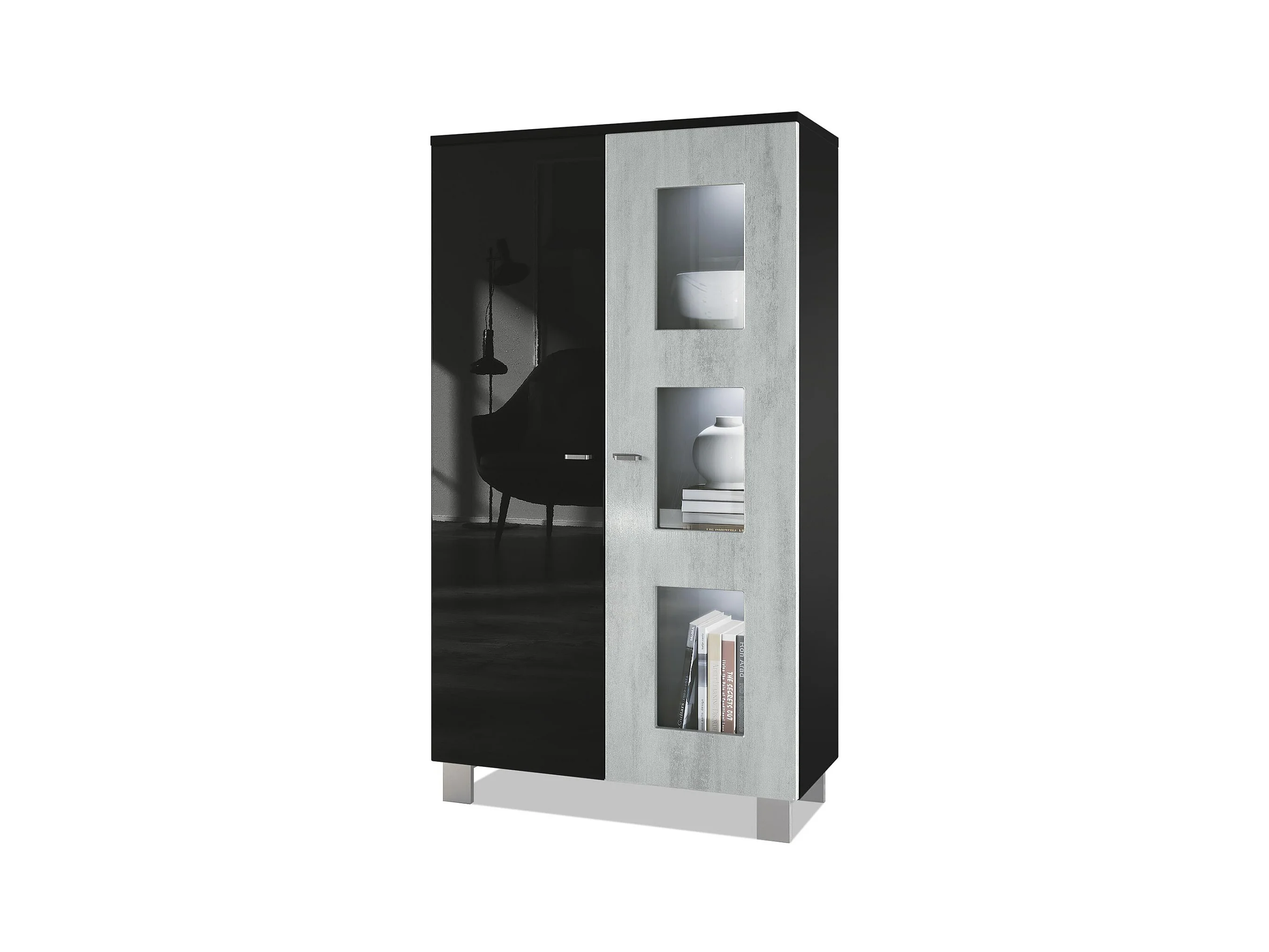 Vitrine de salon Denjo, Vitrine sur pied avec 2 portes et 3 vitres, Noir mat/Noir haute brillance/Aspect Béton Oxyde, éclairage LED inclus (71 x 129 x 35 cm)