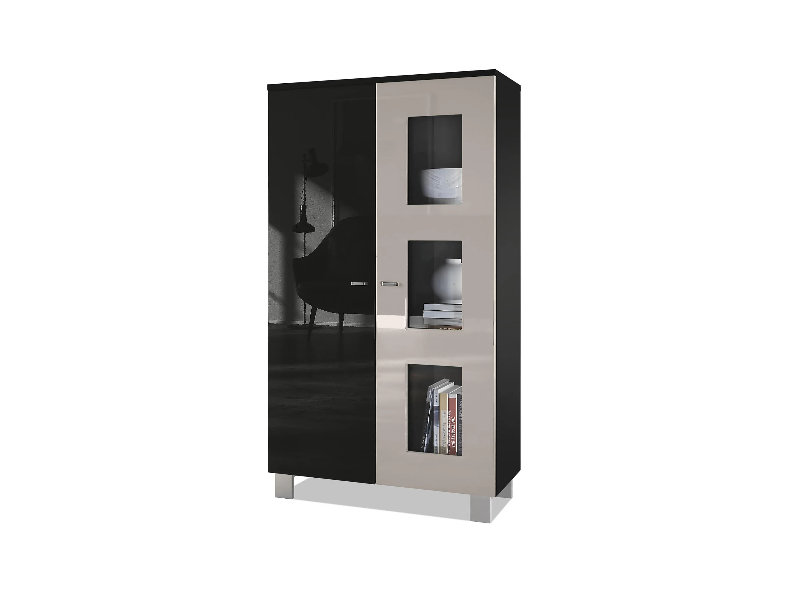 Vitrine de salon Denjo, Vitrine sur pied avec 2 portes et 3 vitres, Noir mat/Noir haute brillance/Gris sable haute brillance (71 x 129 x 35 cm)