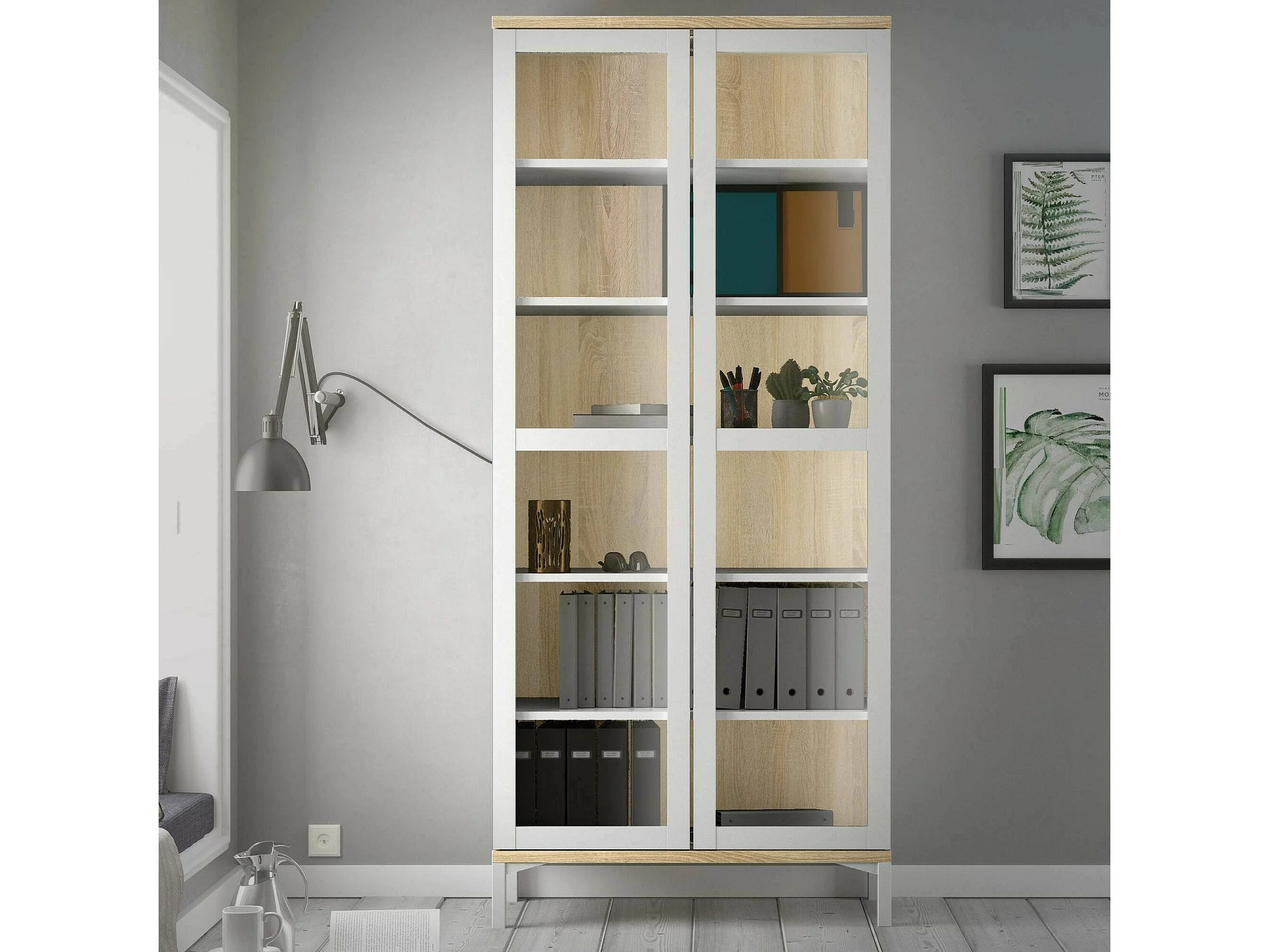 Vitrine Dvecchi, Buffet d'exposition, Vitrine polyvalente, Buffet de salon, 89x36 h203 cm, Blanc et chêne