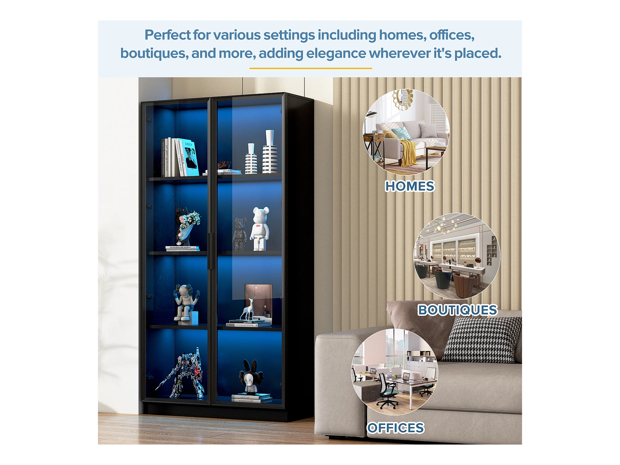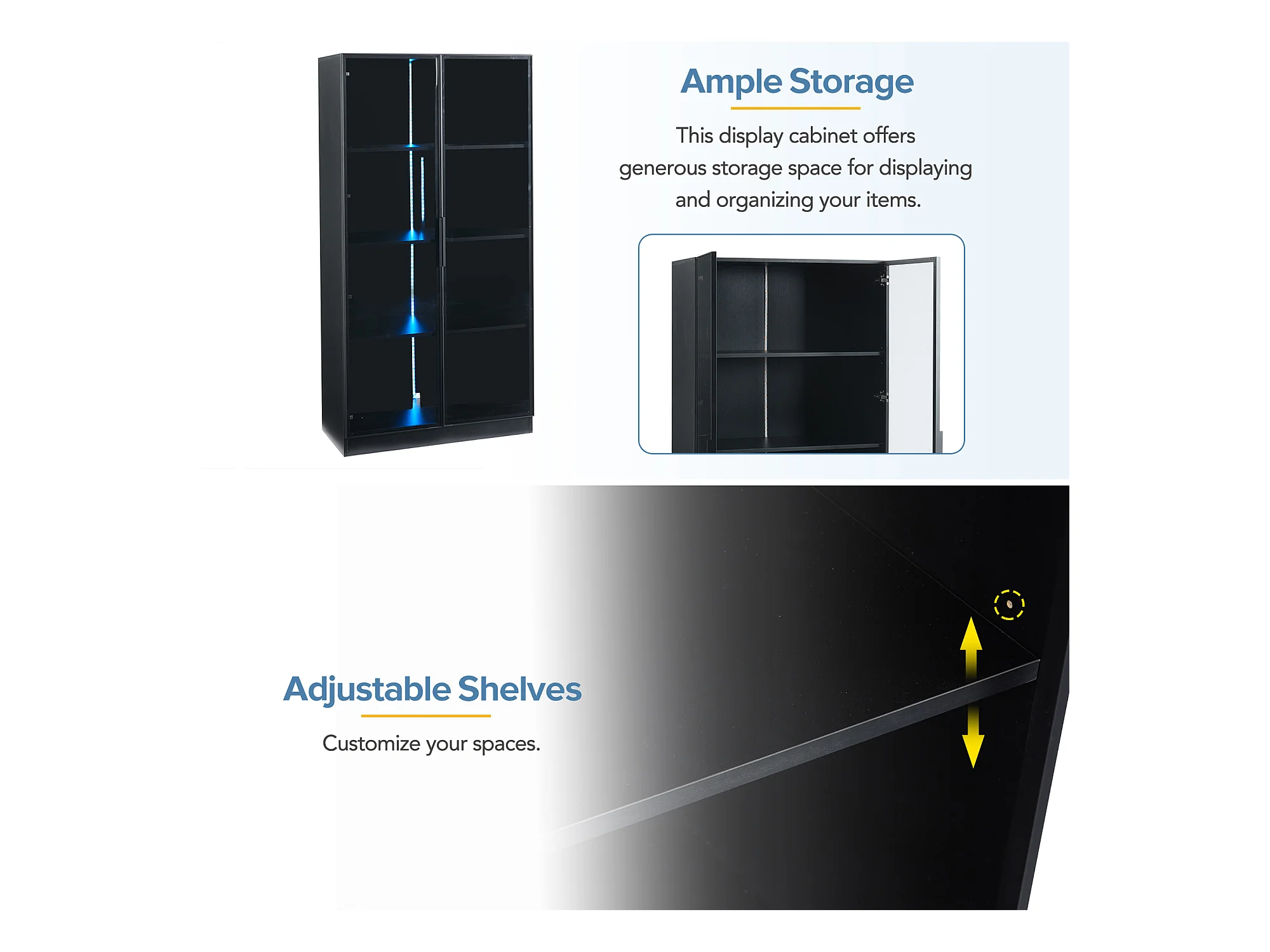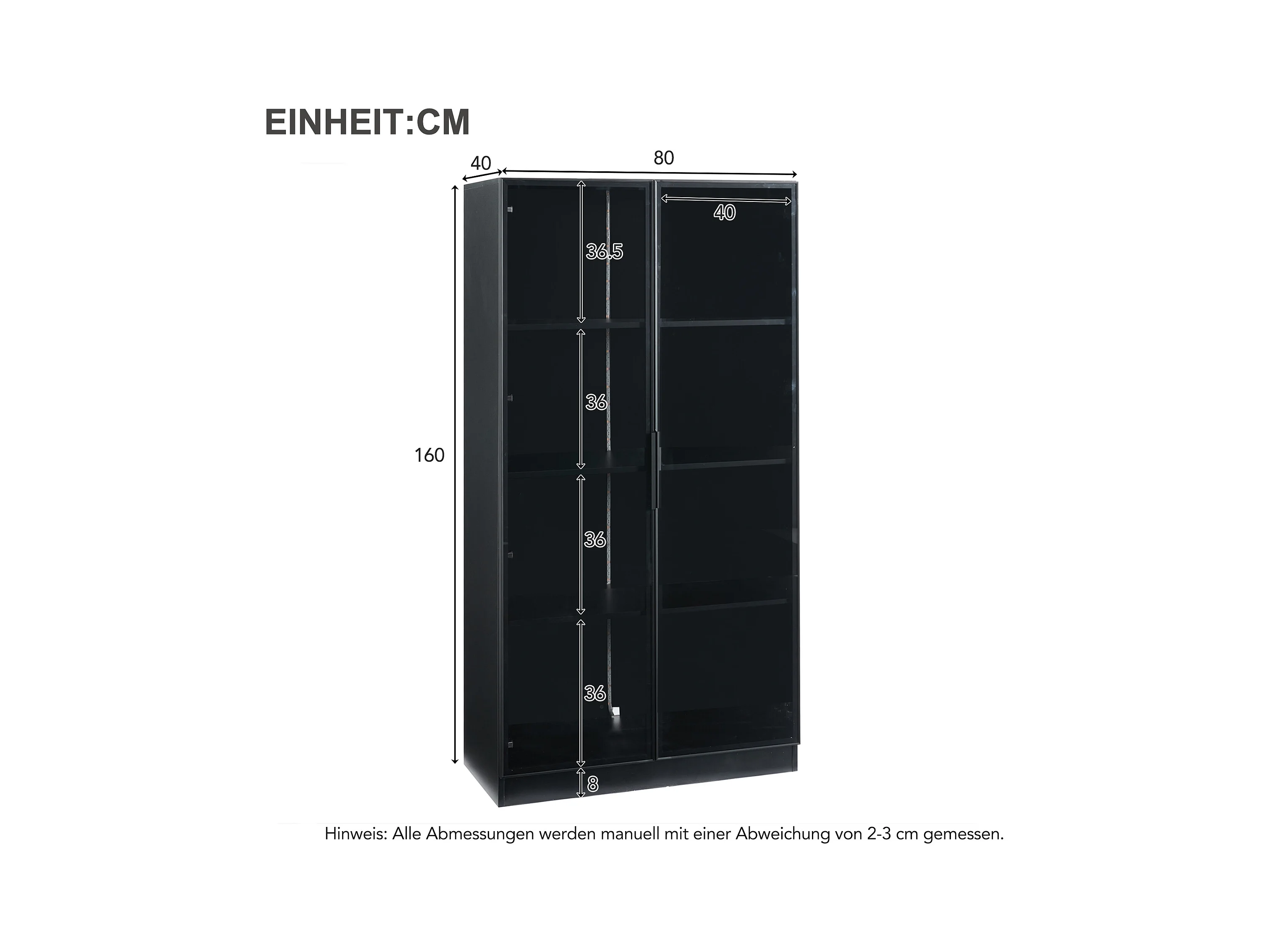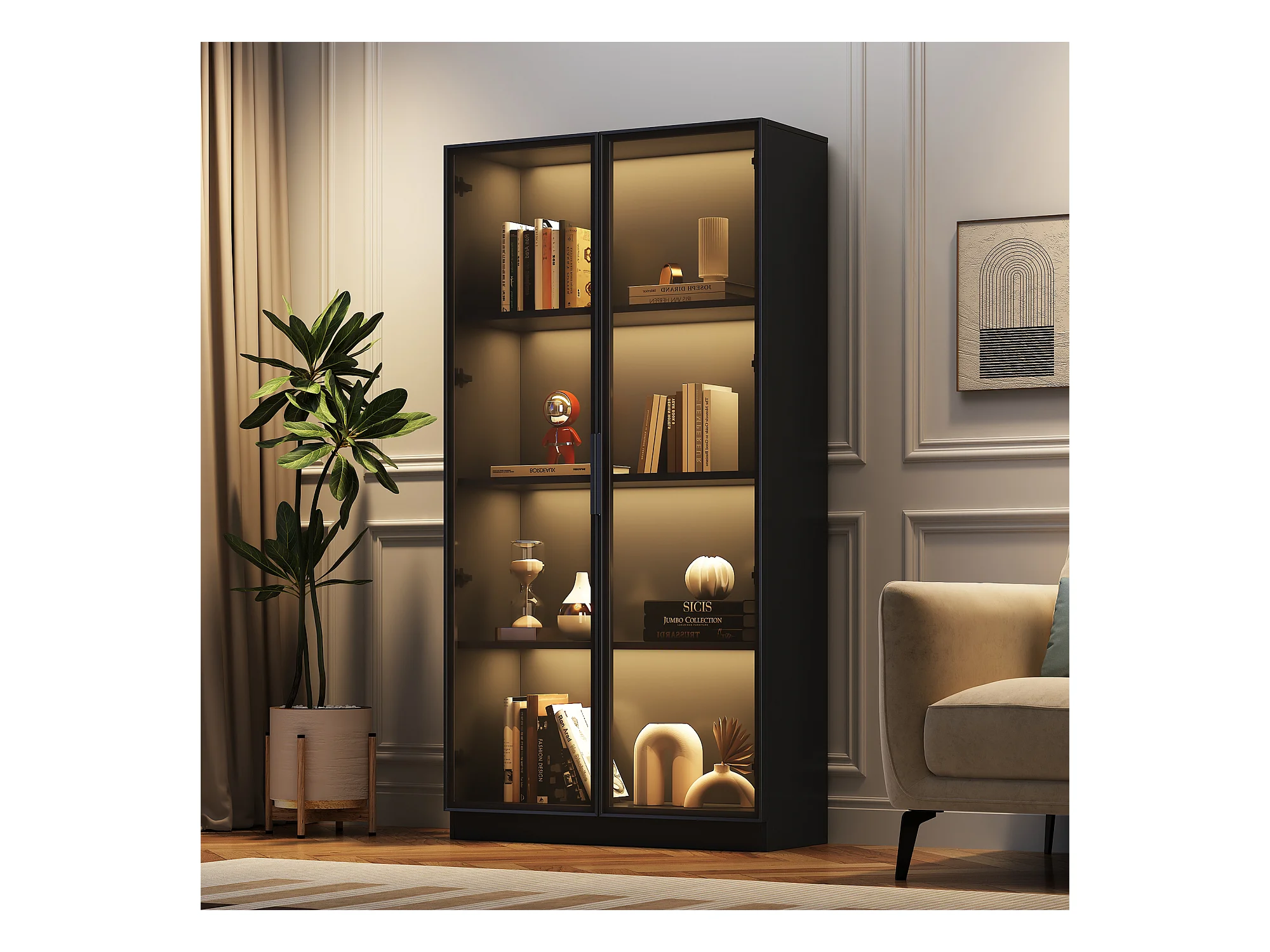 Vitrine en verre - 80 x 40 x 160 cm - avec Leds + rangement à 2 portes avec étagères mobiles - aggloméré - noir